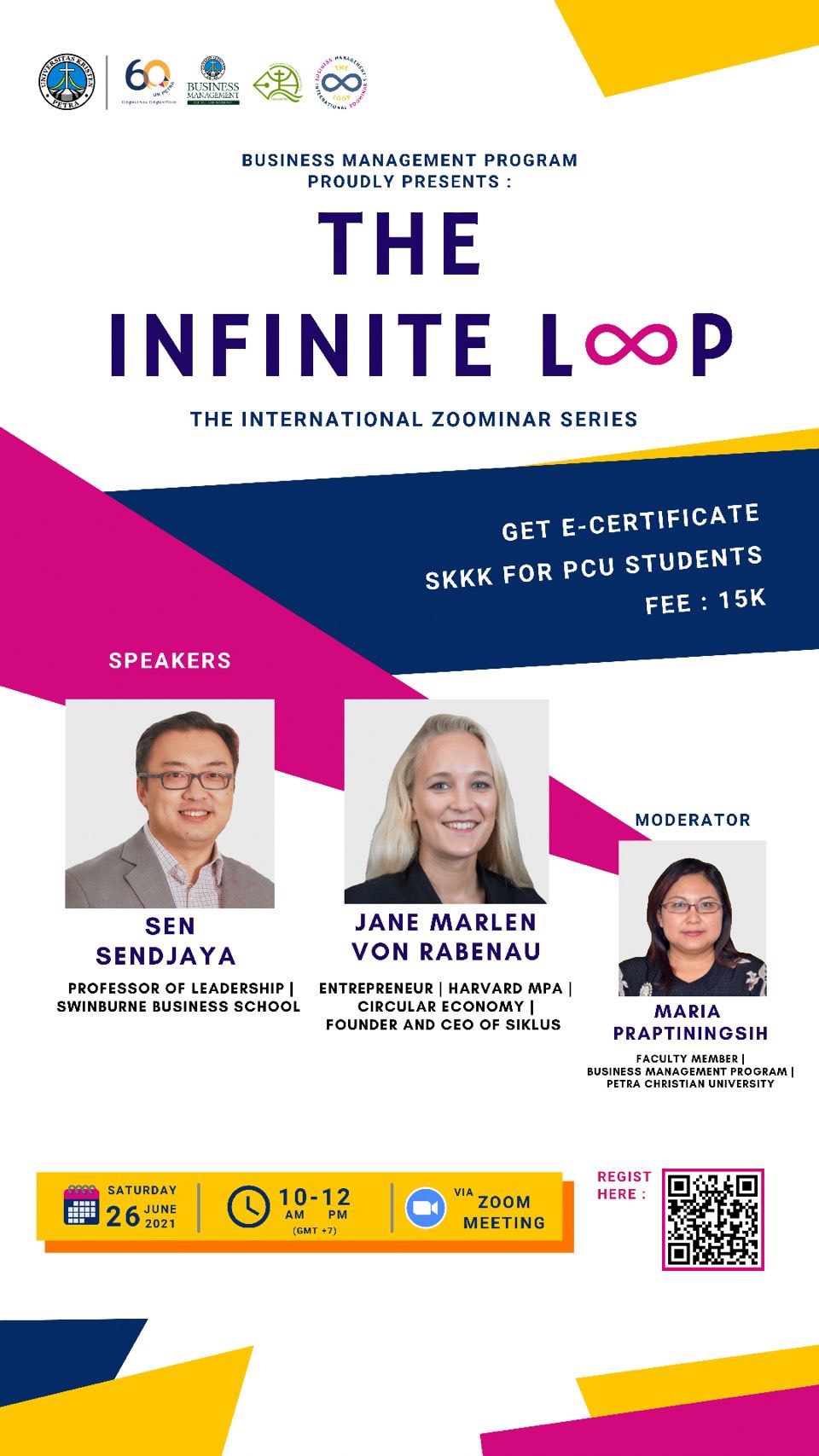 Program Manajemen Bisnis Universitas Kristen Petra mengadakan seminar internasional secara online dengan tema "the infinity loop." Diadakan pada tanggal 26 Juni 2021 jam 10.00 WIB. Dengan menggunakan aplikasi Zoom meeting, dengan narasumber Sen Sendjaya dan Jane Marlen Von Rabenau, dan sebagai moderator Maria Praptiningsih.