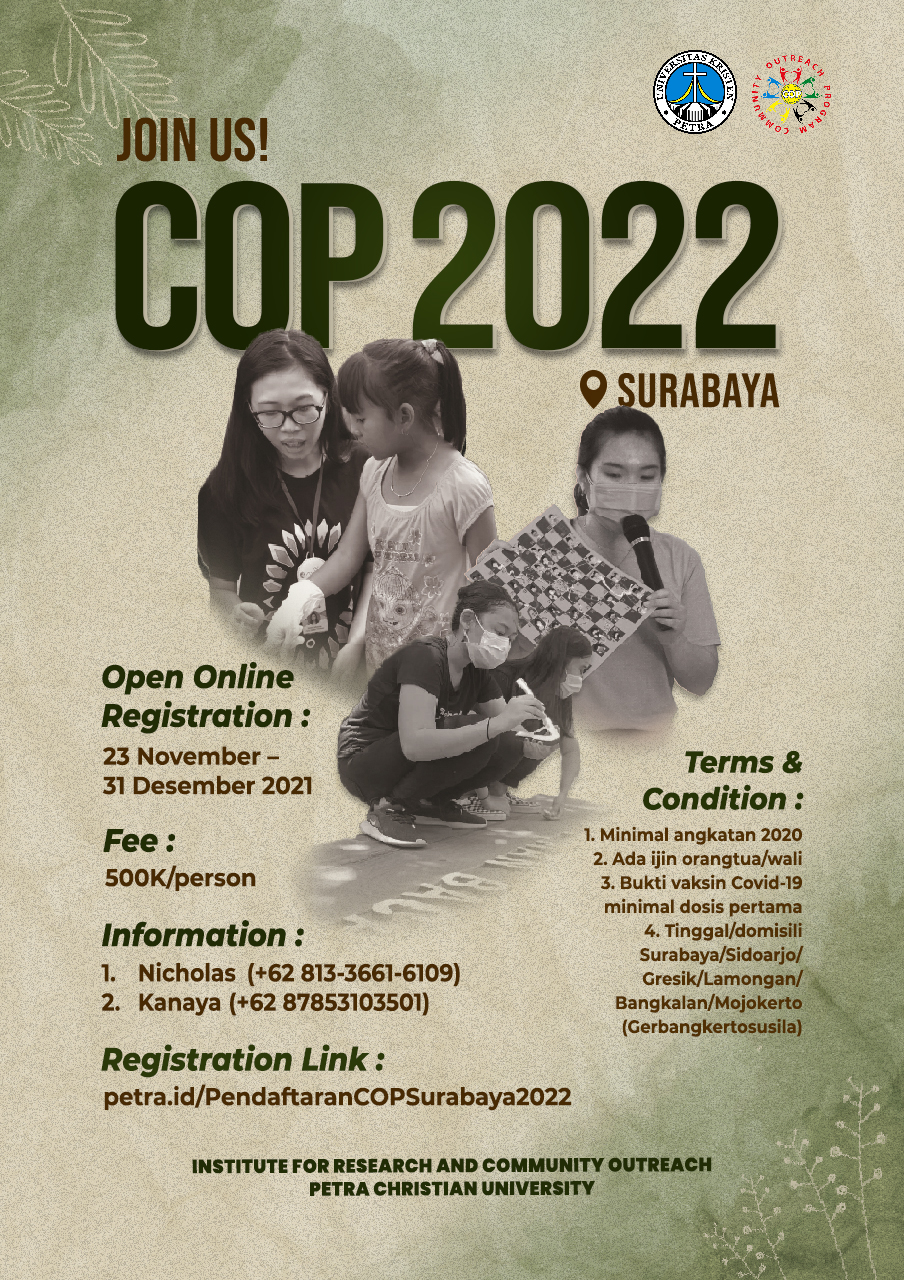 Universitas Kristen Petra Surabaya pada tahun 2022 kembali mengadakan kegiatan COP (Community Outreach Program).Untuk pendaftaran dibuka dari tanggal 23 November hingga 31 Desember 2021 dengan biaya 500 ribu per orang. Untuk lokasi COP 2022 ini diutamakan di wilayah Surabaya dan sekitarnya. Info pendaftaran silahkan lihat di link: petra.id/PendaftaranCOPSurabaya2022.