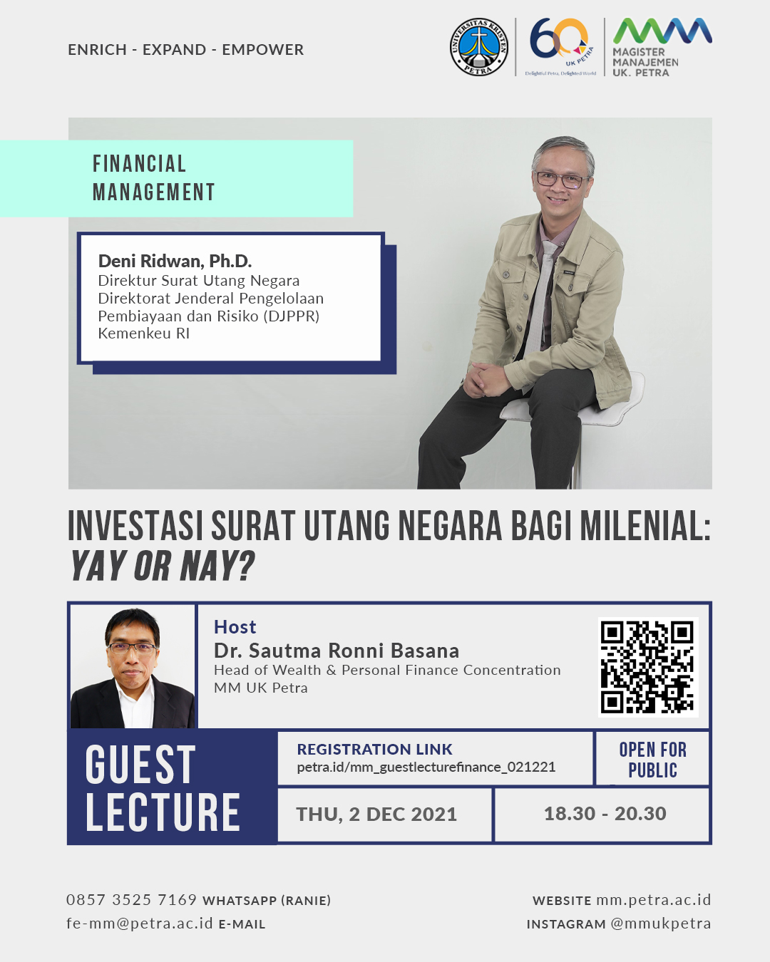 Progra Studi Magister Manajemen Universitas Kristen Petra Surabaya pada tanggal 02 Desember 2021 jam 18.30 - 20.30 WIB, mengadakan acara kuliah tamu financial management: investasi surat utang negara bagi milenial, yay or nay? Sebagai narasumber dalam acara ini yaitu bapak Deni Ridwan Ph.D. dan sebagai host bapak Dr. Sautma Ronni Basana.