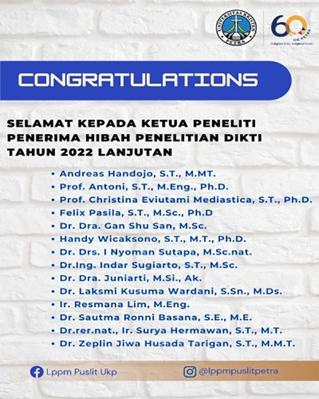 Universitas Kristen Petra melalui LPPM, mengucapkan selamat kepada para dosen yang menerima Hibah Penelitian DIKTI Tahun 2022 yang berlanjut penelitiannya, yang berjumlah 14 (empat belas) peneliti.