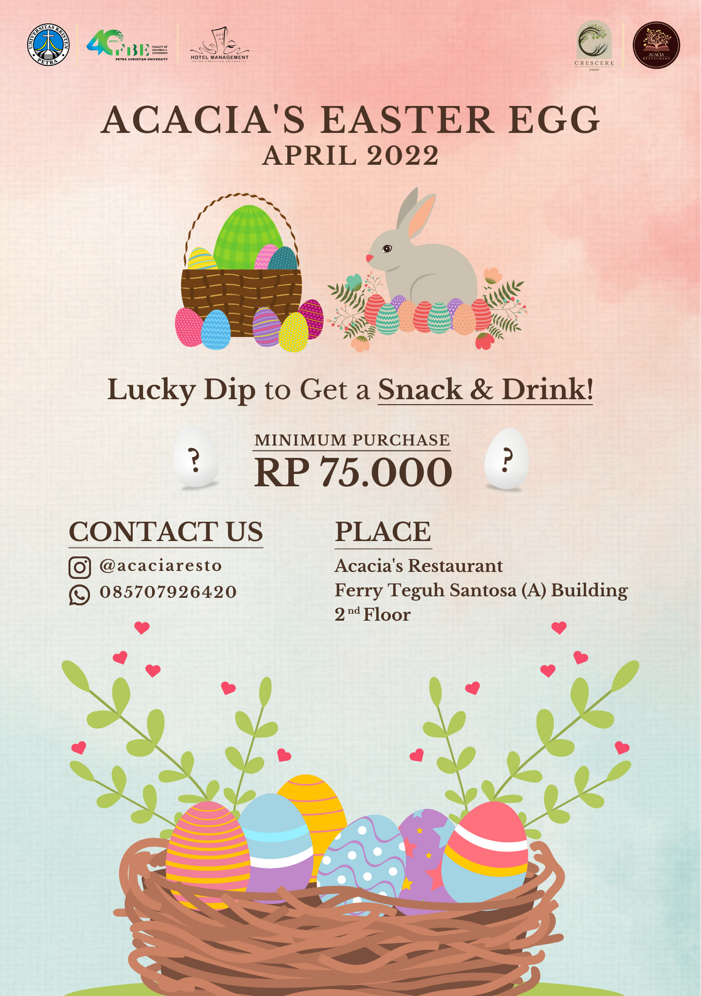 Didalam rangka memeriahkan hari Raya Paskah tahun 2022, Restaurant Acacia yang dikelola oleh mahasiswa Perhotelan UK Petra, mengadakan doorprize, bagi pembeli dengan minimum pembayaran Rp. 75.000., Restaurant berada di lantai 2 gedung Ferry Teguh Santoso.