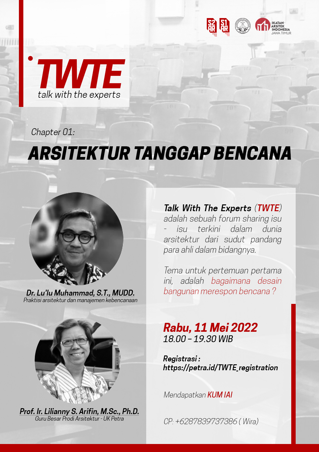 Rabu, 11 Mei 2022 jam 18.00 - 19.30 WIB Program Studi Teknik Arsitektur UK Petra Mengadakan talkshow dengan tema TWTE (Talk With The Experts) chapter 1: arsitektur tanggap bencana. Dengan narasumber Dr. Lulu Muhammad, S.T. dan Prof. Ir. Lilianny S. Arifin. Info pendaftaran bisa dilihat di petra.id/TWTE_registration