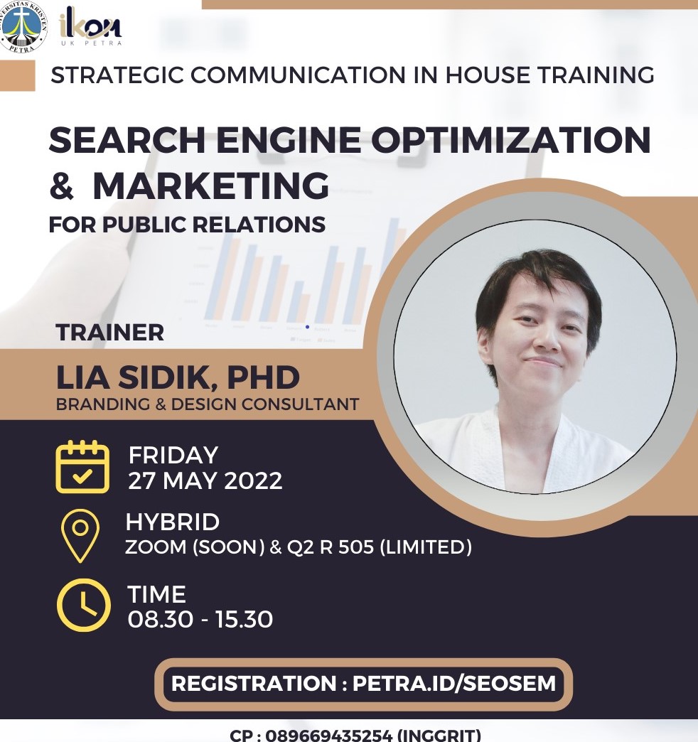 Pada tanggal 27 Mei 2022 Program Studi Ilmu Komunikasi UK Petra mengadakan training. Kegiatan ini bermanfaat untuk pengelola web baik untuk organisasi yang berorientasi profit maupun sosial. SEO dan SEM merupakan bagian dari strategi pengelolaan web yang dapat membantu organisasi mencapai tujuannya. Adapun narasumbernya yaitu Lia Sidik, Ph.D.