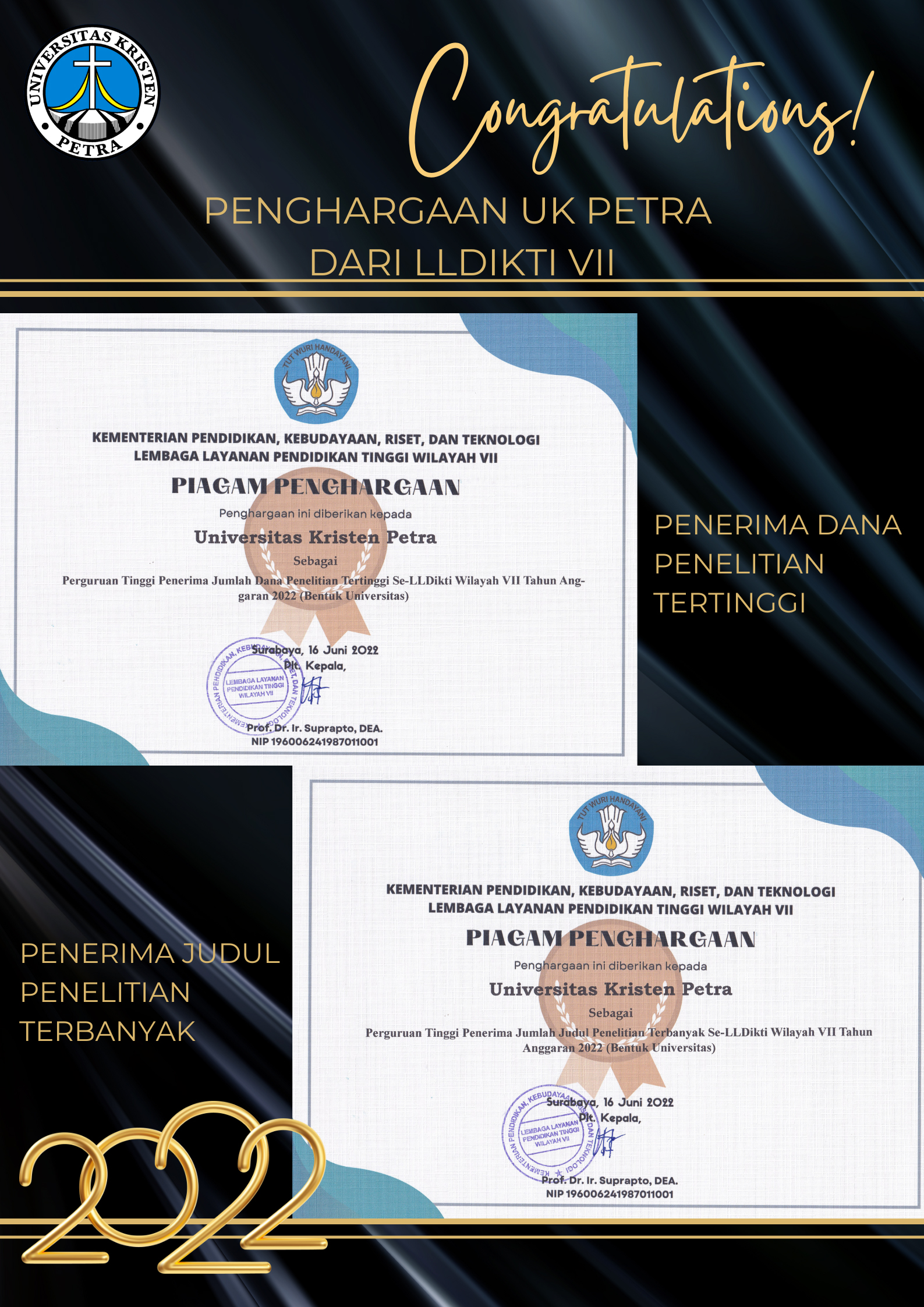 Penghargaan untuk UK Petra dari LLDIKTI VII tahun 2022 dalam rangka pencapaian penelitian dan pengabdian masyarakat.