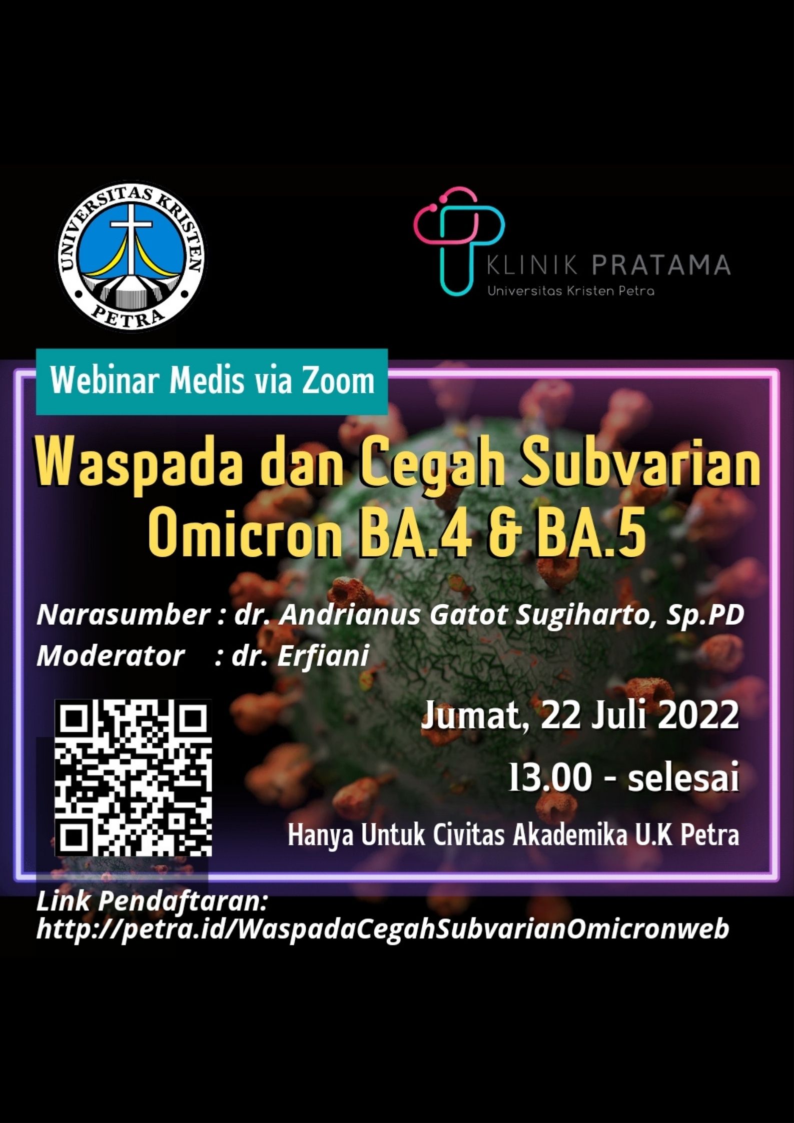 Untuk menambah pengetahuan dan kewaspadaan civitas UK Petra tentang varian baru virus Omicron, Poliklinik UK Petra mengadakan webinar: Waspada dan cegah subvarian Omicron BA.4 dan BA.5. Acara ini digelar pada 22 Juli 2022 jam 13.00 sampai selesai. Dengan menghadirkan narasumber dr. Andrianus Gatot Sugiharto, Sp.PD.