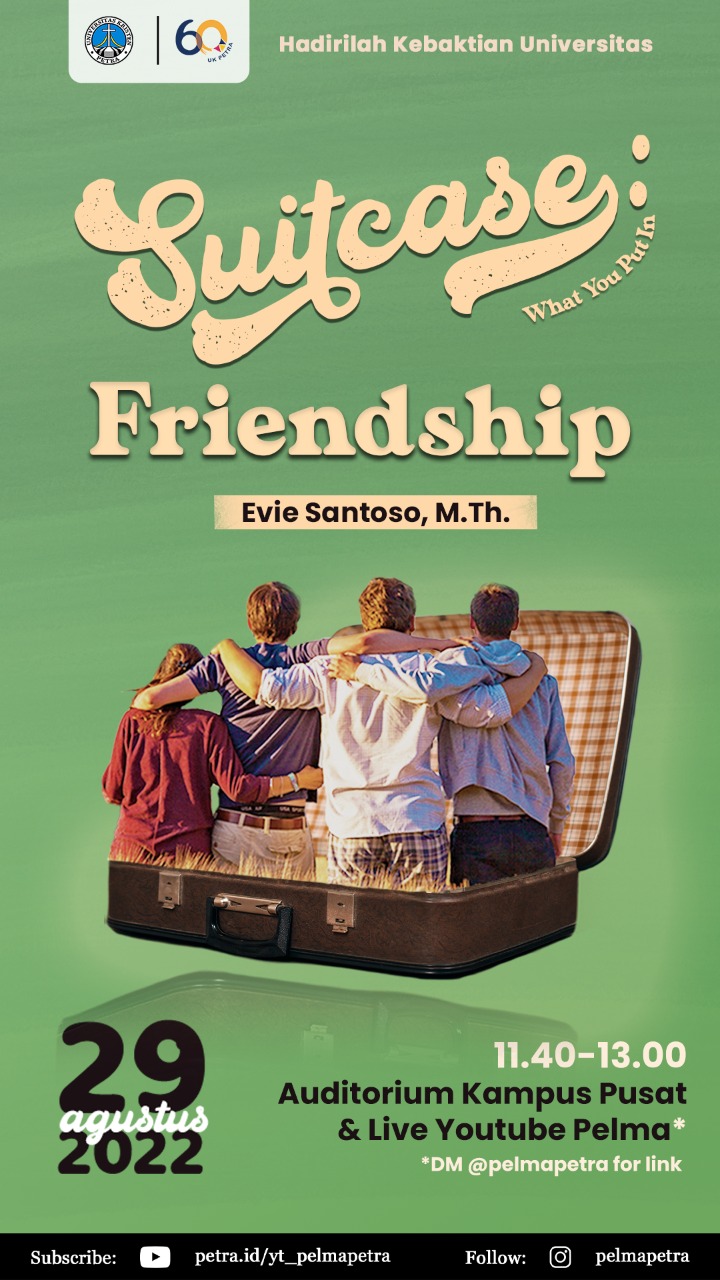 Universitas Kristen Petra Surabaya kembali mengajak civitas UK Petra untuk hadir dalam kebaktian universitas yang diadakan setiap hari Senin. Pada 29 Agustus 2022 jam 11.40 - 13.00 WIB bertempat di Auditorium kampus Pusat kebaktian kali ini mengankat tema "Kebaktian Universitas: suitcase what you put in it friendship". Dengan pengkhotbah Evie Santosa, M.Th.