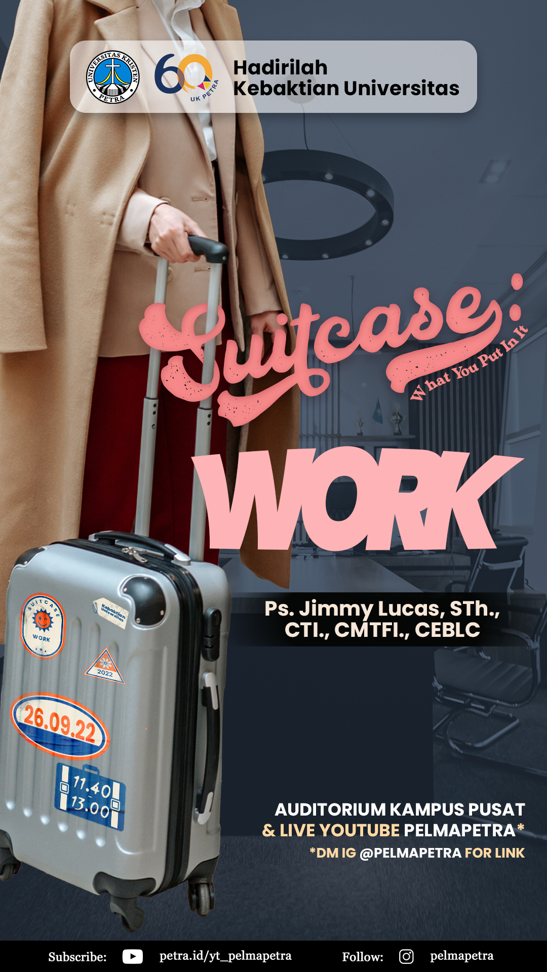 Pada tanggal 26 September 2020, jam 11.40 - 13.00 WIB, Sivitas Universitas Kristen Petra, diundang untuk hadir dalam Kebaktian Universitas: suitcase what you put init work. Pada kesempatan ini hadir sebagai pengkhobah adalah Pdt. Jimmy Lucas, STH.