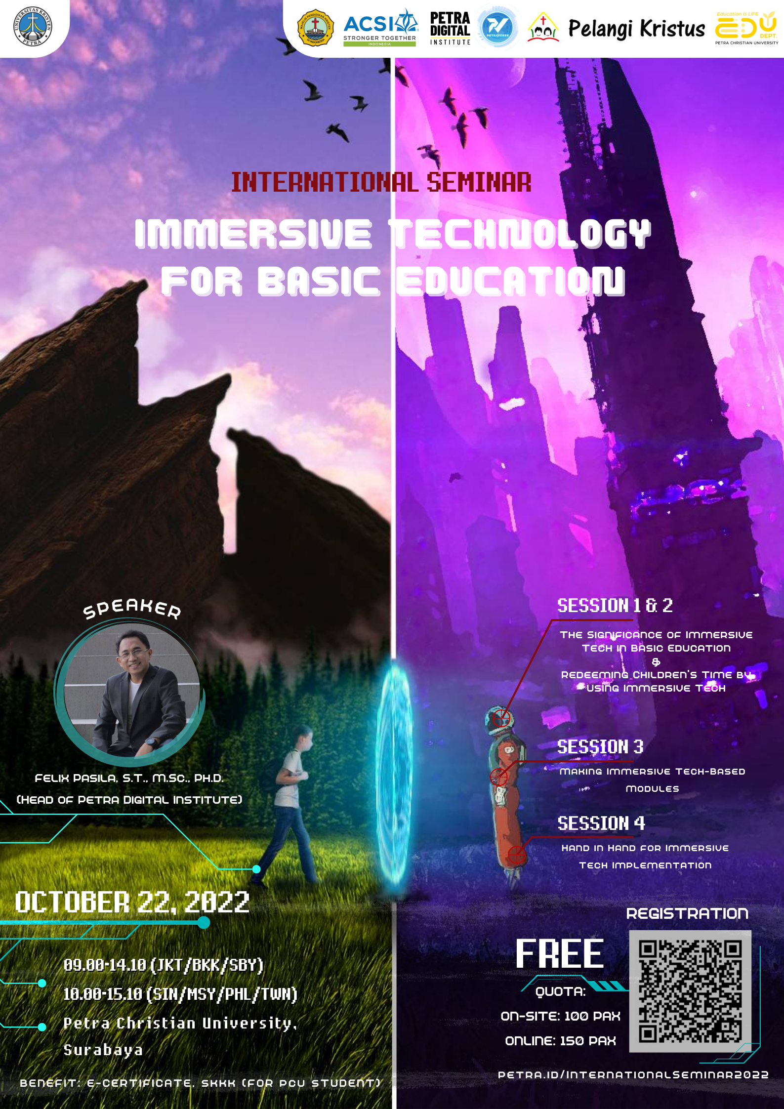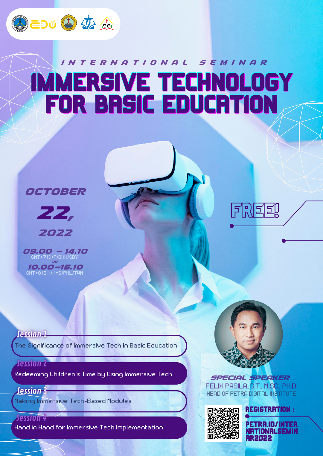 Pada tanggal 22 Oktober 2022 Program Studi PGSD Universitas Kristen Petra Surabaya, akan menyelenggarakan seminar internationa dengan tema: "Immersive technology for basic education". Dengan narasumber Felix Pasila, S.T., M.Sc., Ph.D.