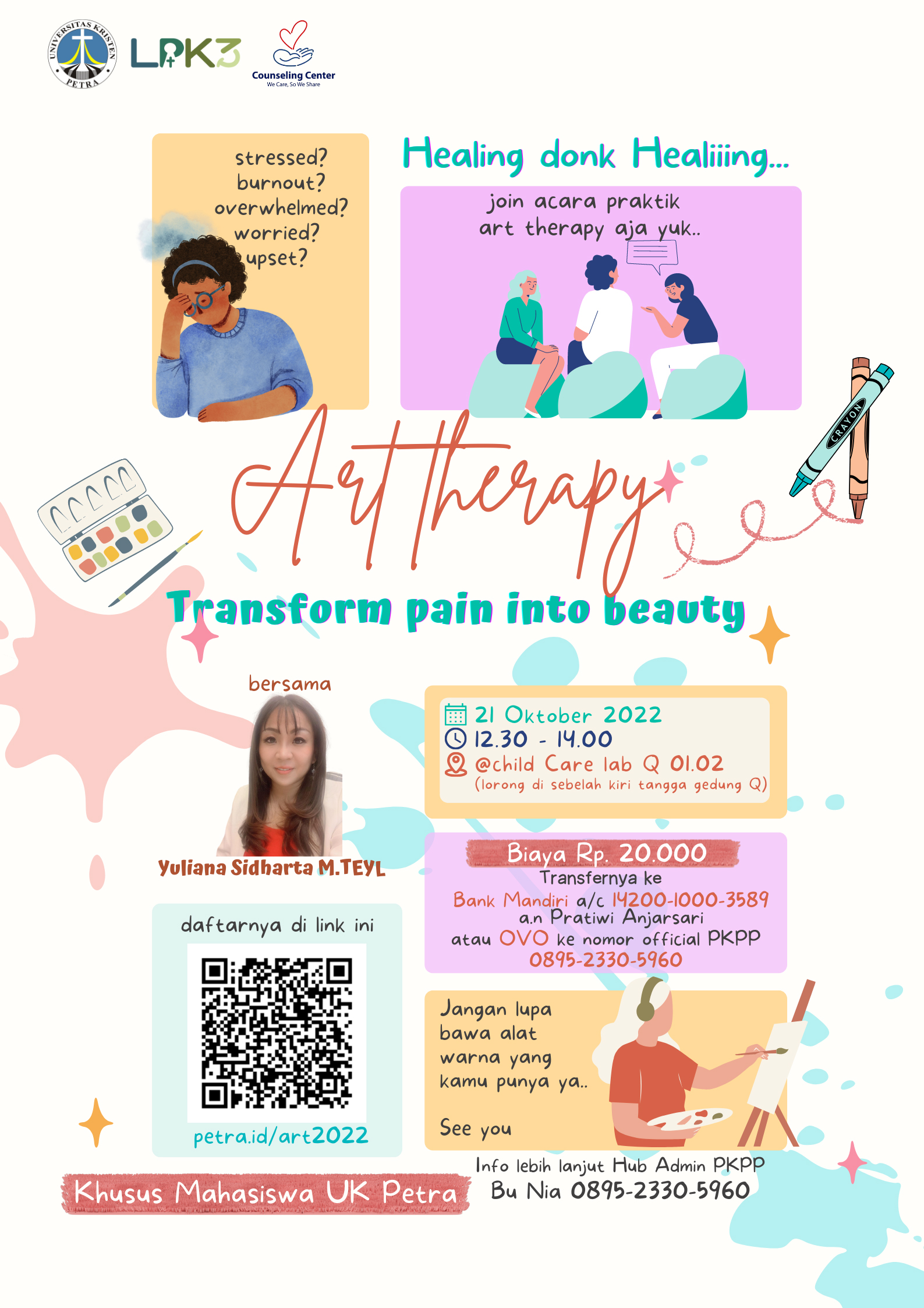 workshop singkat praktik Art Therapy untuk meregulasi emosi, dilaksanakan oleh Pusat Konseling dan Pengembangan Pribadi Universitas Kristen Petra Surabaya. Pada tanggal 21 Oktober 2022 jam 12.30 - 14.00 WIB dengan narasumber Yuliana Sidharta, M.Teyl.