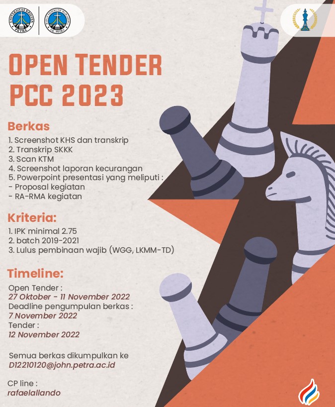 Dalam rangka kegiatan Petra Chess Competition, Badan Eksekutif Mahasiswa UK Petra mengadakan open tender pcc 2023 for batch 2019-2021.