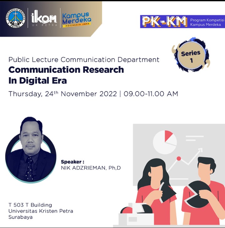 Kegiatan Public Lecture Communication Department dengan topik :"Communication research in Digital Era". Diadakan oleh Program Studi Ilmu Komunikasi UK Petra, pada tanggal 24 November 2022. Dengan Pembicara adalah : Nik Adzrieman bin Abdul Rahman, Ph,D.