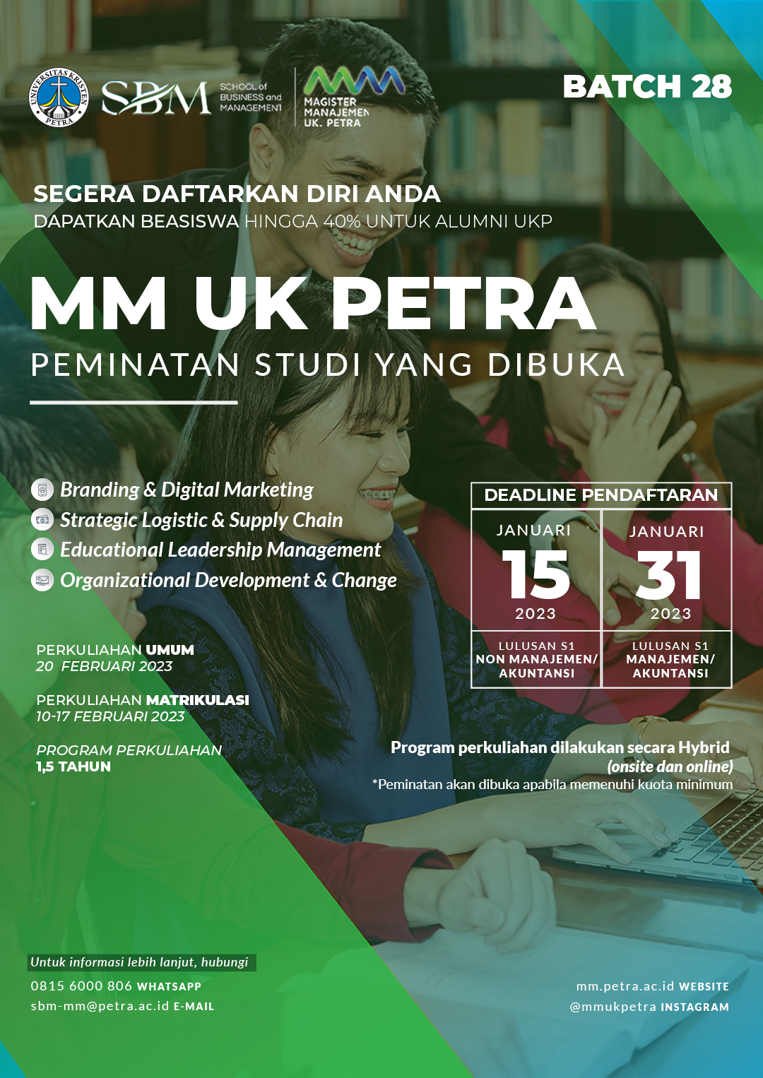 Program Studi Magister Management UK Petra Surabaya, membuka pendaftarn mahasiswa baru tahun 2023. Pendaftaran dibuka hingga tanggal 31 Januari 2023.