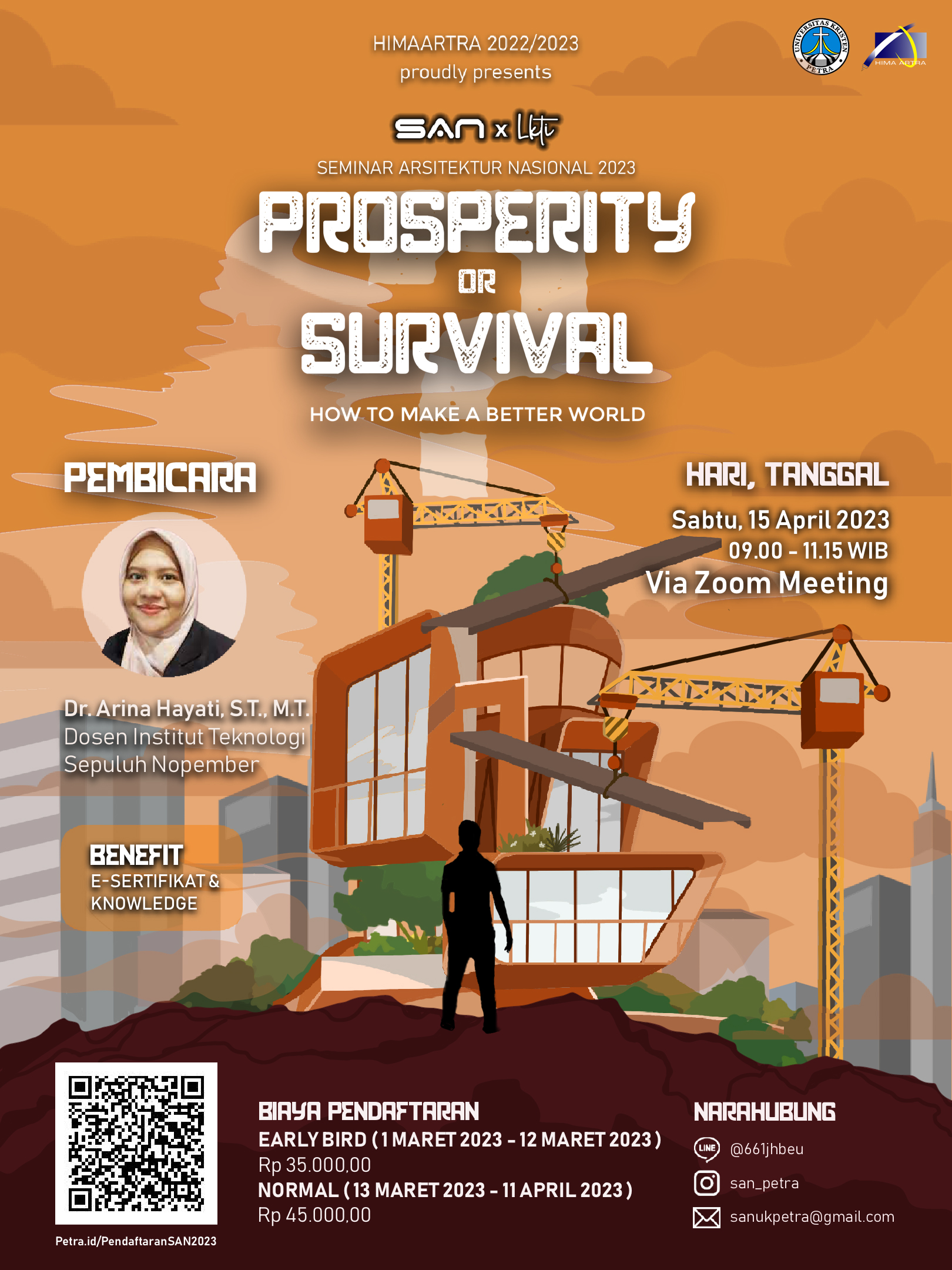 SAN merupakan Seminar Arsitektur Nasional yang diadakan setiap tahunnya oleh HIMAARTRA. Tahun ini, SAN mengangkat topik "Prosperity or Survival?: How To Build a Better World" yang mengajak para peserta untuk menciptakan dunia yang lebih baik. Acara ini diadakan pada Sabtu, 15 April 2023 jam 09.00 - 11.30 WIB. Dengan pembicara Dr. Arina Hayati, S.T., M.T.