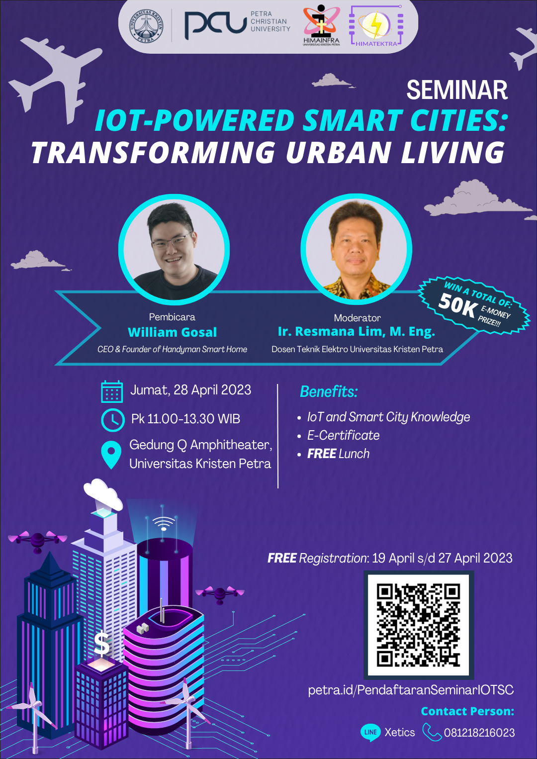 Pada tanggal 28 April 2023 bertempat di gedung Q, Amphitheater, Program Studi Teknik Informatika mengadakan Seminar IOT-powered smart cities: transforming urban living. Dengan narasumber William Gosal dan Resmana Lim sebagai moderator. Seminar ini mengusung tema IoT-Powered Smart Cities: Transforming Urban Living. Tema ini diambil karena peran teknologi IoT yang dapat meningkatkan dan mengembangkan kehidupan kota-kota di Indonesia menjadi lebih layak huni dan berkelanjutan, sehingga dapat membangun sebuah smart city. Hal ini dapat dilakukan dengan memanfaatkan teknologi IoT dalam mengoptimalkan sistem, infrastruktur, dan pelayanan bagi penduduk dalam kota-kota. Kegiatan seminar ini akan membahas mengenai teknologi IoT, Smart City, dan hubungan antar keduanya. Melalui tema ini, diharapkan para peserta dapat memperoleh wawasan yang luas dan dapat menggunakannya untuk ikut berperan dalam membangun sebuah smart city.