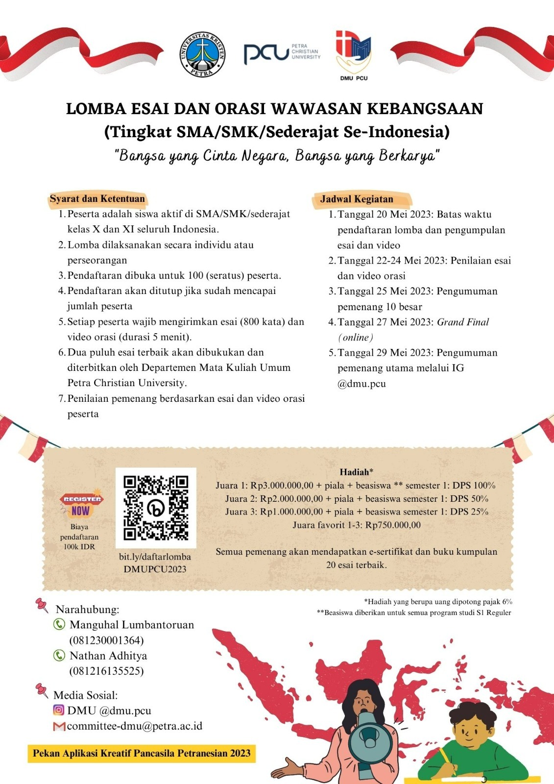 Departemen Mata Kuliah Umum Universitas Kristen Petra Surabaya pada tanggal 20 - 29 Mei 2023 mengadakan Lomba esai dan orasi wawasan kebangsaan ( tingkat SMA/SMK/Sederajat se Indonesia). Info selengkapnya bisa dilihat di bit.ly/daftarlombaDMUPCU2023.
