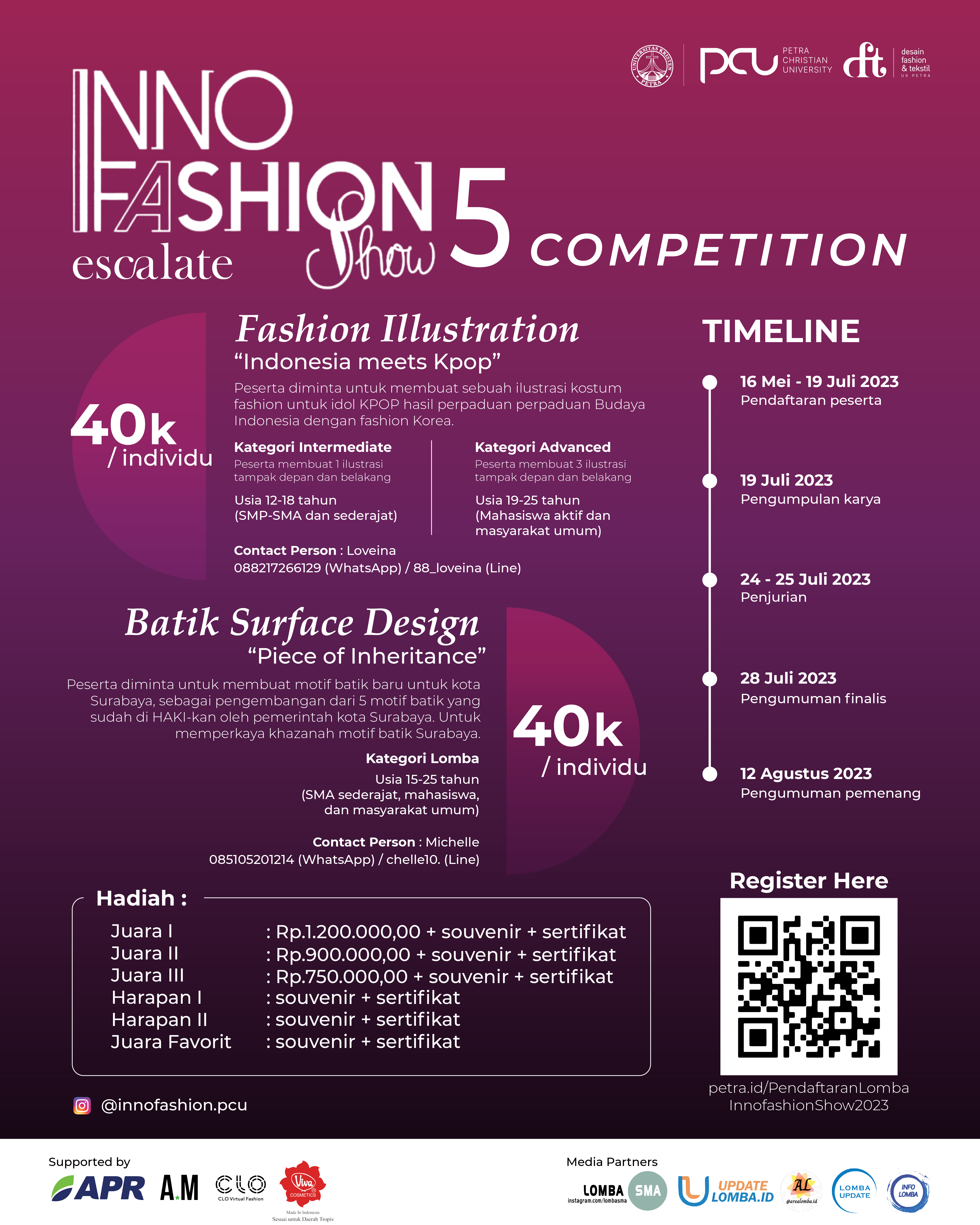 Untuk informasi terkait dengan lomba, dapat diakses melalui petra.id/BriefLombaInnofashionShow2023<