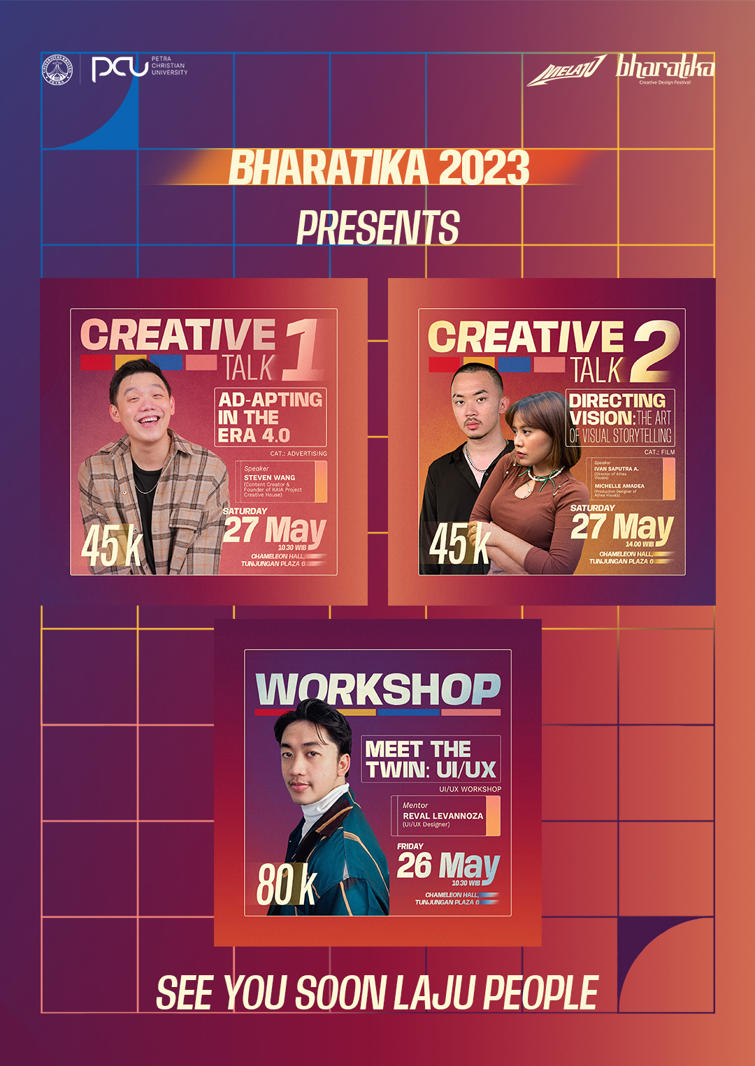 Bharatika Creative Design Festival 2023 merupakan acara festival seni dan desain yang diadakan oleh Fakultas Humaniora dan Industri Kreatif Universitas Kristen Petra Surabaya. Bharatika telah berlangsung selama 7 tahun, dengan berbagai rangkaian acara, seperti talkshow, pameran, workshop, dan lomba. Lomba sendiri menjadi ciri khas acara Bharatika karena adanya empat kategori atau biasa disebut dengan Punggawa, yaitu Tirta yang berarti air (Desain Komunikasi Visual), Agni yang berarti Api (Desain Interior), Bayu yang berarti angin (Desain Produk), dan Buana yang berarti tanah (SMA). Tahun ini, Bharatika mengangkat judul “Bharatika Melaju” yang mengajak insan muda kreatif, atau Laju People, untuk berani melaju ke masa depan melalui pengembangan skill design. Bharatika Melaju akan diadakan di Chameleon Hall, Tunjungan Plaza 6 pada tanggal 26-28 Mei.