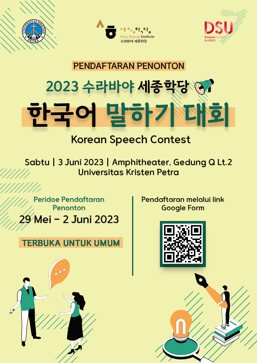 Lomba Pidato Bahasa Korea Tahun 2023, Suatu event lomba pidato dalam Bahasa Korea yang diadakan oleh KSI Surabaya setiap tahunnya. Peserta lomba adalah murid KSI sedangkan penonton berasal dari berbagai kalangan (umum). Peserta dibagi menjadi dua kategori yaitu Beginner dan kategori Intermediate (kelas dengan level tinggi). Pemenang lomba juara satu kategori Beginner dan Intermediate akan dapat mengikuti kegiatan: normal;"Korean Culture Experience di Korea Selatan. Acara ini diselenggarakan pada tanggal 03 Juni 2023 bertempat di Amphitheater gedung Q-2 Universita Kristen Petra Surabaya.