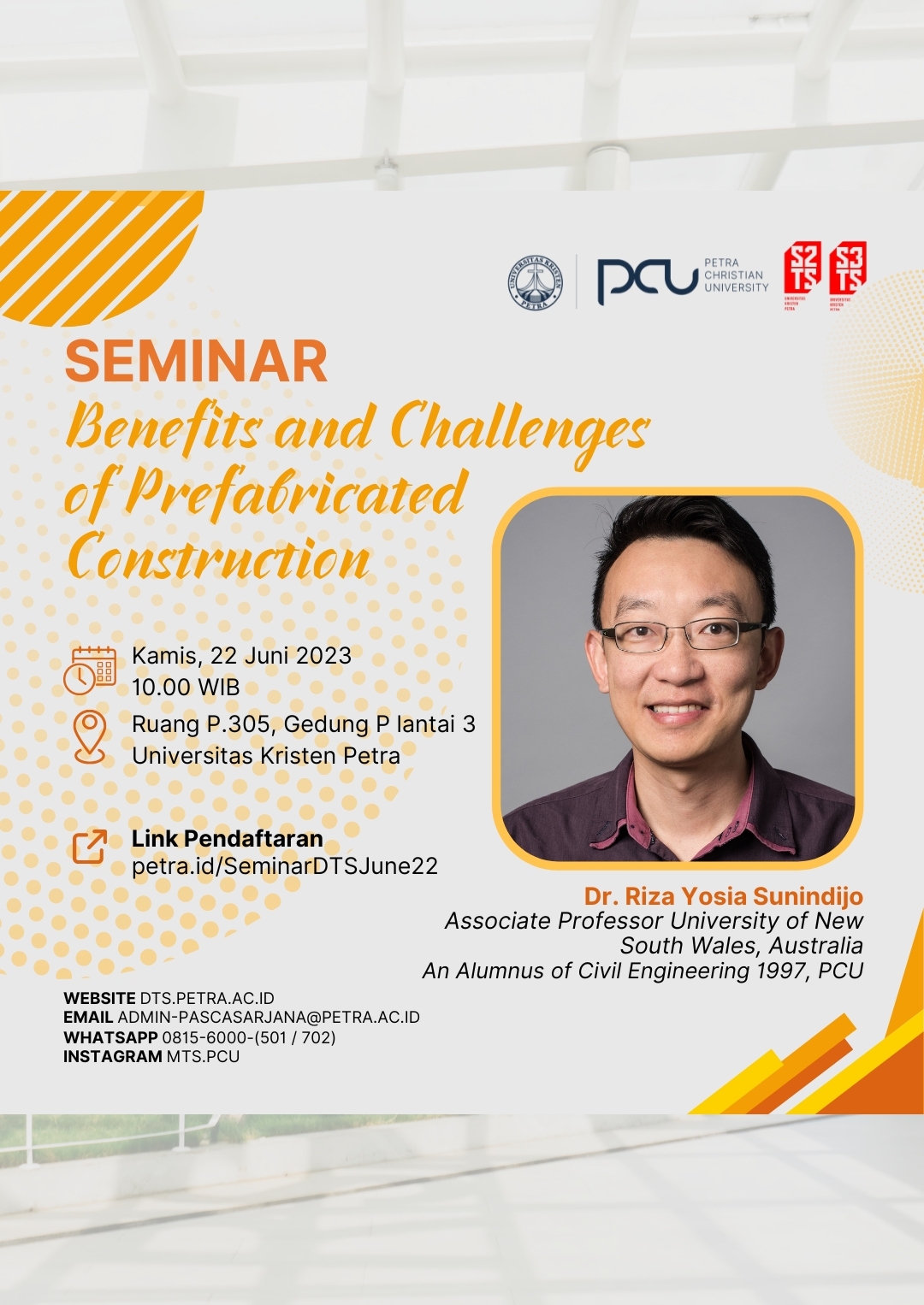 Program Studi Doktor Teknik Sipil UK Petra Surabaya Pada Kamis, 22 Juni 2023 mengadakan acara Seminar - "benefits and challenges of prefabricated construction". Bertempat di Gedung P.305. dengan narasumber Dr. Riza Yosia Sunindijo.