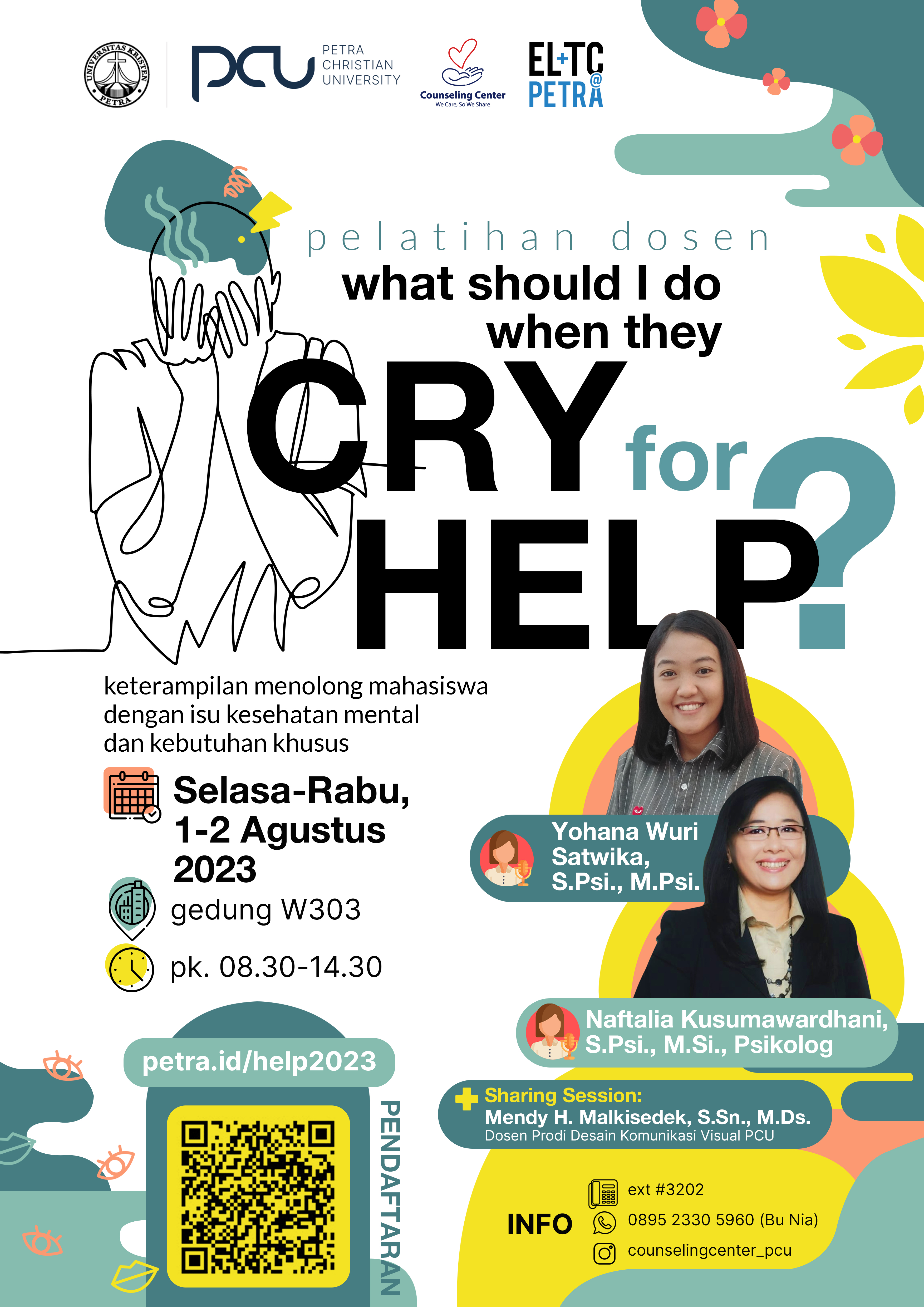 Pelatihan untuk dosen mengenai cara mendampingi mahasiswa berkebutuhan khusus mahasiswa yang bergumul dengan isu kesehatan mental. Akan diselenggarakan oleh Pusat Konseling dan Pengembangan Pribadi, pada tanggal 1-2 Agustus 2023, bertempat di gedung W.303