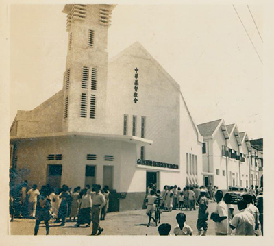 Bertepatan dengan HUT ke-25, diadakan kebaktian ucapan syukur selesainya pemugaran gereja. Tampak depan gedung gereja THKTKH Jalan Samudra (Foto diambil tanggal 3 Juni 1953)