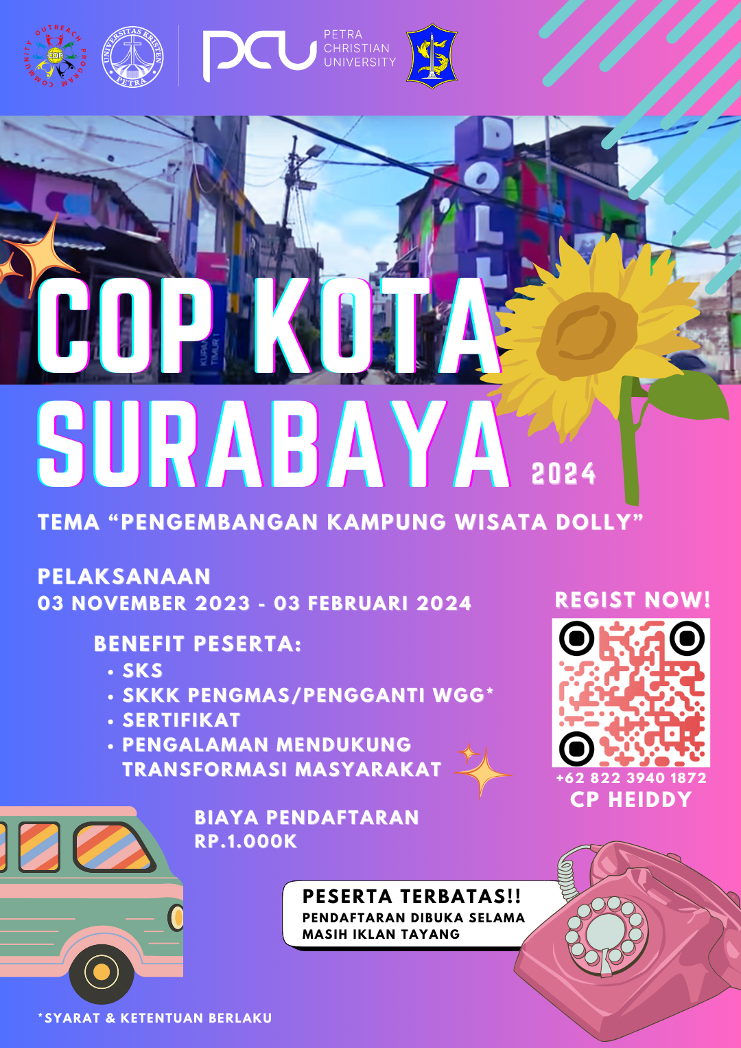 LPPM kembali membuka pendaftaran bagi mahasiswa PCU untuk menjadi bagian sebagai peserta Community Outreach Program (COP) Kota Surabaya 2024. Community Outreach Program (COP) 2024 adalah program service learning yang dilaksanakan untuk mendukung pemberdayaan masyarakat dalam memaksimalkan potensi yang ada di wilayah. Tema Program "Pengembangan Kampung Wisata Dolly". Lokasi RW 06 dan RW 12 Kelurahan Putat Jaya, Kecamatan Sawahan, Kota Surabaya. Jumlah peserta 30 orang mahasiswa. Waktu pelaksanaan program 03 November 2023 - 03 Februari 2023. Benefit Peserta adalah SKS; SKKK Pengabdian Masyarakat/pengganti WGG bagi mahasiswa tingkat akhir; Sertifikat; dan Pengalaman berharga membantu masyarakat secara langsung. 2. Prioritas background pendidikan mahasiswa Pariwisata Kreatif, Bisnis Manajemen, Retail, Akutansi, Keuangan, Pemasaran, Bisnis Kuliner, DKV, Arsitektur, Desain Interior, Sistem Informasi, IOT, PGSD, PGPAUD, dan lainnya yang relevan dengan tema program. Pendaftaran DIBUKA mulai tanggal 18-27 Oktober 2023. Peserta akan mendaftarkan diri melalui link sebagai berikut: