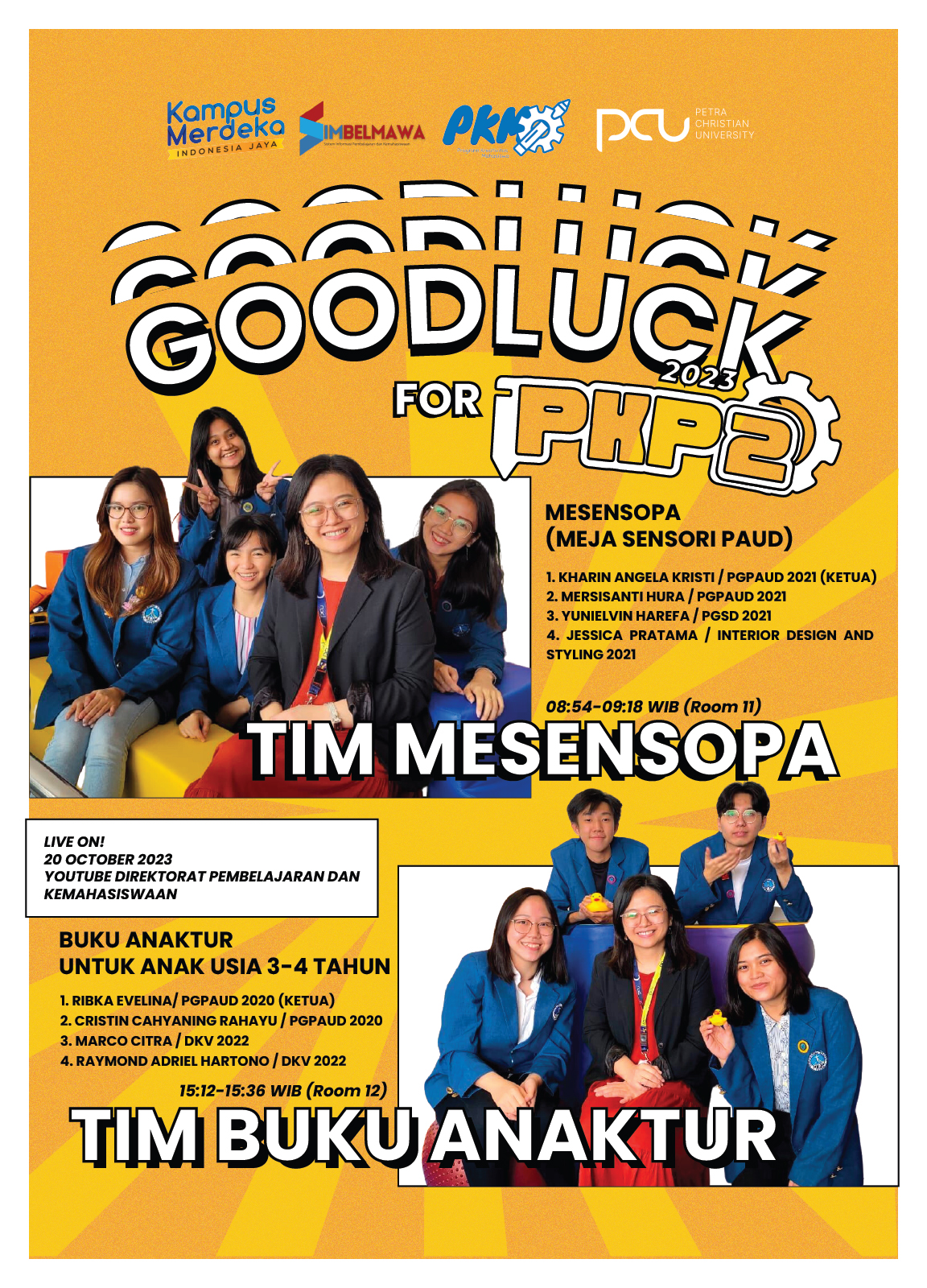 Tim Mesensopa dan Tim Buku Anaktur akan mengikuti PKP2 2023 (Penilaian Kemajuan Pelaksanaan PKM). Untuk melihat bagaimana kemajuan pelaksanaan PKM dari masing-masing tim. Acara akan dilaksanakan di Youtube Direktorat Pembelajaran dan Kemahasiswaan. Pada tanggal 20 Oktober 2023.
