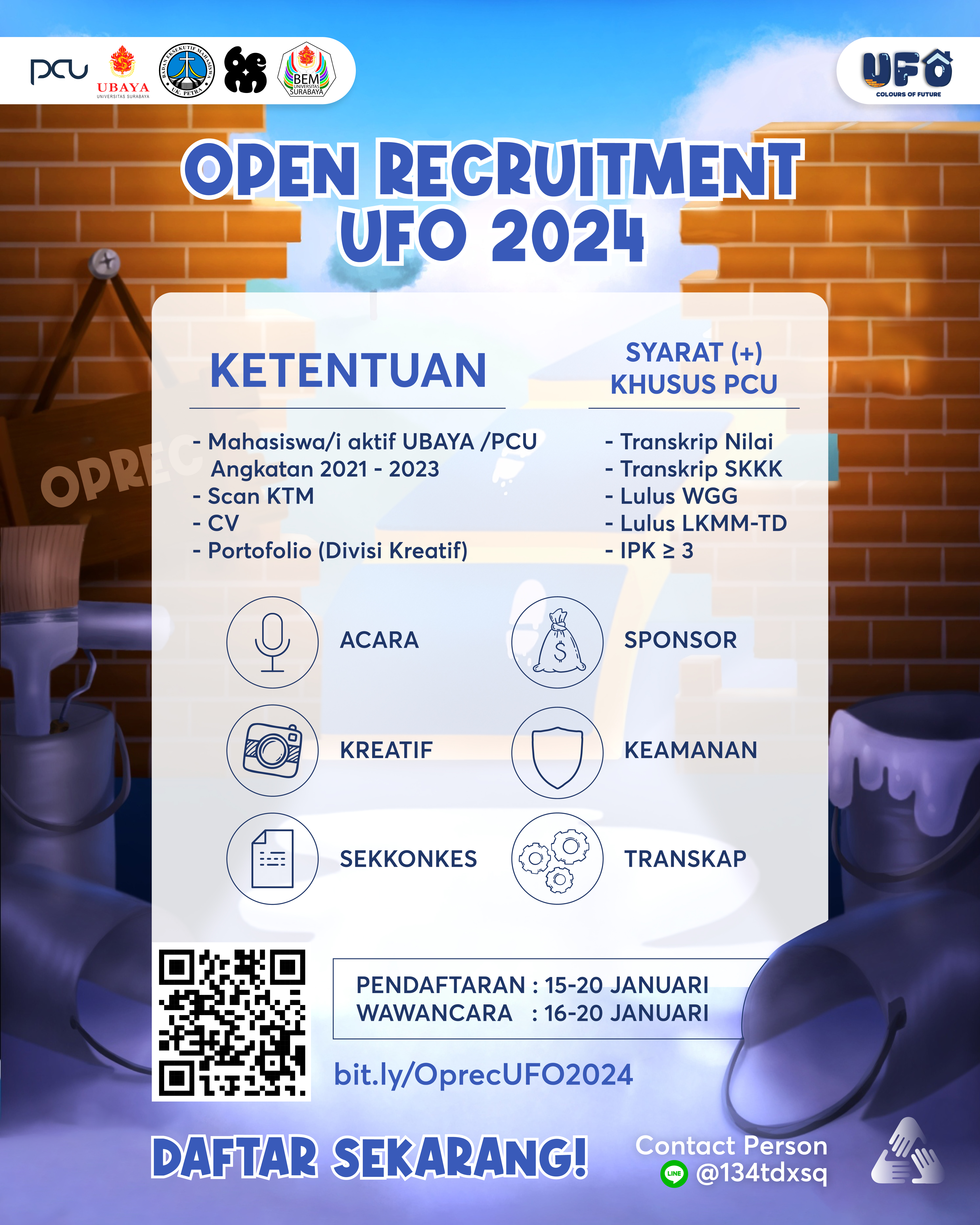 Dibuka pendaftan panitia UFO 2024 bagi mahasiswa UK Petra dan Ubaya. Pendaftaran dibuka dari tanggal 15 - 20 Januari 2024. Dan wawancara dilaksanakan pada 16 - 20 Januari 2024. info pendaftaran bisa dilihat di bit.ly/OperecUFO2024.
