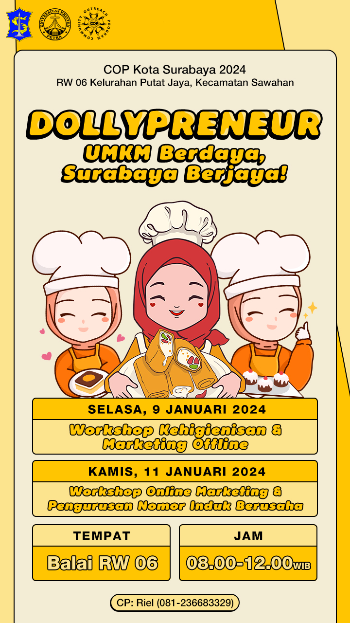 Lembaga Penelitian dan Pengabdian kepada Masyarakat melalui COP tahun 2024, mengadakan workshop dan pelatihan UMKM kepada warga RW 06 kelurahan Putat Jaya, Sawahan Surabaya. Workshop dilaksanakan pada tanggal 9 dan 11 Januari 2024 jam 08.00 - 12.00 WIB.