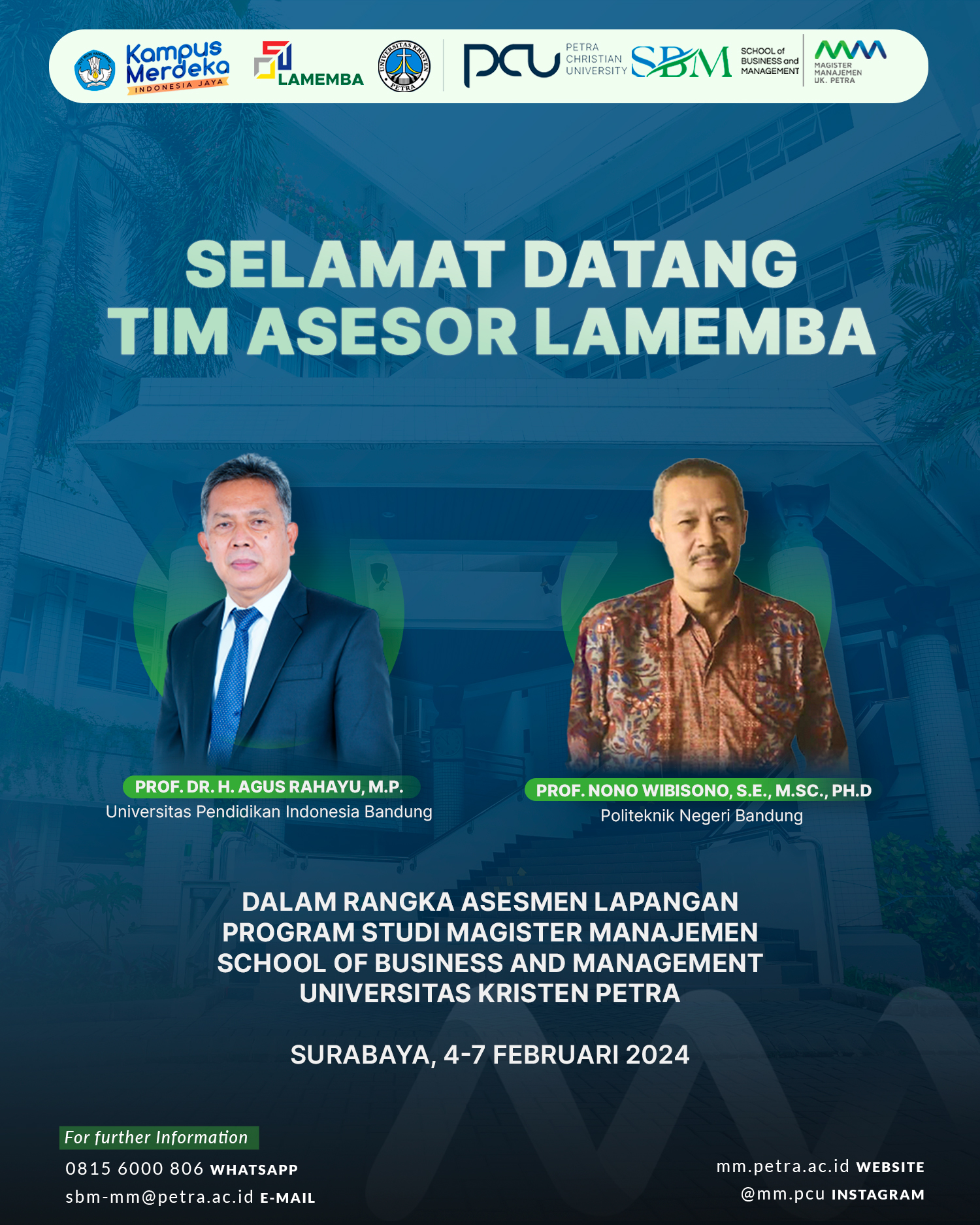 Ucapan selamat datang ditujukan kepada tim asesor Lamemba yang melakukan asesmen lapangan di Program Studi Magister Manajemen UK Petra pada tanggal 6-7 Februari 2024.