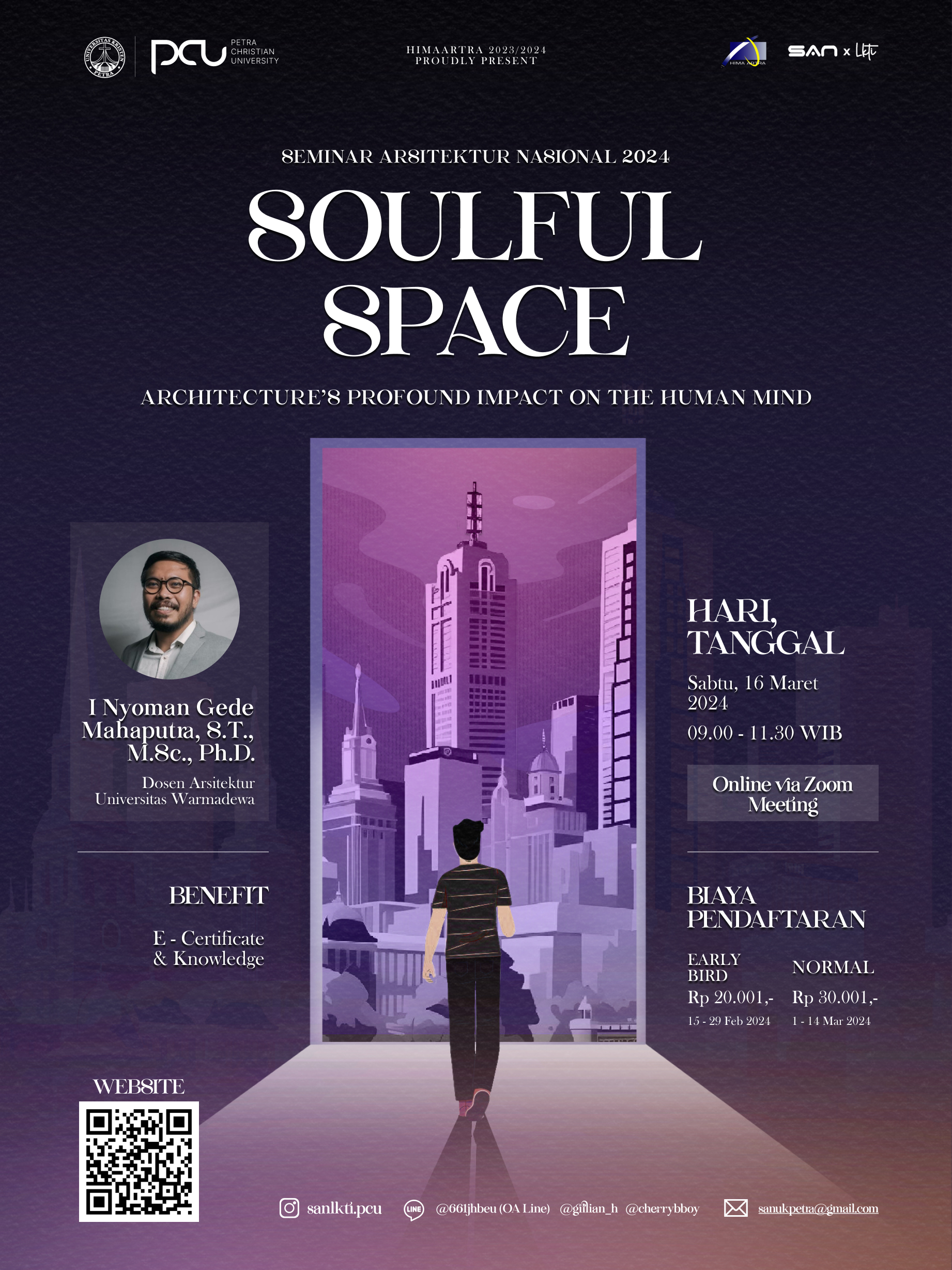 SAN merupakan Seminar Arsitektur tingkat nasional, yang diselenggarakan oleh Himpunan Mahasiswa Arsitektur UK Petra. Melalui seminar, para peserta dapat belajar cara menciptakan ruang yang merespon masalah psikologi manusia. Acara ini diselenggarakan pada Sabtu, 16 Maret 2024 dengan narasumber I Nyoman Gede Mahaputra, Ph.D.