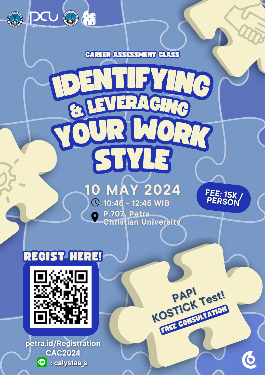 Career Assessment Class 2024 membawakan konsep "Identifying and Leveraging Your Work Style" yang dimana pada kesempatan ini Career Assessment Class akan mengadakan sebuah test gaya kerja beserta sedikit penjabaran mengenai hasil tes yang telah dikerjakan oleh peserta oleh Pihak Petra Career Center dengan opsi consultation berlanjut dengan pihak Petra Career Center langsung. Acara ini dilaksanakan pada 10 Mei 2024, bertempat di gedung P.707. Dengan biaya Rp.15.000. per orang
