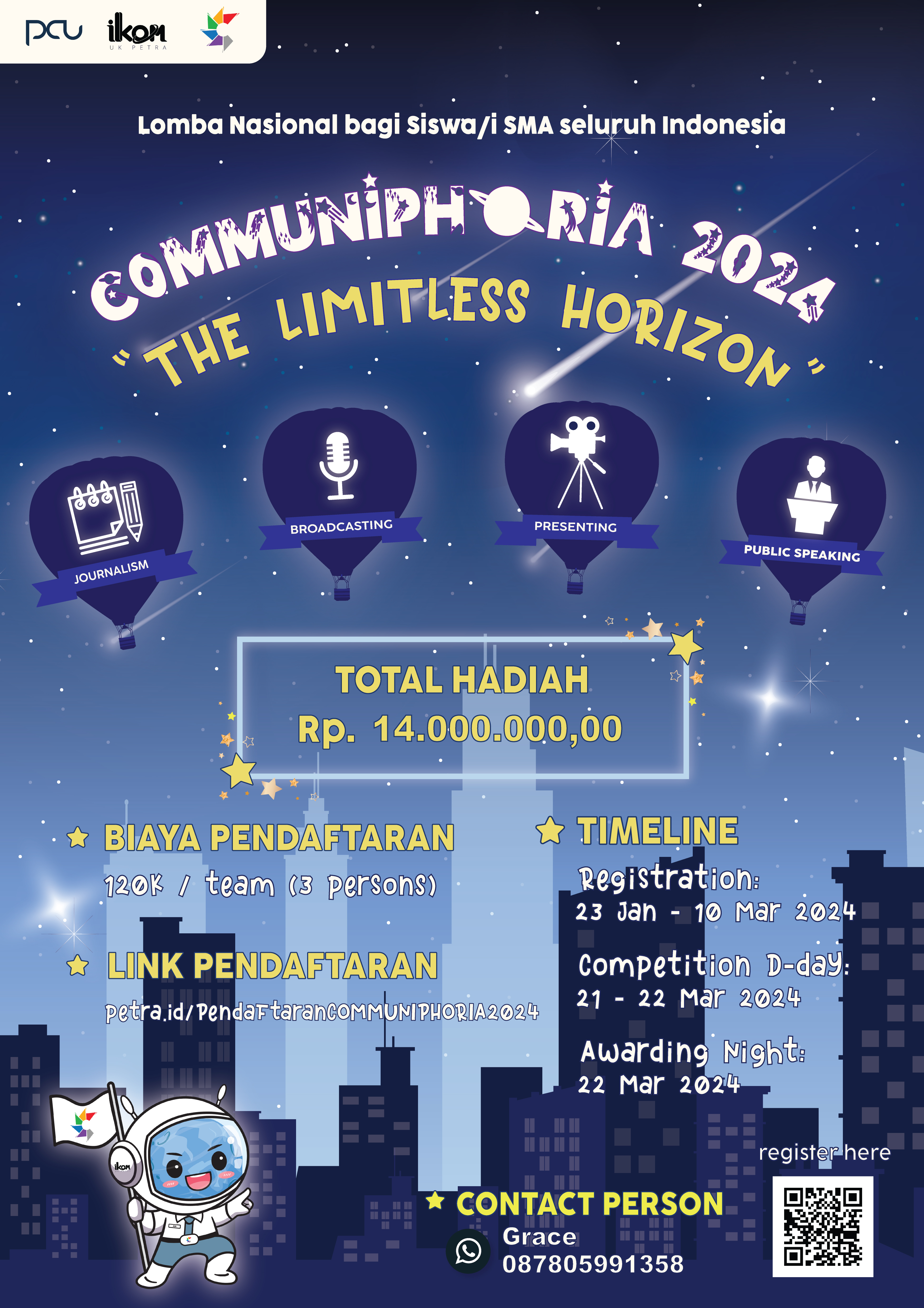Lomba tingkat Nasional terbuka bagi siswa/i SMA se-Indonesia. Mengangkat tema "The Limitless Horizon", untuk mengajak mereka menjelajahi potensi diri dan mengenali minat/bakat peserta. Untuk pelaksanaan kegiatan tersebut dibutuhkan beberapa SDM untuk menjadi panitia. Bila ada yang berminat silahkan mendaftarkan diri.