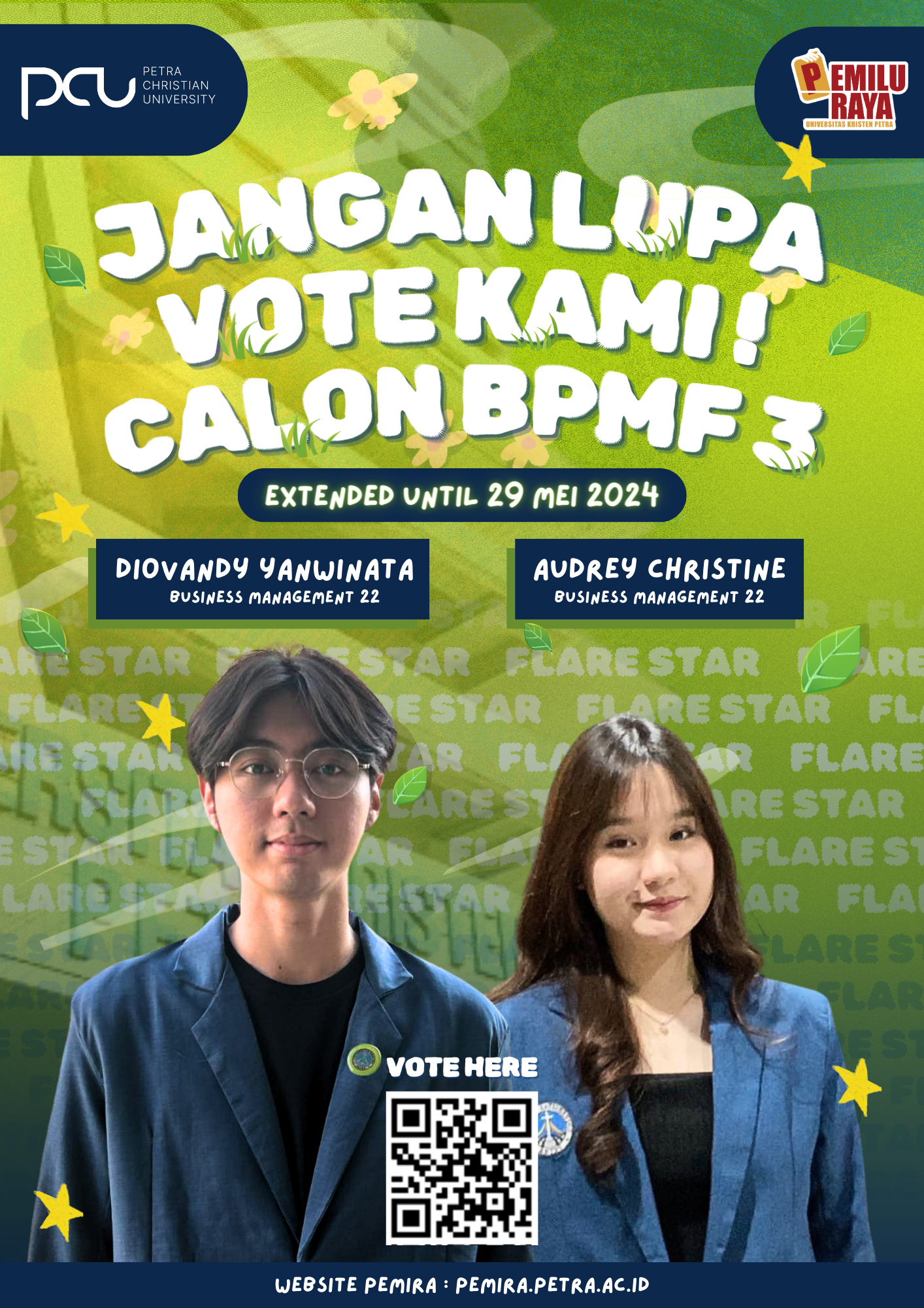 Mengajak mahasiswa UK Petra untuk melakukan voting calon BPMF 3. Voting ditutup pada tanggal 29 Mei 2024.