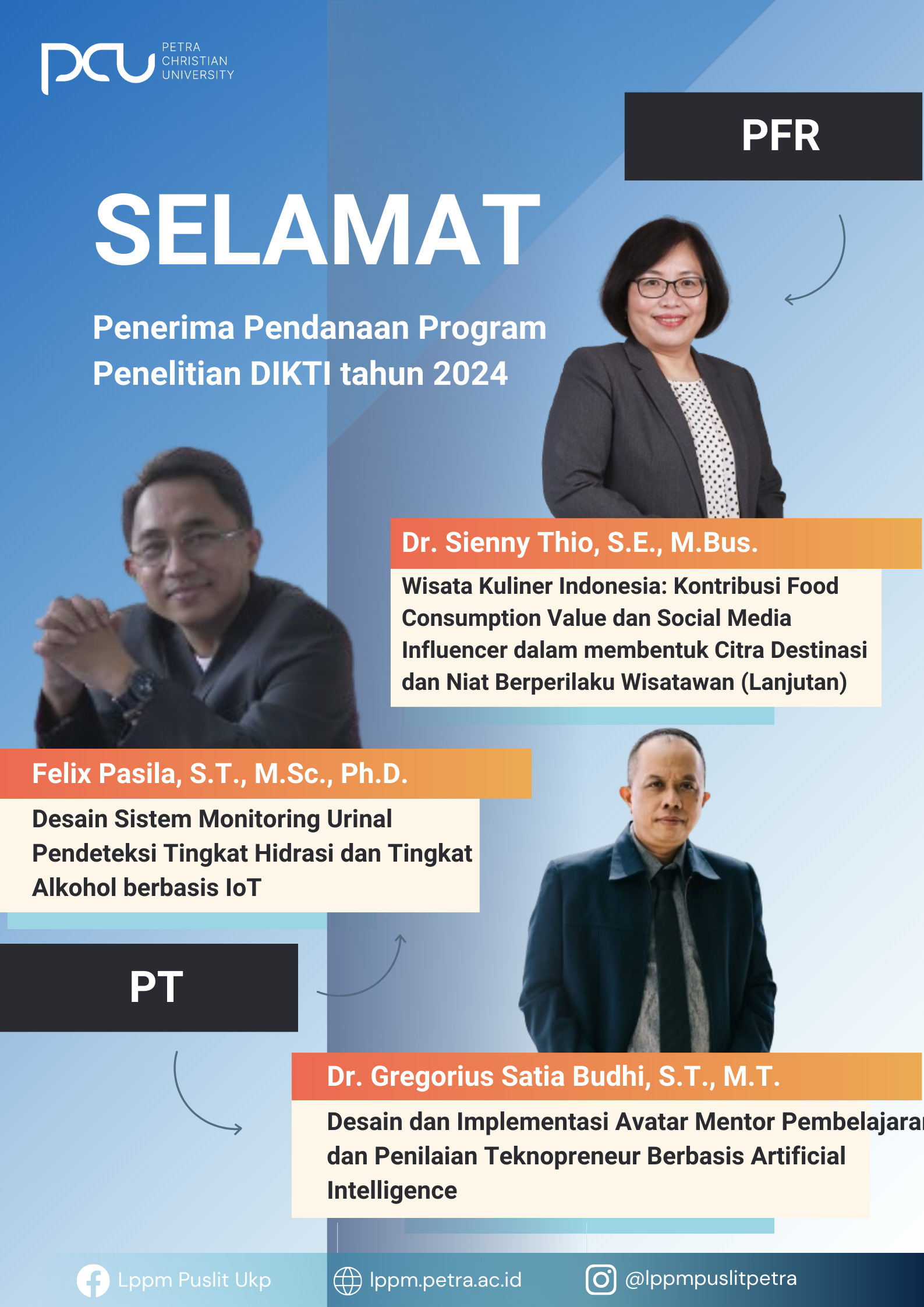 Selamat kepada Penerima Pendanaan P2M DIKTI tahun anggaran 2024. Yang diterima oleh Dr. Sienny Thio, M.Bus., dan Felix Pasila, Ph.D., dan Dr. Gregorius Satia Budhi, M.T.