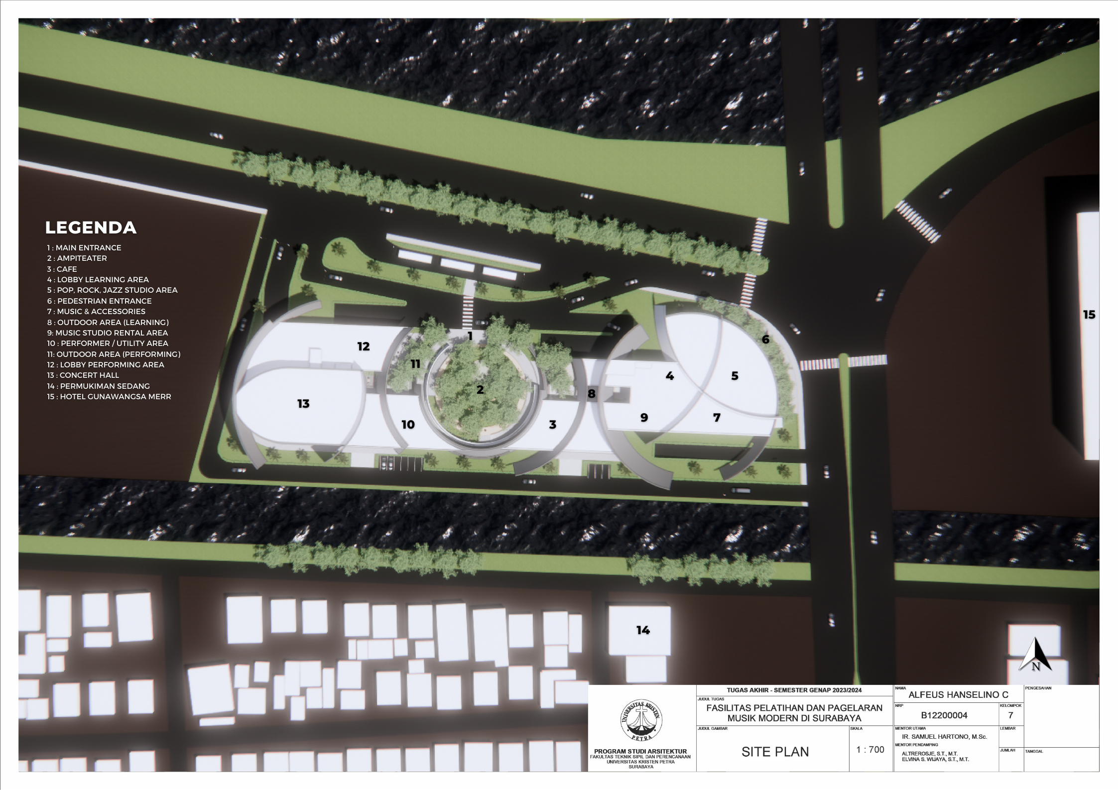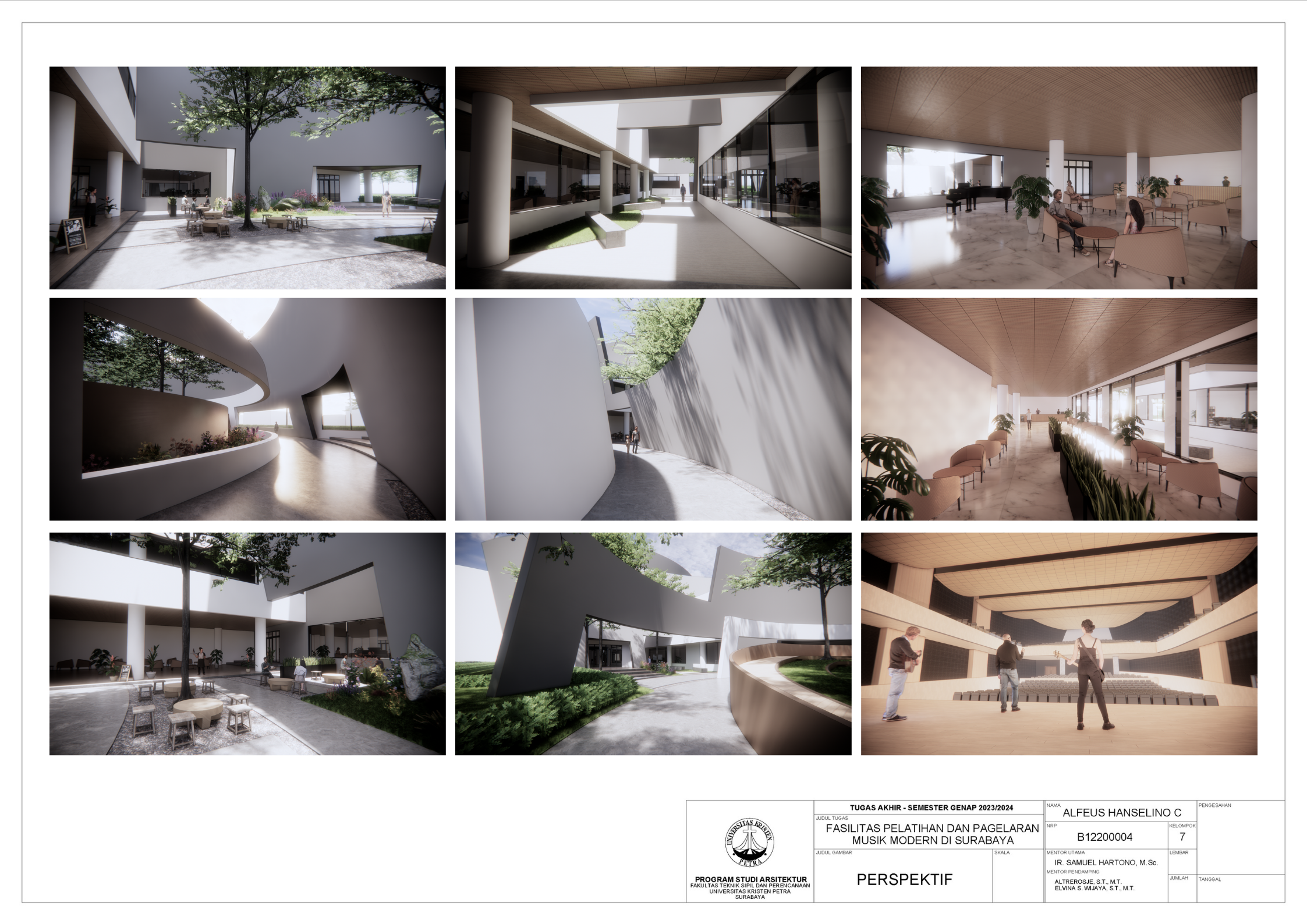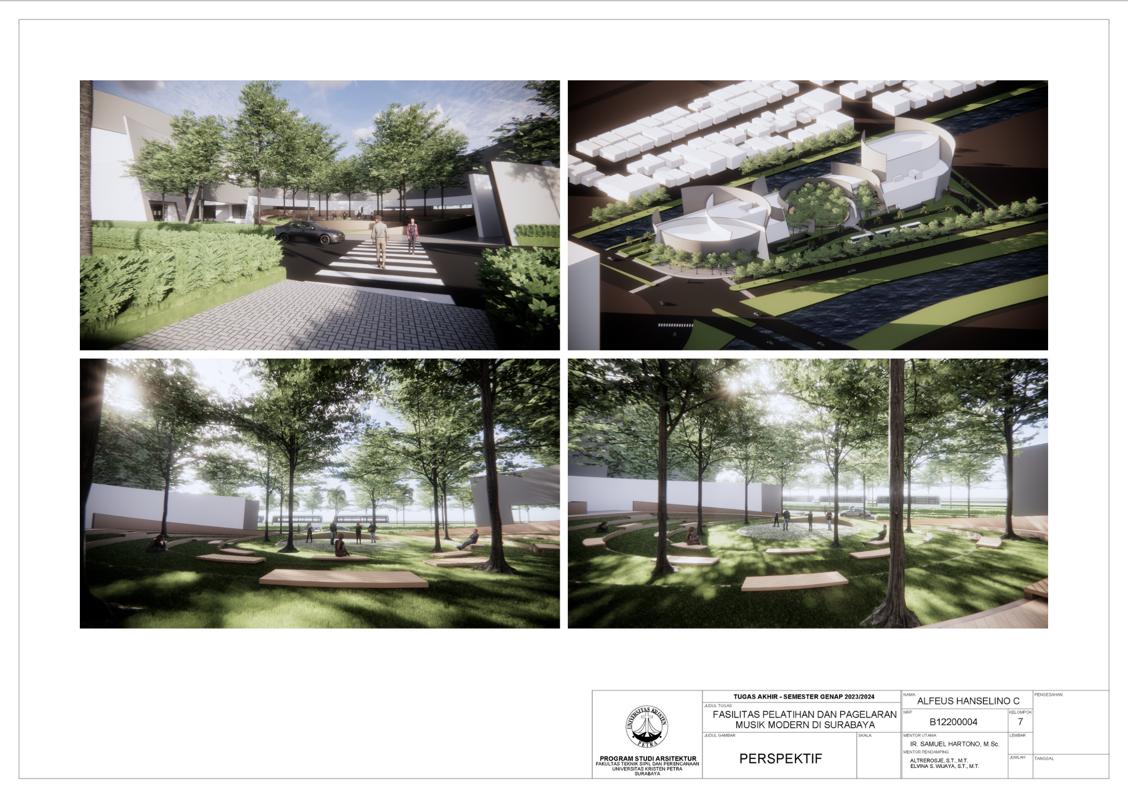 Musik merupakan sebuah seni yang dihasilkan melalui intuisi untuk mencipta sebuah gubahan nada dan harmoni. Salah satu jenis musik yang masih terus berkembang mengikuti teknologi zaman adalah musik modern. Kota Surabaya telah menjadi salah satu saksi lahirnya musisi hebat di Indonesia. Di era sekarang, musik modern menjadi bahasa universal dan diminati oleh banyak orang. Namun, perkembangan musik sendiri masih belum setara dengan fasilitas yang mewadahinya. Fasilitas pelatihan dan pagelaran musik belum mencerminkan identitas musik dan juga arti sebuah ruang bermusik. Realitanya banyak studio musik di Surabaya yang belum memenuhi baku kualitas akustik sehingga aktivitas para pelaku kegiatan bermusik menjadi kurang optimal. Perencanaan fasilitas pelatihan dan pagelaran musik modern di Surabaya bertujuan untuk memfasilitasi orang dalam bermusik (musisi hingga orang awam). Fasilitas ini mencakup tiga fungsi, yaitu Learning, Exhibition, dan Performing. Fasilitas utama adalah Concert Hall sebagai ruang konser musik dan Studio Musik (kursus, latihan, dan rekaman). Sedangkan fasilitas pendukung berupa pameran musik, toko dan alat perlengkapan musik, dan café. Fasilitas ini berfokus pada tiga genre musik modern, yaitu musik pop, rock, dan jazz. Dari perencanaan desain, pendekatan yang digunakan adalah pendekatan akustik menggunakan teori Aural Architecture. Tujuannya untuk mewujudkan karakter ruang bermusik dan pengalaman spasial orang secara audio dan visual, serta memperhatikan kenyamanan akustik bagi pengguna di dalam ruang konser.