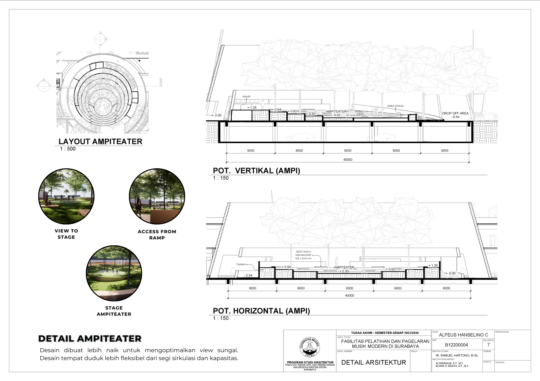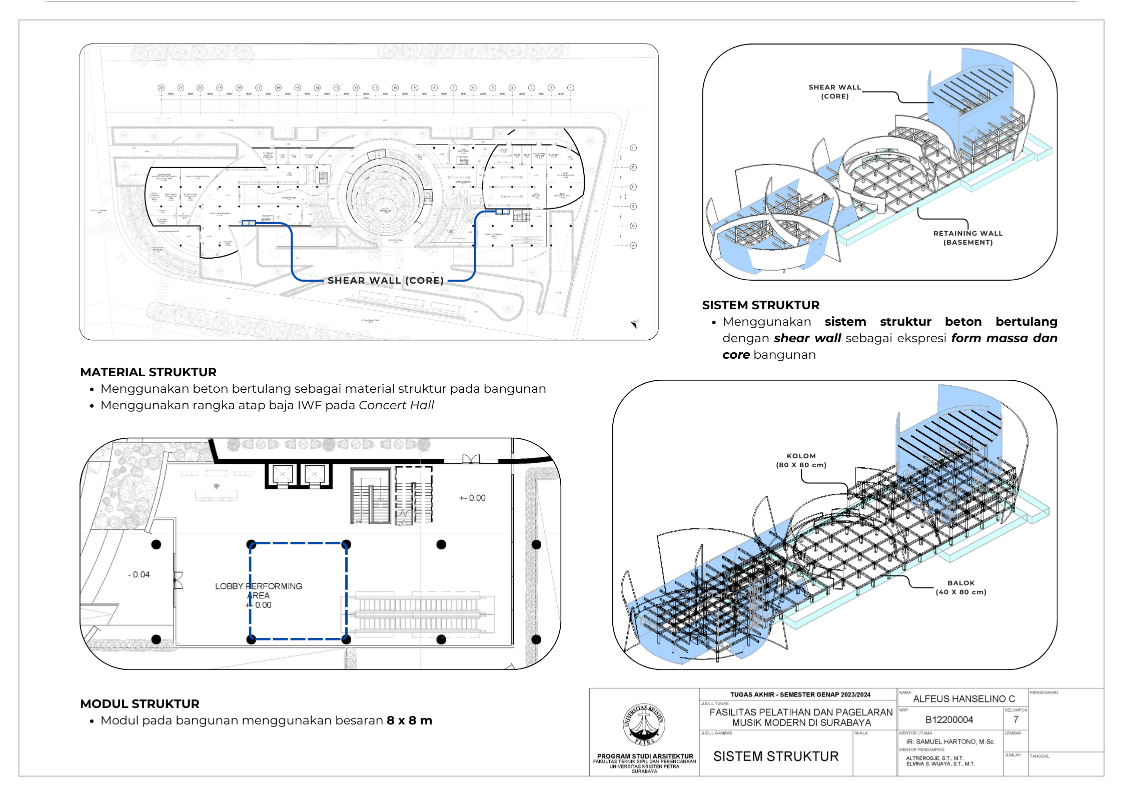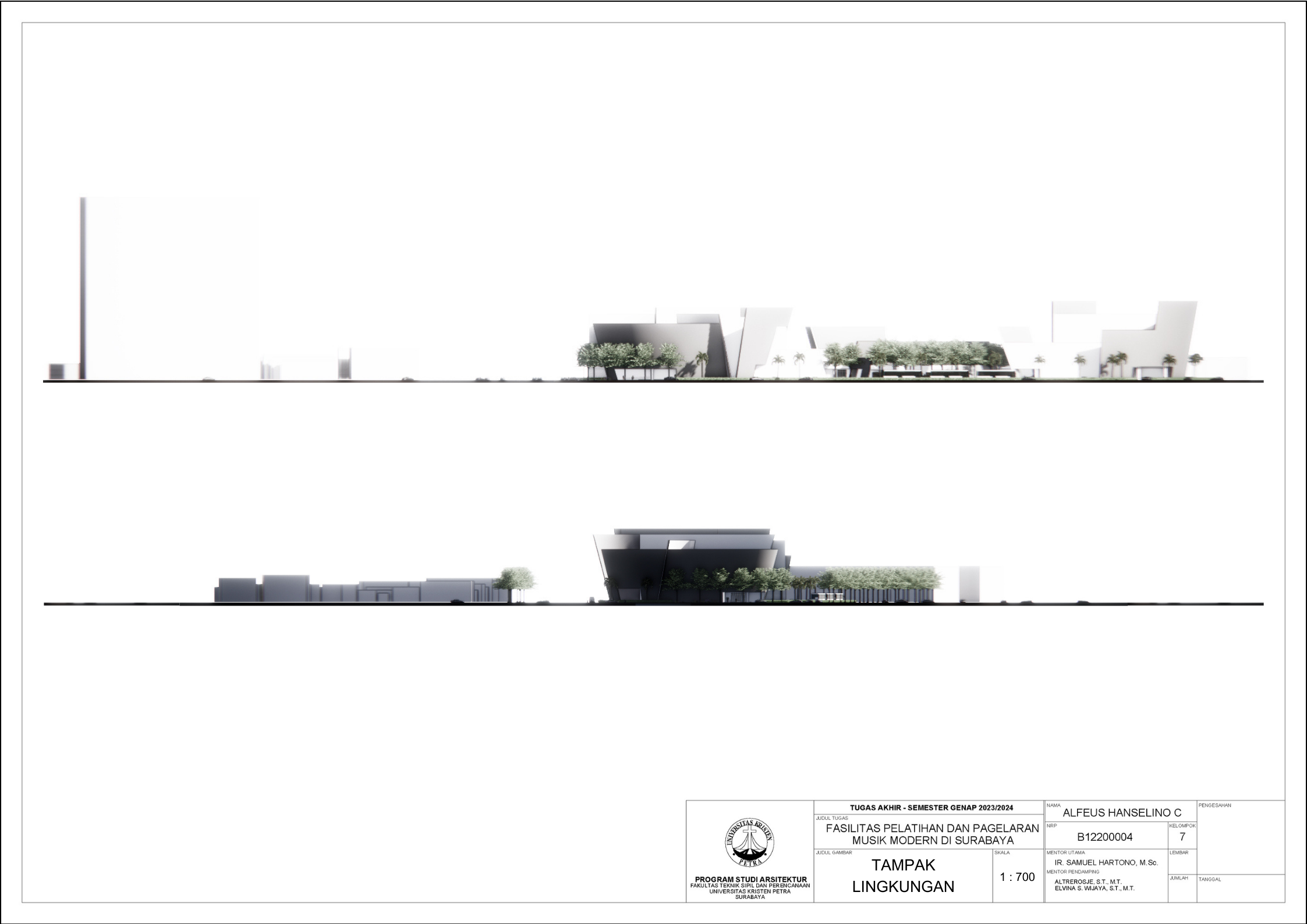 Musik merupakan sebuah seni yang dihasilkan melalui intuisi untuk mencipta sebuah gubahan nada dan harmoni. Salah satu jenis musik yang masih terus berkembang mengikuti teknologi zaman adalah musik modern. Kota Surabaya telah menjadi salah satu saksi lahirnya musisi hebat di Indonesia. Di era sekarang, musik modern menjadi bahasa universal dan diminati oleh banyak orang. Namun, perkembangan musik sendiri masih belum setara dengan fasilitas yang mewadahinya. Fasilitas pelatihan dan pagelaran musik belum mencerminkan identitas musik dan juga arti sebuah ruang bermusik. Realitanya banyak studio musik di Surabaya yang belum memenuhi baku kualitas akustik sehingga aktivitas para pelaku kegiatan bermusik menjadi kurang optimal. Perencanaan fasilitas pelatihan dan pagelaran musik modern di Surabaya bertujuan untuk memfasilitasi orang dalam bermusik (musisi hingga orang awam). Fasilitas ini mencakup tiga fungsi, yaitu Learning, Exhibition, dan Performing. Fasilitas utama adalah Concert Hall sebagai ruang konser musik dan Studio Musik (kursus, latihan, dan rekaman). Sedangkan fasilitas pendukung berupa pameran musik, toko dan alat perlengkapan musik, dan café. Fasilitas ini berfokus pada tiga genre musik modern, yaitu musik pop, rock, dan jazz. Dari perencanaan desain, pendekatan yang digunakan adalah pendekatan akustik menggunakan teori Aural Architecture. Tujuannya untuk mewujudkan karakter ruang bermusik dan pengalaman spasial orang secara audio dan visual, serta memperhatikan kenyamanan akustik bagi pengguna di dalam ruang konser.