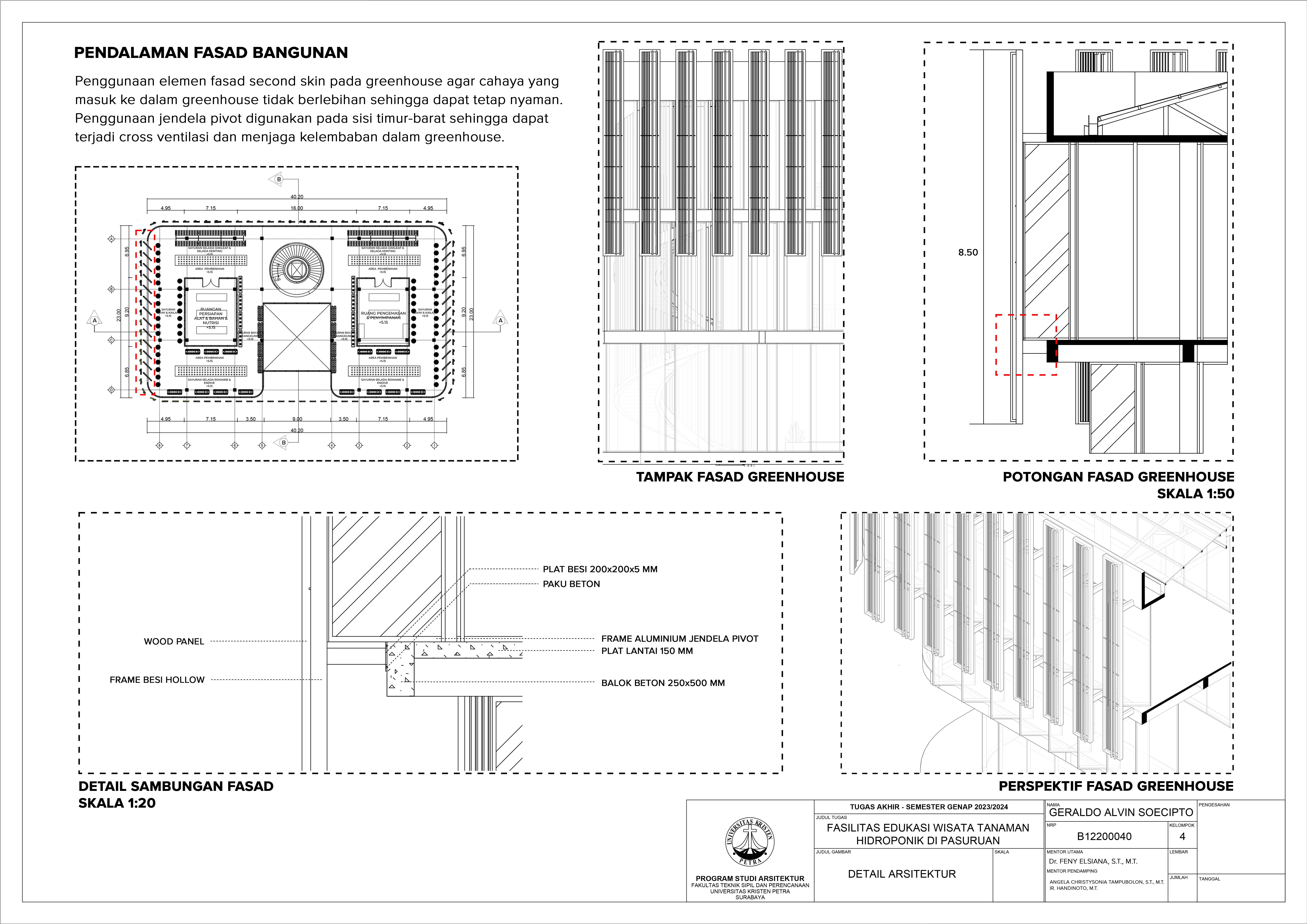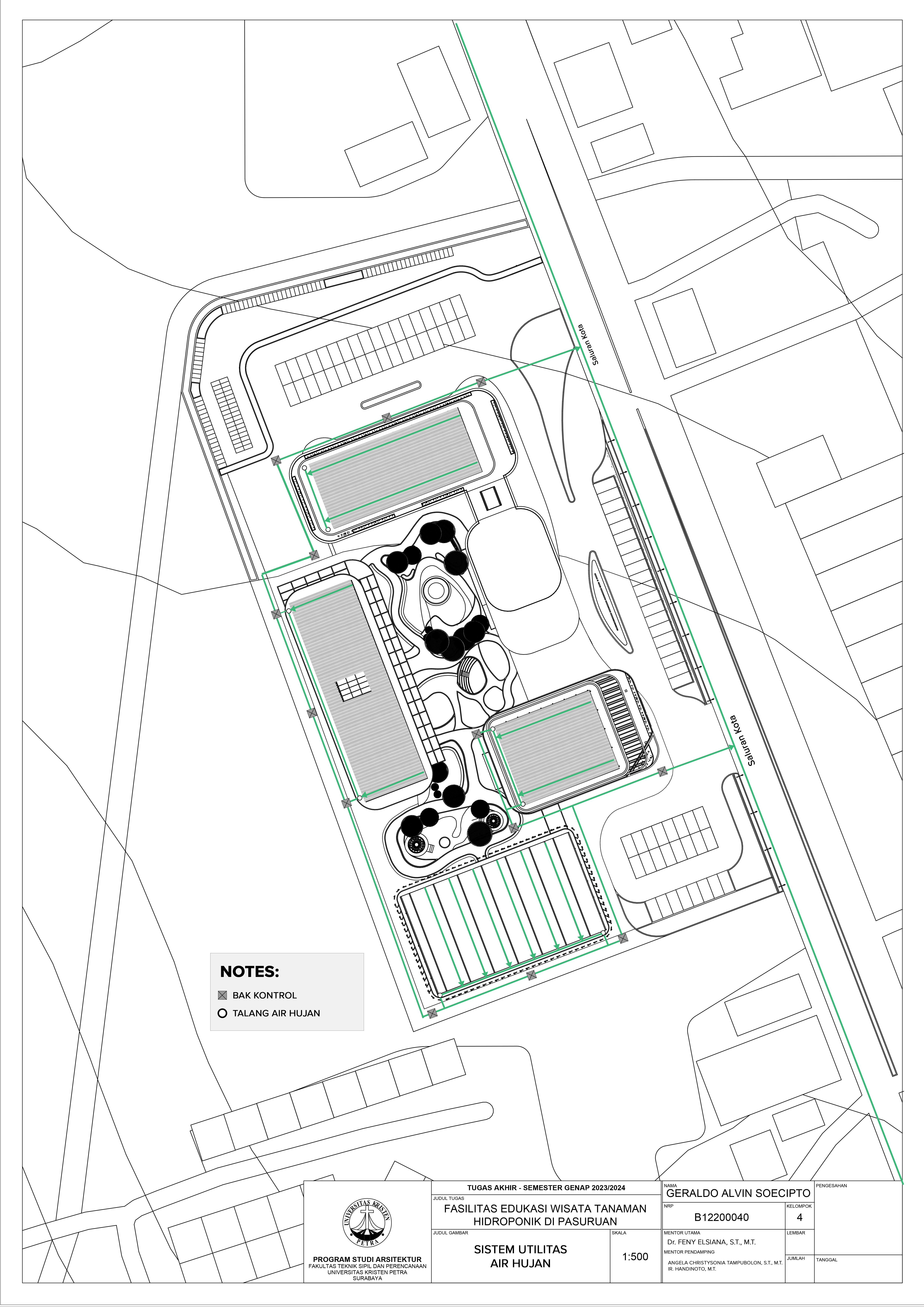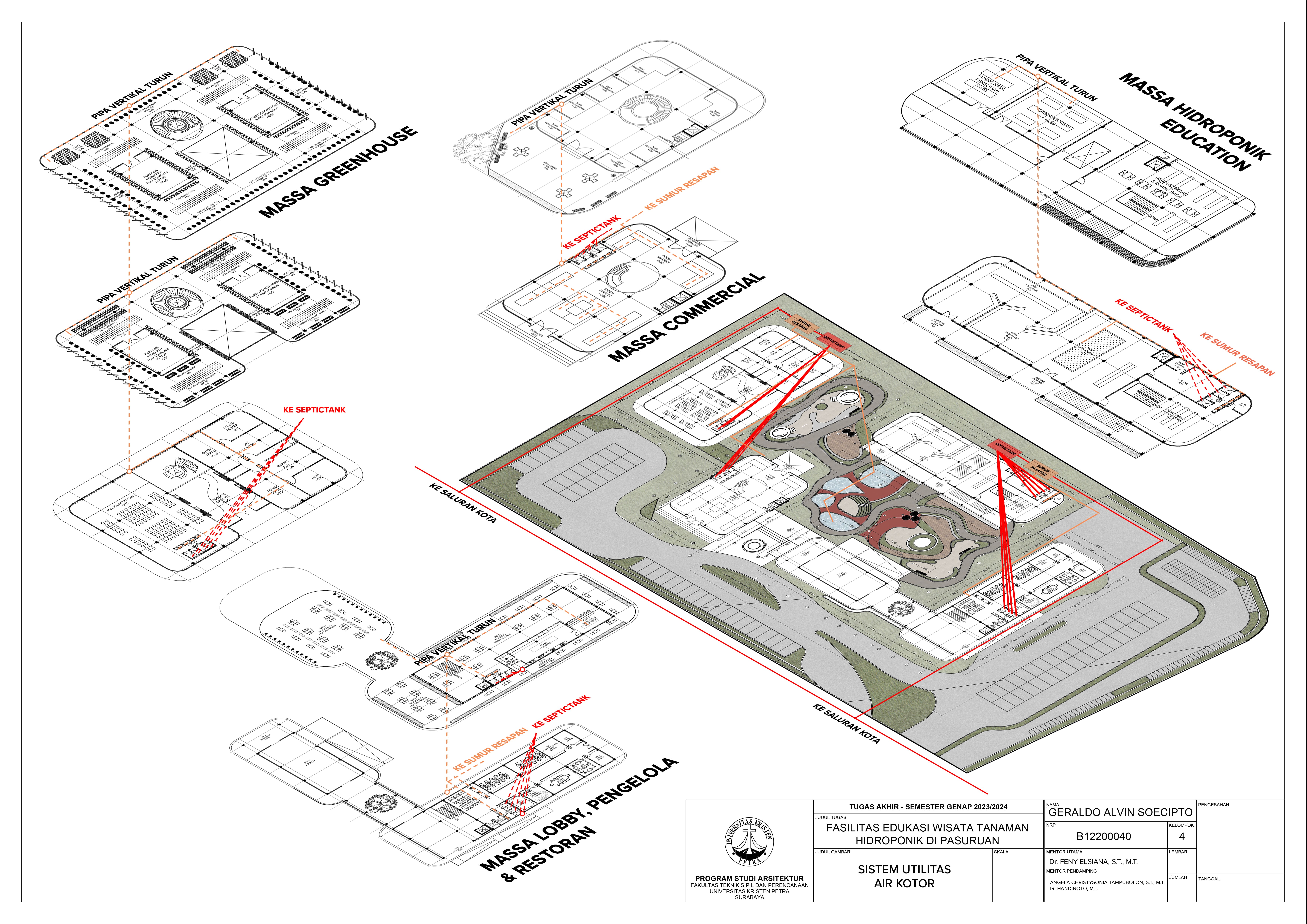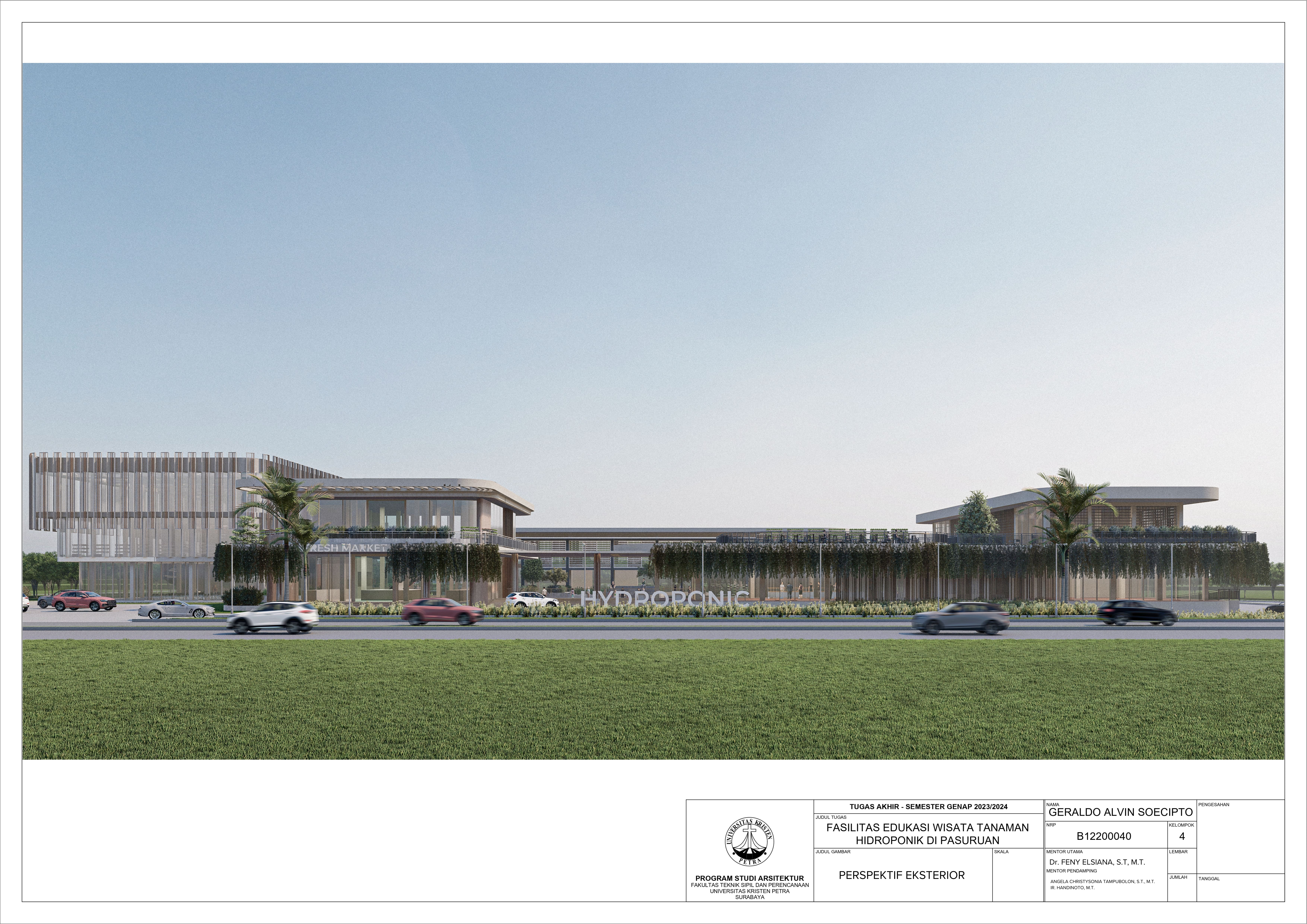 Ketahanan pangan menjadi suatu bencana yang mulai mengancam Indonesia. Hal ini dikarenakan oleh produksi bahan pangan yang rendah, tingginya alih fungsi lahan pertanian ke non-pertanian, dan pertumbuhan penduduk yang tinggi disertai dengan permintaan pangan yang terus meningkat tidak sesuai dengan produksinya. Melihat kondisi ini, budidaya tanaman hidroponik menjadi solusi yang tepat dalam mengatasi permasalahan ini karena dapat memaksimalkan lahan yang ada untuk memproduksi bahan makanan secara berkelanjutan. Namun, pengetahuan masyarakat tentang tanaman hidroponik masih tergolong rendah, sehingga dicetuskan rencana pembangunan fasilitas edukasi wisata tanaman hidroponik. Fasilitas ini memberikan edukasi yang disertai dengan praktek langsung mengenai budidaya tanaman hidroponik dan dapat menjadi destinasi wisata baru bagi masyarakat. Masyarakat akan diberikan edukasi mulai dari tahap pembenihan, pindah tanam, pemberian nutrisi, hingga panen dengan beberapa sistem hidroponik yang ada. Nantinya, fasilitas ini juga dapat meningkatkan minat masyarakat untuk berbudidaya tanaman hidroponik. Dari perencanaan desain, pendekatan yang digunakan adalah pendekatan sains menggunakan teori Arsitektur Bioklimatik. Tujuannya untuk menciptakan bangunan yang dapat beradaptasi dengan kondisi iklim dan lingkungan sehingga dapat memberikan kenyamanan bagi pengunjung. Pendekatan ini diterapkan pada elemen fasad, material, dan atap bangunan. Selain itu, pengaturan elemen alami seperti cahaya matahari, udara, pergerakan angin, dan vegetasi juga diperhatikan agar dapat mengoptimalkan pertumbuhan tanaman hidroponik.