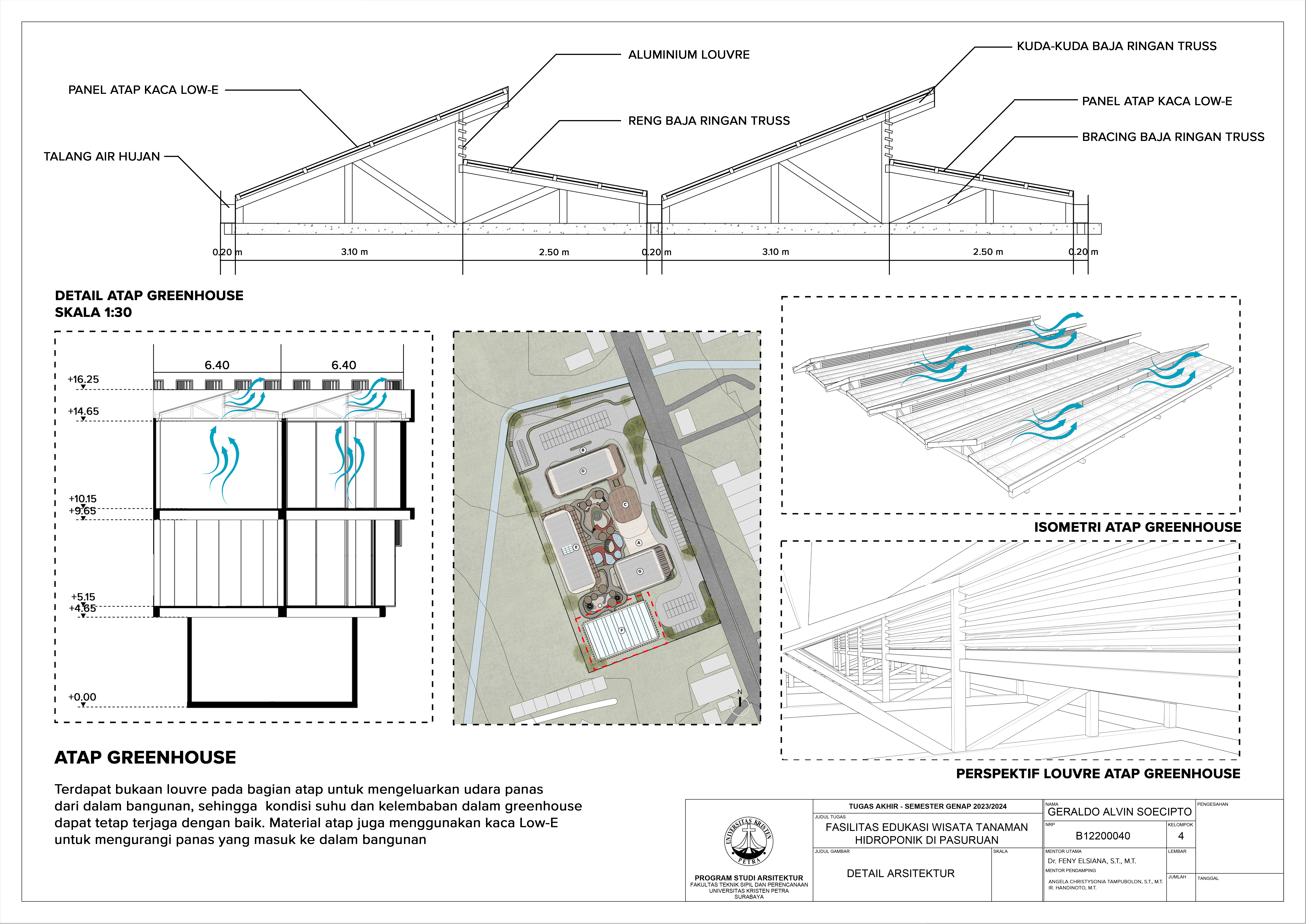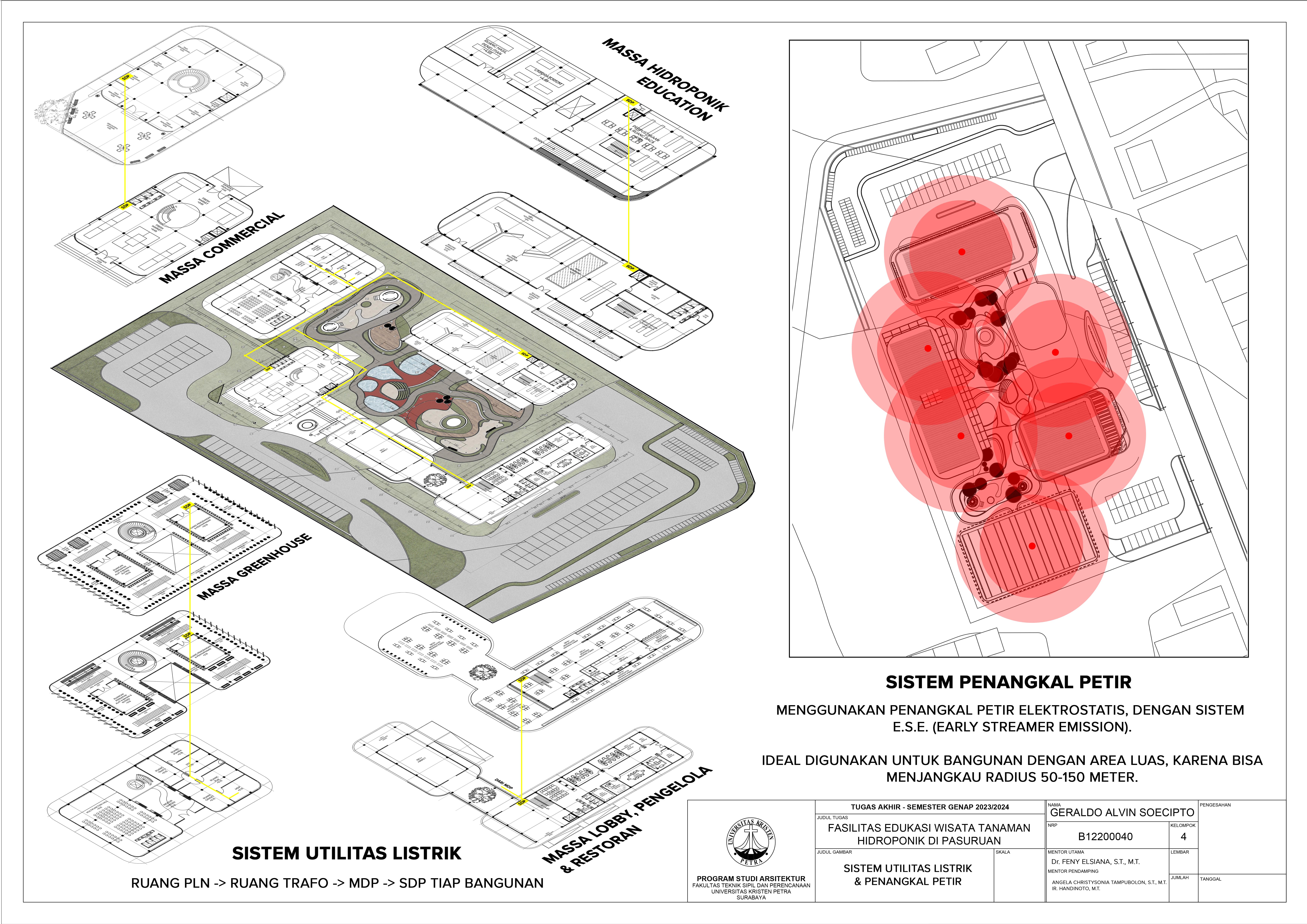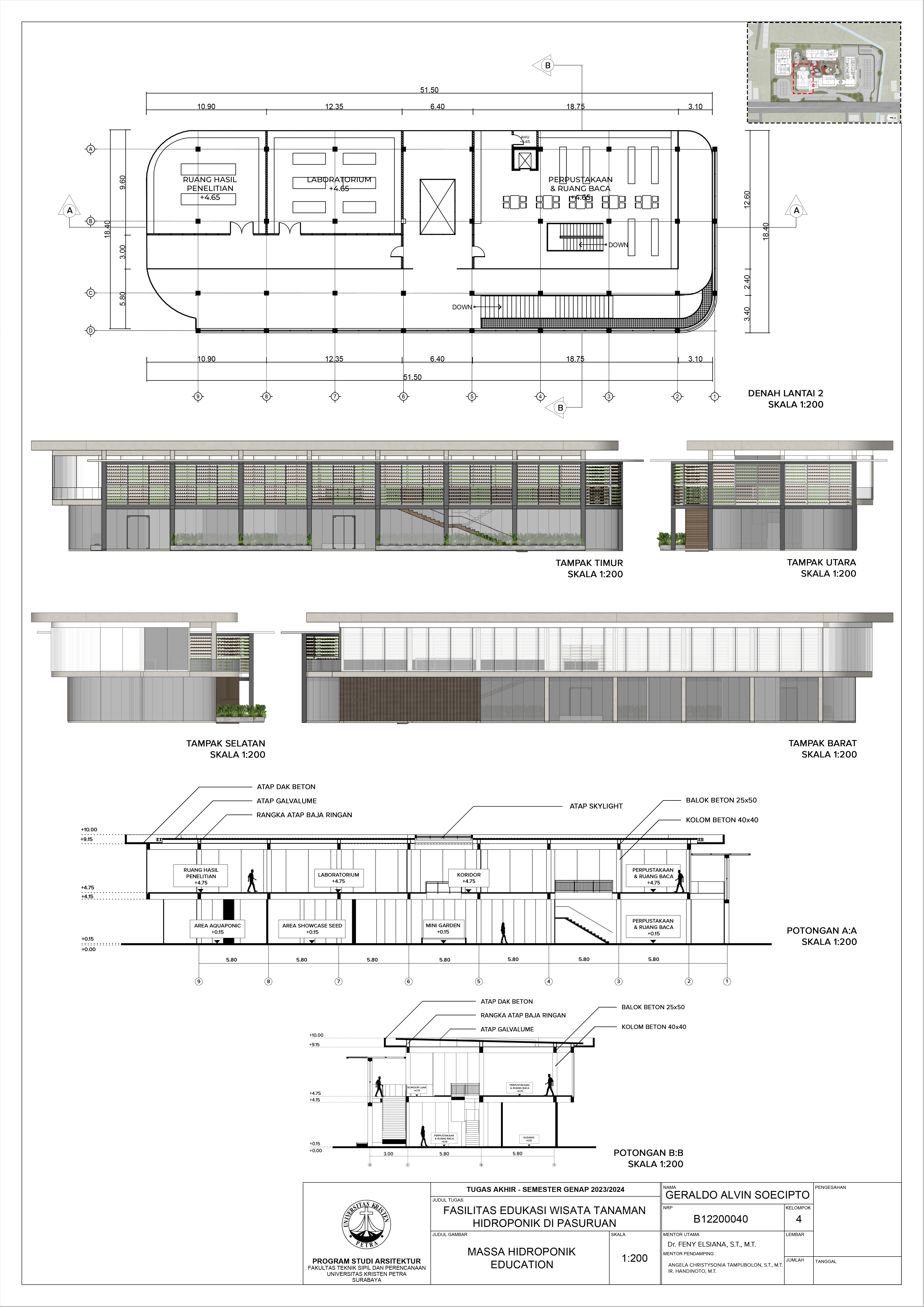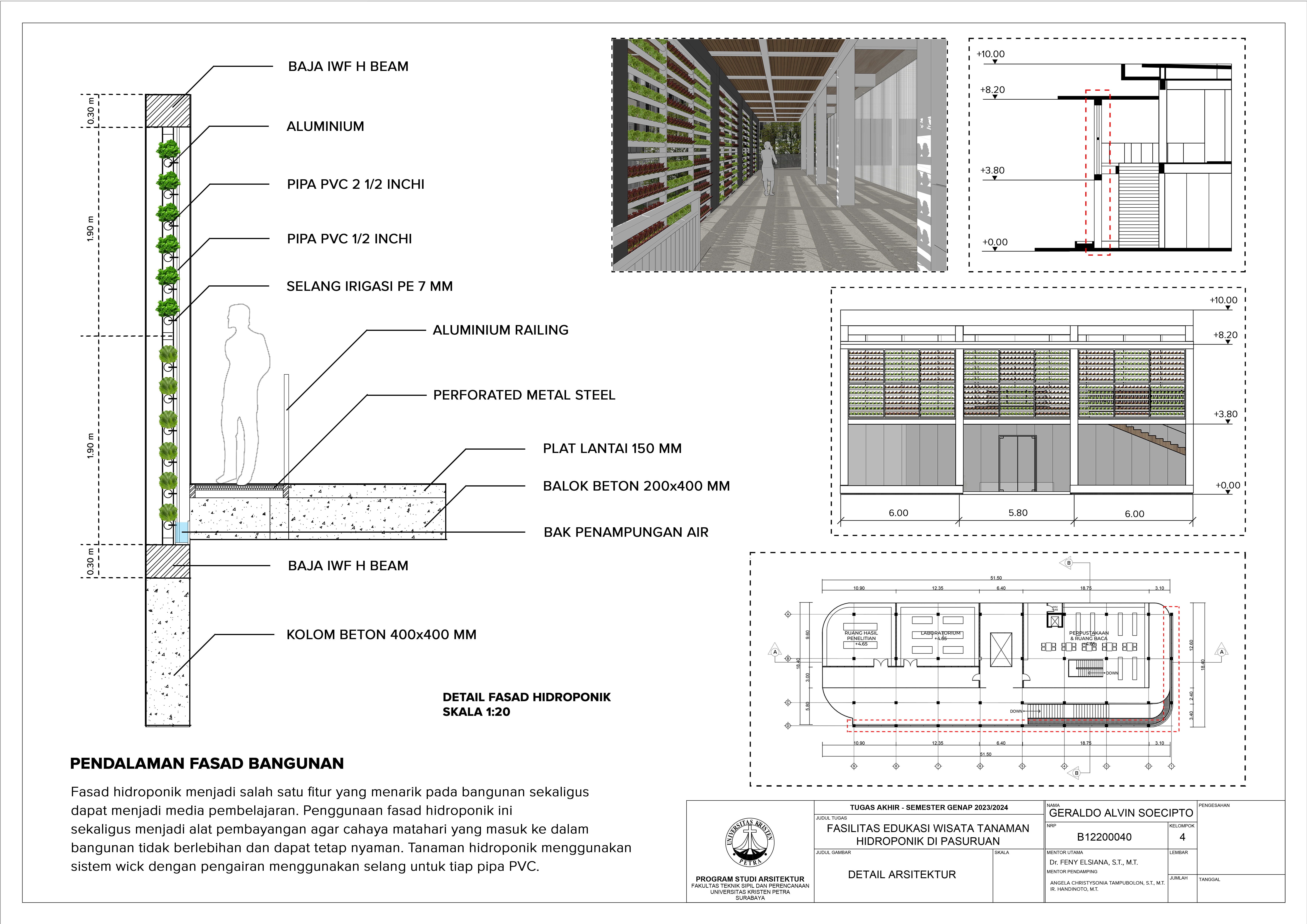 Ketahanan pangan menjadi suatu bencana yang mulai mengancam Indonesia. Hal ini dikarenakan oleh produksi bahan pangan yang rendah, tingginya alih fungsi lahan pertanian ke non-pertanian, dan pertumbuhan penduduk yang tinggi disertai dengan permintaan pangan yang terus meningkat tidak sesuai dengan produksinya. Melihat kondisi ini, budidaya tanaman hidroponik menjadi solusi yang tepat dalam mengatasi permasalahan ini karena dapat memaksimalkan lahan yang ada untuk memproduksi bahan makanan secara berkelanjutan. Namun, pengetahuan masyarakat tentang tanaman hidroponik masih tergolong rendah, sehingga dicetuskan rencana pembangunan fasilitas edukasi wisata tanaman hidroponik. Fasilitas ini memberikan edukasi yang disertai dengan praktek langsung mengenai budidaya tanaman hidroponik dan dapat menjadi destinasi wisata baru bagi masyarakat. Masyarakat akan diberikan edukasi mulai dari tahap pembenihan, pindah tanam, pemberian nutrisi, hingga panen dengan beberapa sistem hidroponik yang ada. Nantinya, fasilitas ini juga dapat meningkatkan minat masyarakat untuk berbudidaya tanaman hidroponik. Dari perencanaan desain, pendekatan yang digunakan adalah pendekatan sains menggunakan teori Arsitektur Bioklimatik. Tujuannya untuk menciptakan bangunan yang dapat beradaptasi dengan kondisi iklim dan lingkungan sehingga dapat memberikan kenyamanan bagi pengunjung. Pendekatan ini diterapkan pada elemen fasad, material, dan atap bangunan. Selain itu, pengaturan elemen alami seperti cahaya matahari, udara, pergerakan angin, dan vegetasi juga diperhatikan agar dapat mengoptimalkan pertumbuhan tanaman hidroponik.