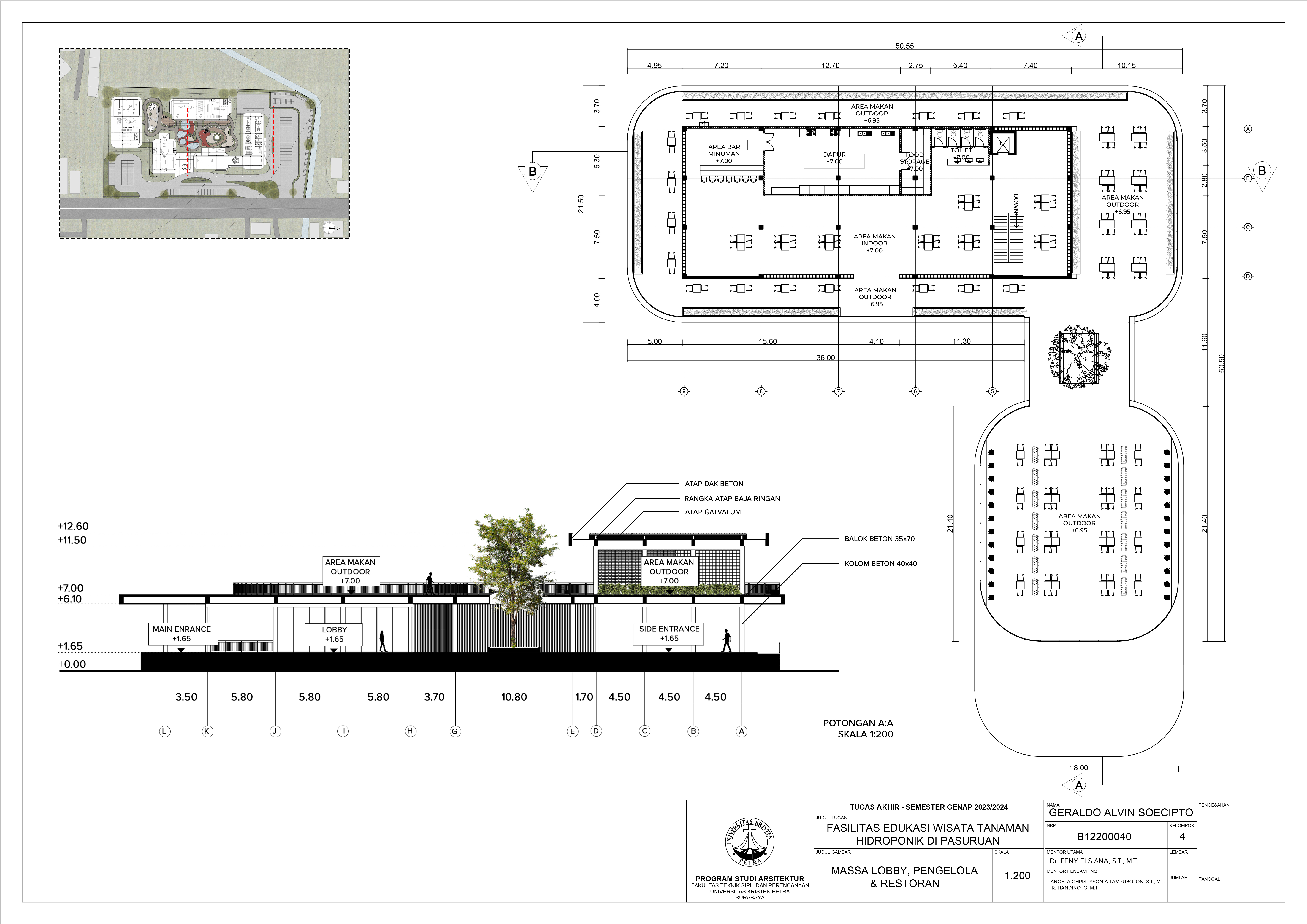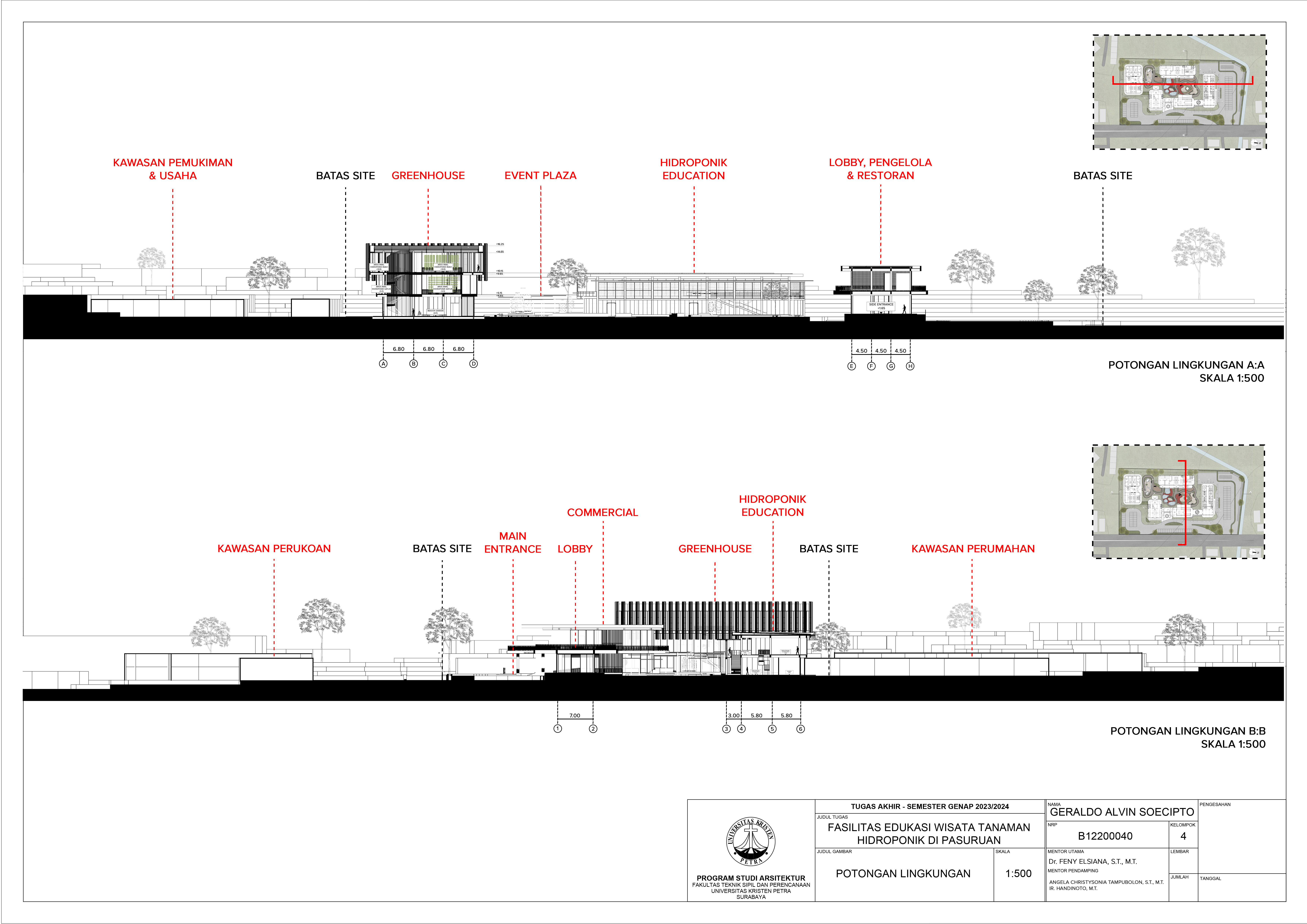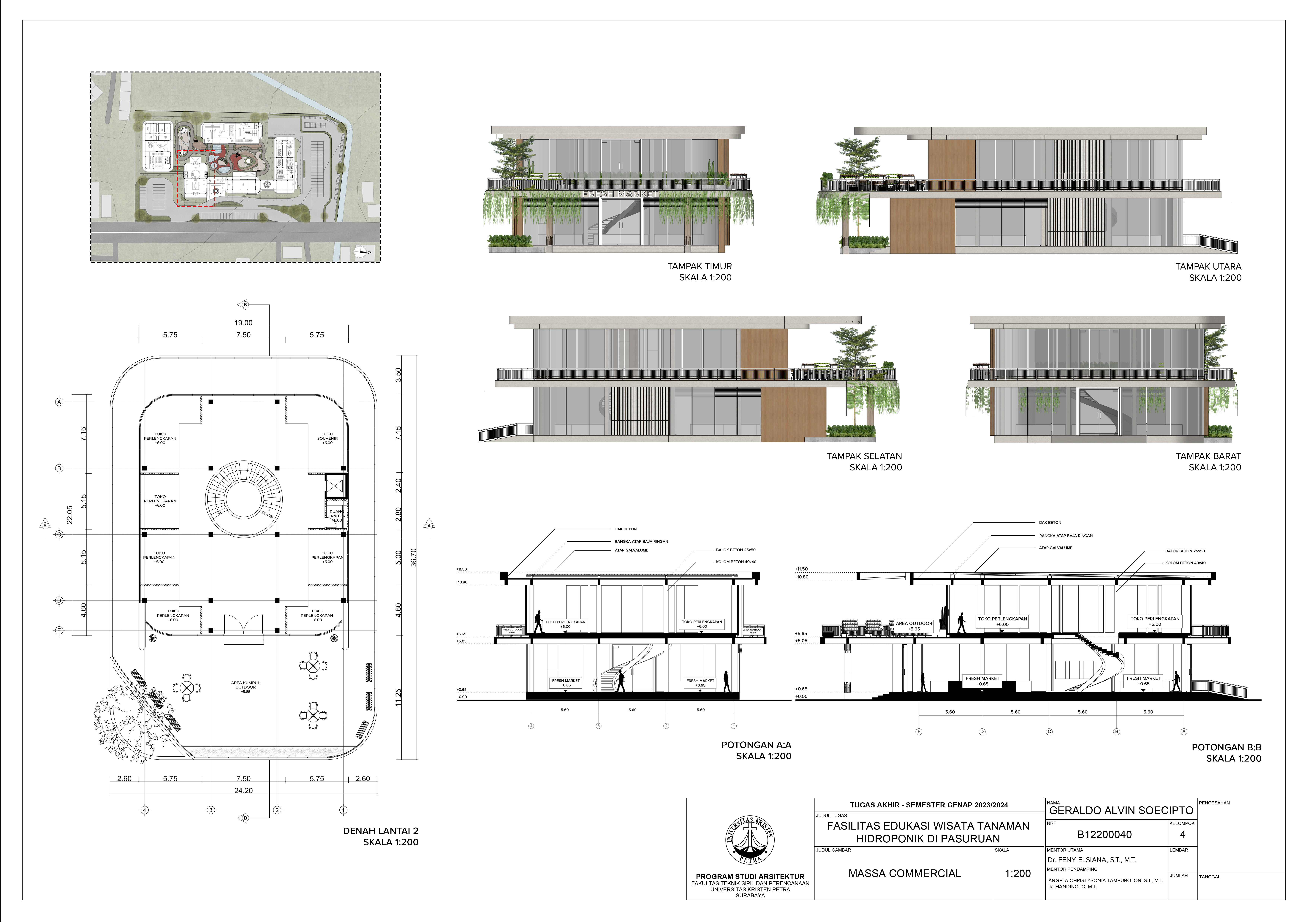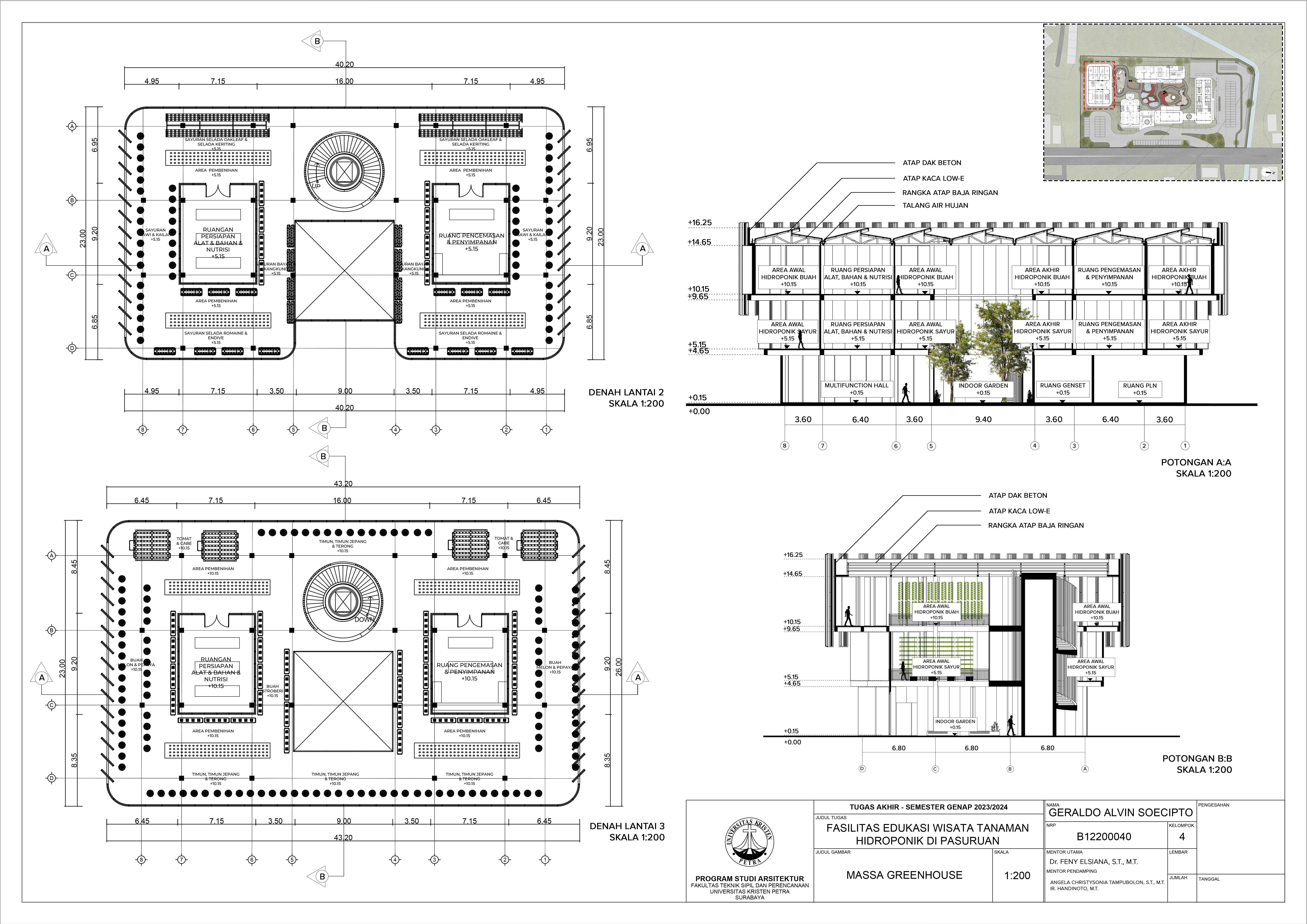 Ketahanan pangan menjadi suatu bencana yang mulai mengancam Indonesia. Hal ini dikarenakan oleh produksi bahan pangan yang rendah, tingginya alih fungsi lahan pertanian ke non-pertanian, dan pertumbuhan penduduk yang tinggi disertai dengan permintaan pangan yang terus meningkat tidak sesuai dengan produksinya. Melihat kondisi ini, budidaya tanaman hidroponik menjadi solusi yang tepat dalam mengatasi permasalahan ini karena dapat memaksimalkan lahan yang ada untuk memproduksi bahan makanan secara berkelanjutan. Namun, pengetahuan masyarakat tentang tanaman hidroponik masih tergolong rendah, sehingga dicetuskan rencana pembangunan fasilitas edukasi wisata tanaman hidroponik. Fasilitas ini memberikan edukasi yang disertai dengan praktek langsung mengenai budidaya tanaman hidroponik dan dapat menjadi destinasi wisata baru bagi masyarakat. Masyarakat akan diberikan edukasi mulai dari tahap pembenihan, pindah tanam, pemberian nutrisi, hingga panen dengan beberapa sistem hidroponik yang ada. Nantinya, fasilitas ini juga dapat meningkatkan minat masyarakat untuk berbudidaya tanaman hidroponik. Dari perencanaan desain, pendekatan yang digunakan adalah pendekatan sains menggunakan teori Arsitektur Bioklimatik. Tujuannya untuk menciptakan bangunan yang dapat beradaptasi dengan kondisi iklim dan lingkungan sehingga dapat memberikan kenyamanan bagi pengunjung. Pendekatan ini diterapkan pada elemen fasad, material, dan atap bangunan. Selain itu, pengaturan elemen alami seperti cahaya matahari, udara, pergerakan angin, dan vegetasi juga diperhatikan agar dapat mengoptimalkan pertumbuhan tanaman hidroponik.