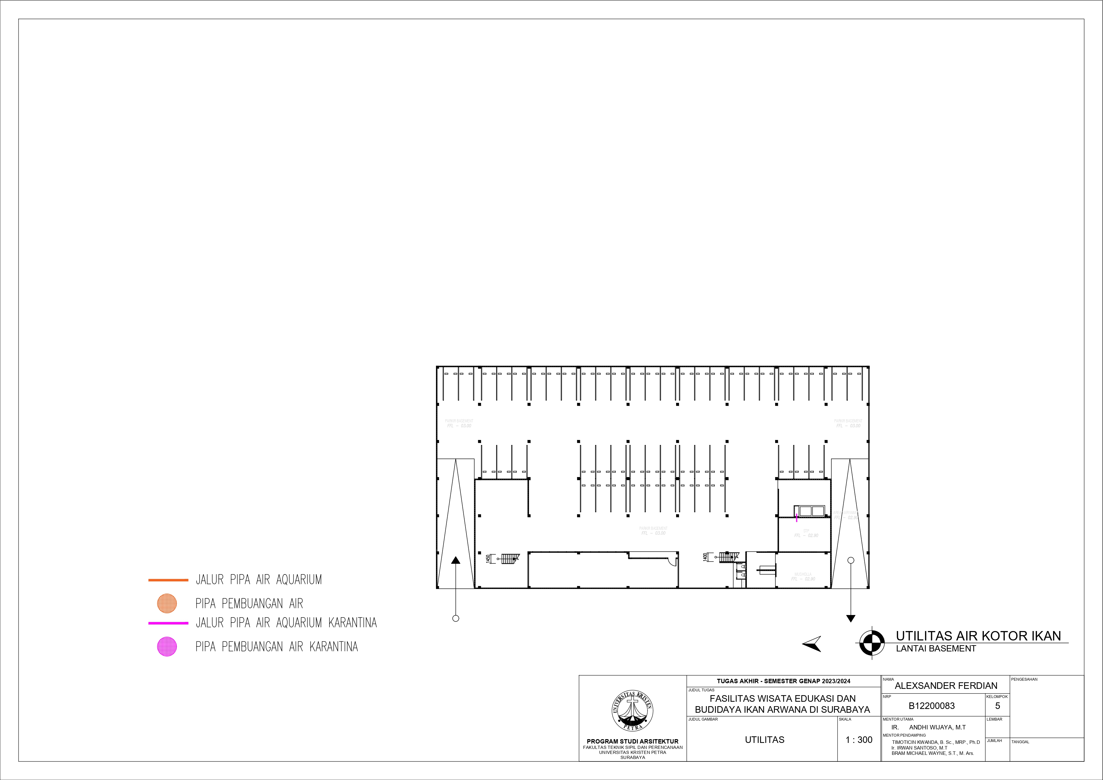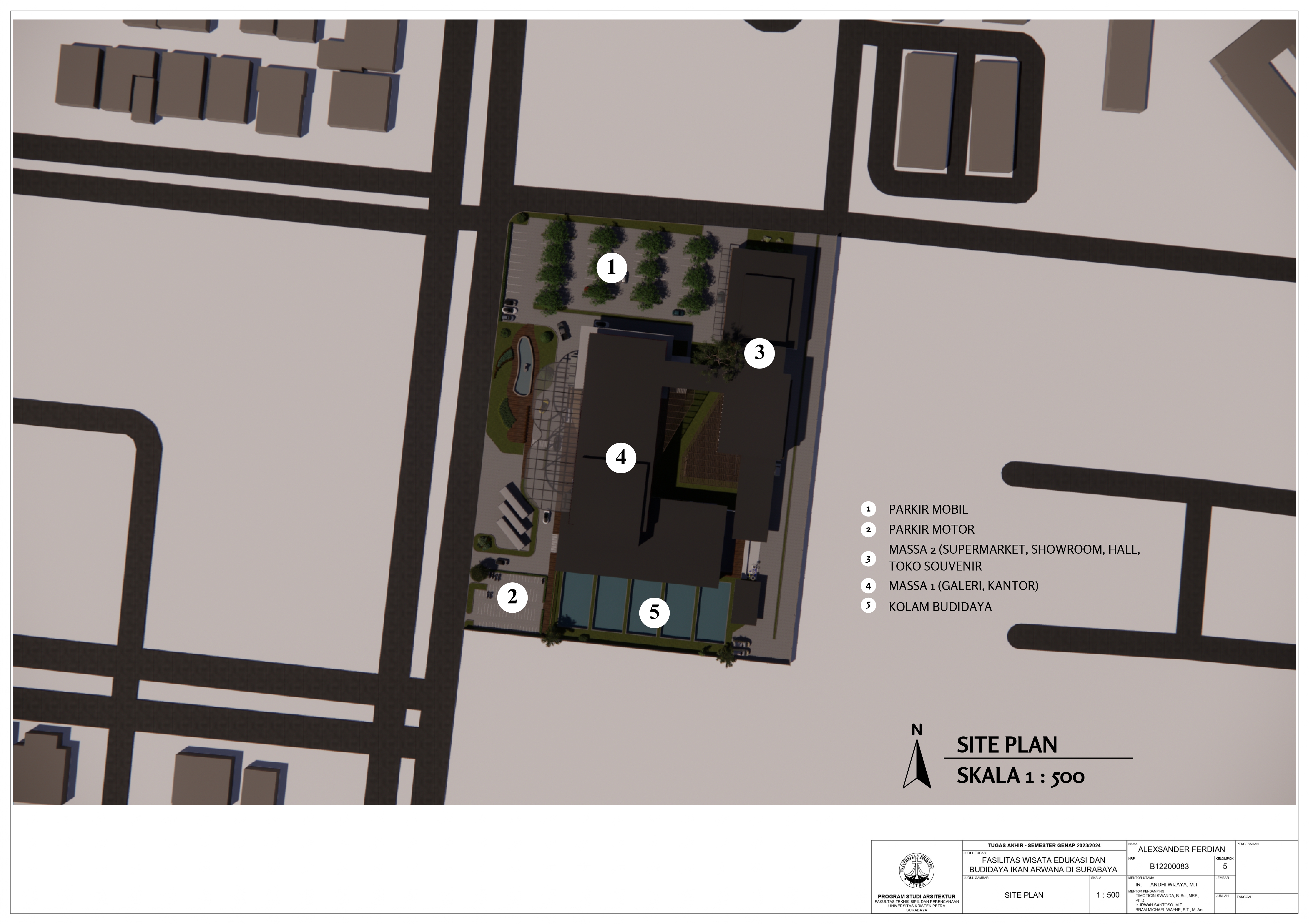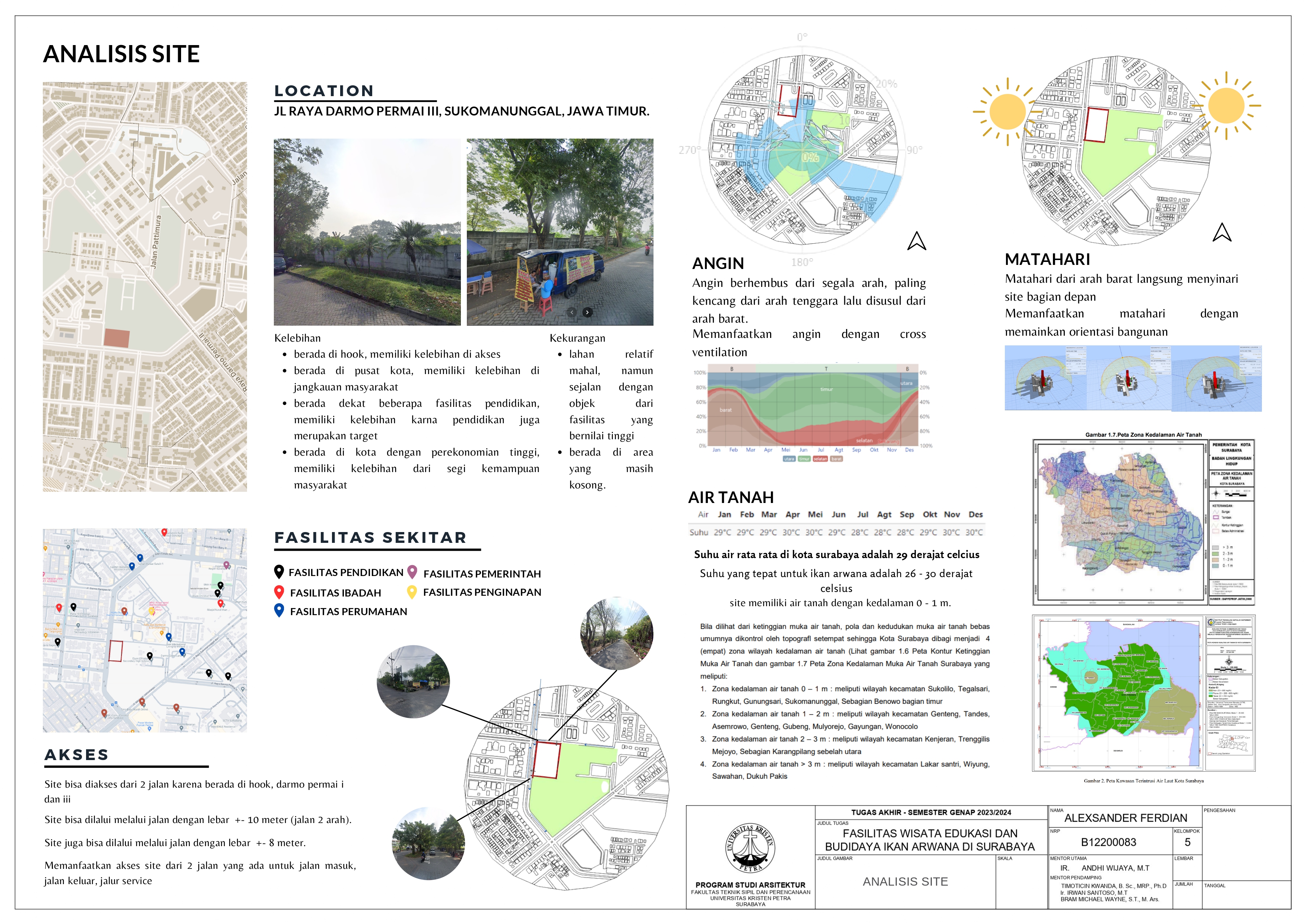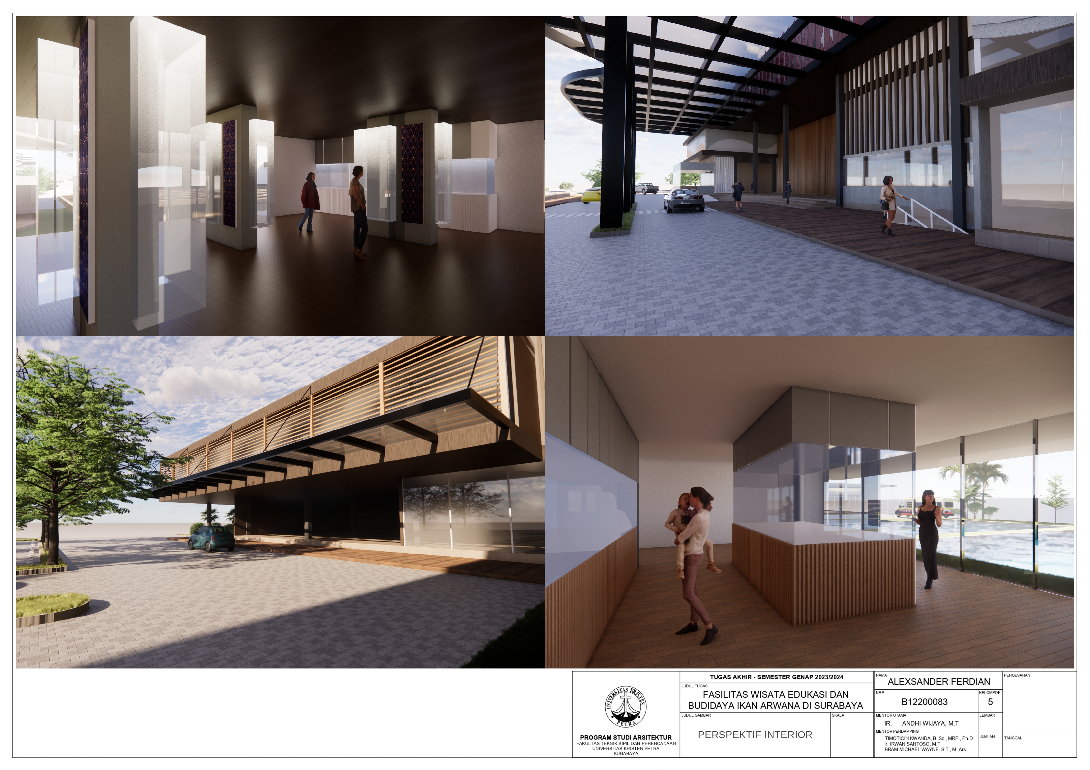 Ikan arwana adalah salah satu ikan hias yang sangat digemari masyarakat. Ikan arwana memiliki histori sebagai ikan pangan yang berkembang menjadi ikan hias yang sangat populer dan mahal. Ikan arwana memiliki julukan sebagai “Raja Ikan Hias” karena keindahannya. Dengan naiknya popularitas ikan arwana sebagai ikan hias membuat masyarakat memburu ikan arwana secara besar-besaran, sehingga populasi ikan arwana semakin menurun. Seiring berjalannya waktu upaya-upaya penangkaran berhasil dilakukan sehingga populasi ikan arwana bisa dikontrol. Namun, penangkaran-penangkaran dan fasilitas untuk ikan arwana belum tersebar secara merata di Indonesia. Fasilitas Wisata Edukasi dan Budidaya Ikan Arwana di Surabaya hadir untuk memfasilitasi kebutuhan masyarakat kota Surabaya. Perencanaan fasilitas ini bertujuan untuk memberikan edukasi kepada masyarakat serta memberikan fasilitas untuk masyarakat menyalurkan hobi di bidang ikan arwana. Fasilitas akan menghadirkan sebuah galeri untuk pembelajaran tentang ikan arwana dan menghadirkan fasilitas budidaya untuk masyarakat menyalurkan hobi. Dalam proses desain, fasilitas ini menggunakan pendekatan utilitas dengan konsep hemat energi. Pendekatan utilitas digunakan untuk memaksimalkan penggunaan energi dengan memanfaatkan desain bangunan dengan alam.