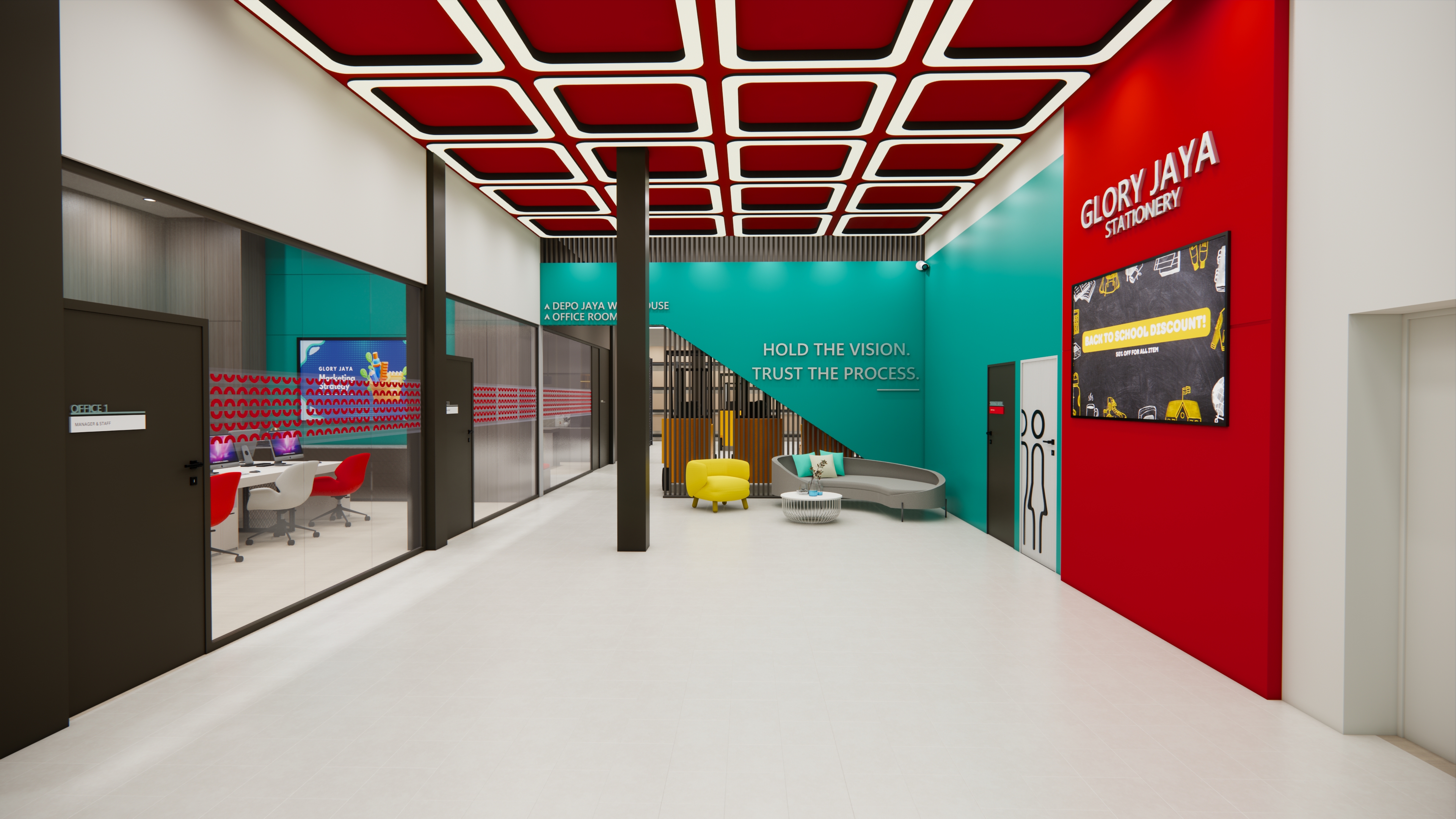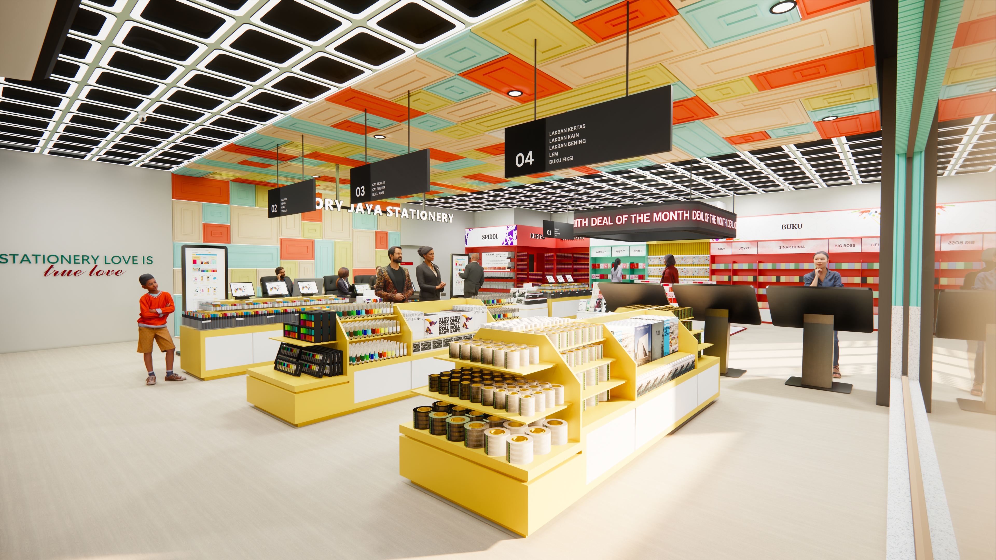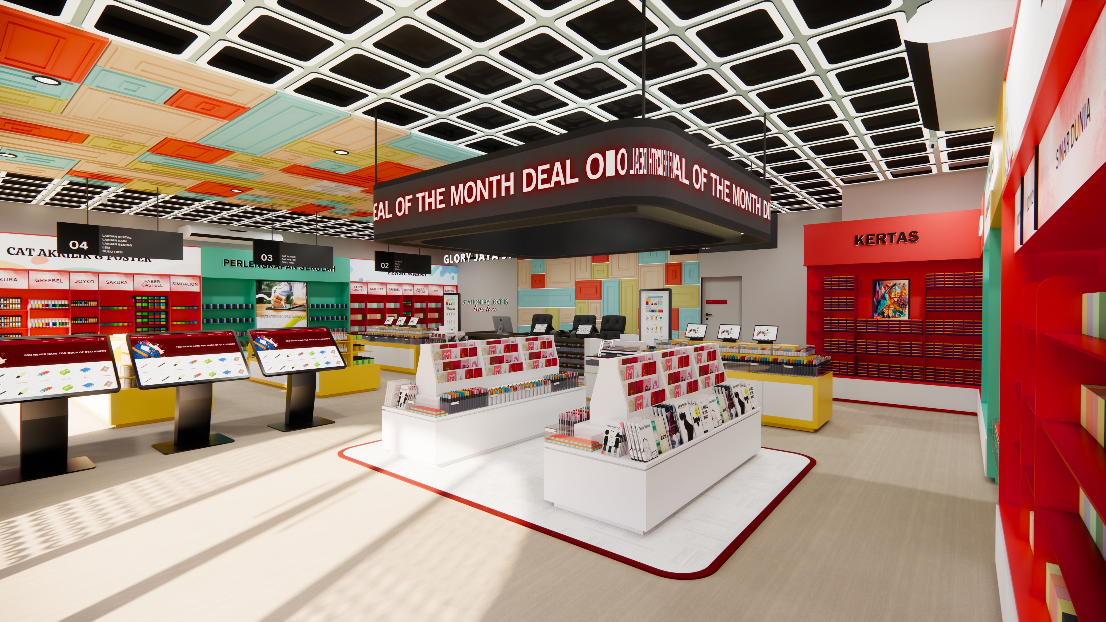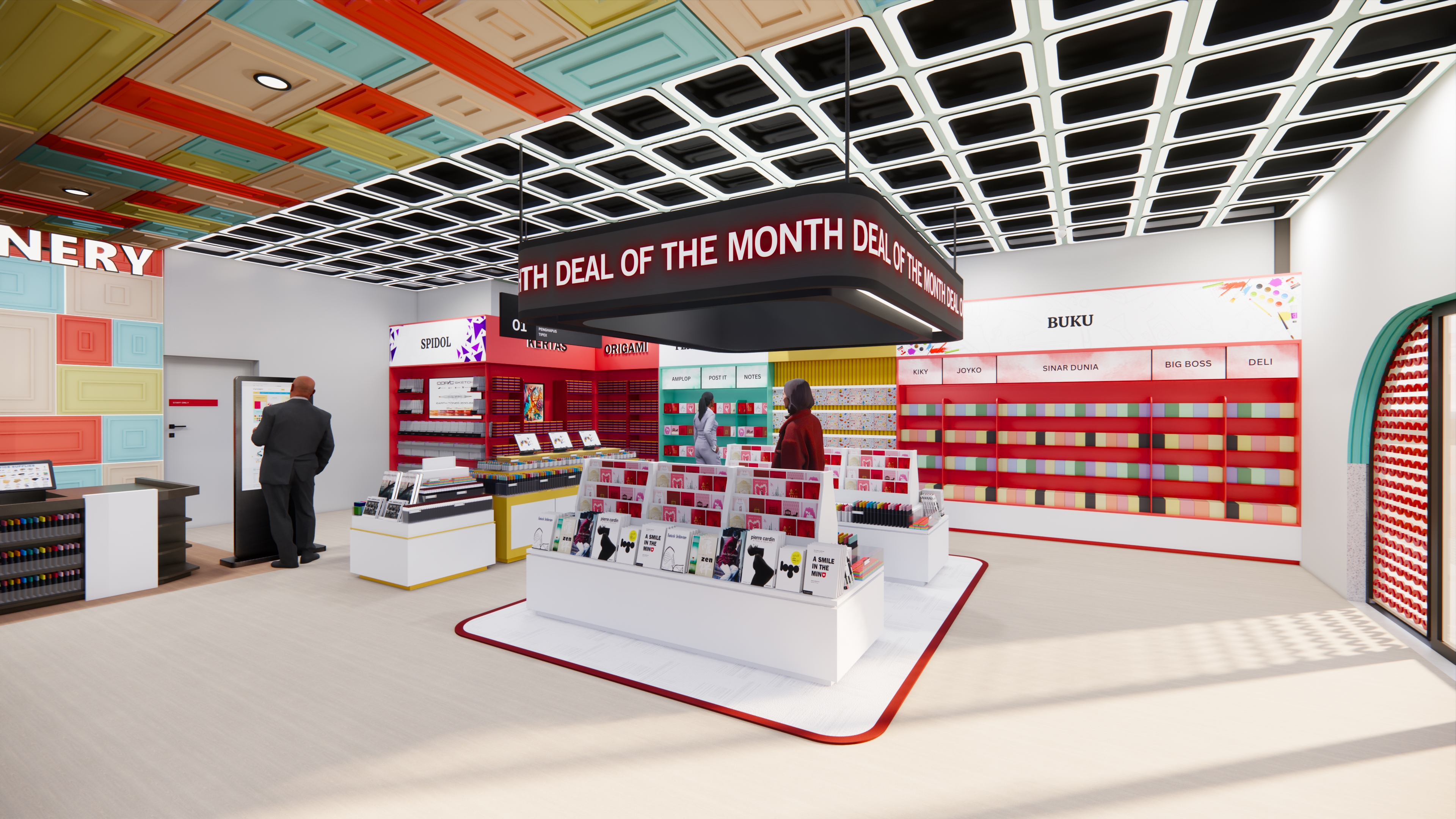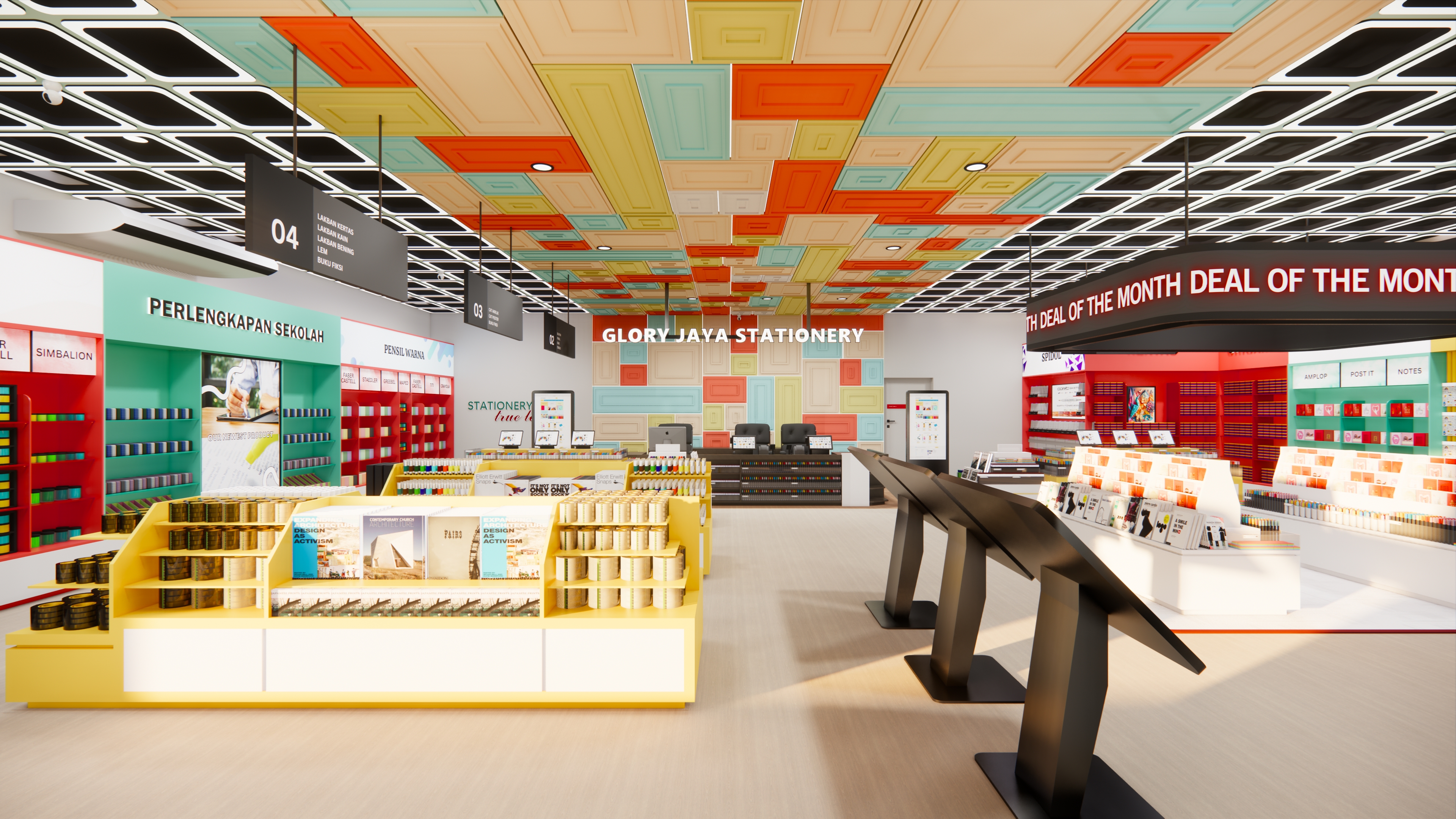 Semakin berkembangnya zaman, semakin mendorong desainer dalam menciptakan desain yang tidak mudah termakan waktu namun tetap menarik pengguna. Menarik dapat memiliki banyak makna, salah satunya ialah dapat menjawab permasalahan desain seperti kebutuhan ruang, keinginan ruang, bahkan konsep tata ruang. Tidak hanya itu, desainer juga dituntut untuk menciptakan desain yang meningkatkan efektivitas serta produktivitas kerja, namun tidak mudah termakan waktu. Smart technology design merupakan salah satu solusi yang mampu menjawab permasalahan tersebut, dengan melakukan adaptasi dari smart material, devices, hingga sensors serta mengutamakan kenyamanan pengguna dan fleksibilitas ruang. Sama halnya dengan perkembangan desain yang ada, perkembangan bisnis ritel di Indonesia juga semakin berkembang pesat. Hal tersebut menimbulkan dampak seperti persaingan antar bisnis hingga perubahan pembeli dalam berbelanja. Maka dari itu, setiap bisnis ritel diharapkan dapat memiliki strategi dan daya tariknya sendiri dalam menarik konsumen. Penelitian ini dilakukan menggunakan desain dengan terapan smart technology pada Glory Jaya Stationery Store, yang merupakan sebuah toko ritel bidang alat tulis dan kantor. Metode desain yang digunakan adalah understand, observe, point of view, ideate, prototype, test, story telling, pilot, dan business model. Tujuan penelitian ini adalah mampu menjawab permasalahan yang ada yaitu dengan menghasilkan desain stationery store yang nyaman dan dapat menarik perhatian pengunjung, serta menerapkan smart technology. Hasil dari penelitian ini adalah 1 set desain interior dengan terapan smart technology yang dapat membantu meningkatkan kenyamanan pengguna ruang, serta meningkatkan daya tarik dari toko ritel.