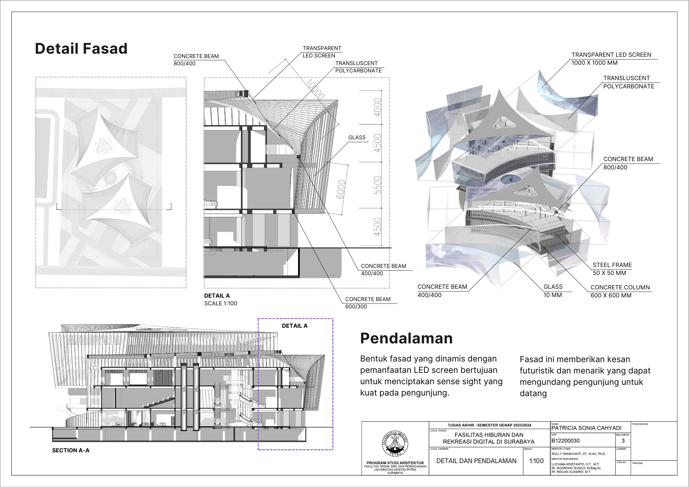 Surabaya merupakan kota dengan pertumbuhan penduduk yang tinggi namun menghadapi tingkat stres yang signifikan; sehingga membutuhkan tempat hiburan dan rekreasi positif dan aktif. Dalam menghadapi tuntutan ini, teknologi digital memainkan peran penting seiring dengan perkembangan zaman yang terus berlangsung. Tujuan dari laporan ini adalah mengusulkan desain arsitektur untuk fasilitas hiburan dan rekreasi digital di Surabaya dengan pendekatan multisensori. Pendekatan multisensori adalah pendekatan arsitektur berbasis pengalaman ruang yang memperhatikan keharmonisan berbagai indra (sensori). Metode perancangan yang dipakai melalui studi fungsional dan arsitektur pada bangunan preseden, dan sintesa hasil analisis tapak, konsep desain, dan program ruang. Konsep desain bangunan ini adalah sensory scape, yang bertujuan untuk menciptakan pengalaman multisensori yang mendalam bagi para pengunjung. Desain bangunan memberikan kesempatan pada setiap pengunjung untuk menikmati momen pemulihan dan kesenangan yang akan menyegarkan pikiran dan tubuh. Fasilitas terbagi menjadi tujuh zona utama yaitu makanan, film, olahraga, musik, pertunjukan, permaian, dan seni. Setiap zona dirancang dengan memanfaatkan teknologi digital secara optimal, sehingga dapat memberikan pengalaman interaktif dan menarik bagi masyarakat. Hasil rancangan yang menekankan pada pengolahan ruang publik dengan memanfaatkan teknologi digital ini diharapkan dapat memberikan usulan desain untuk menurunkan tingkat stres para pelajar dan pekerja di kota Surabaya.