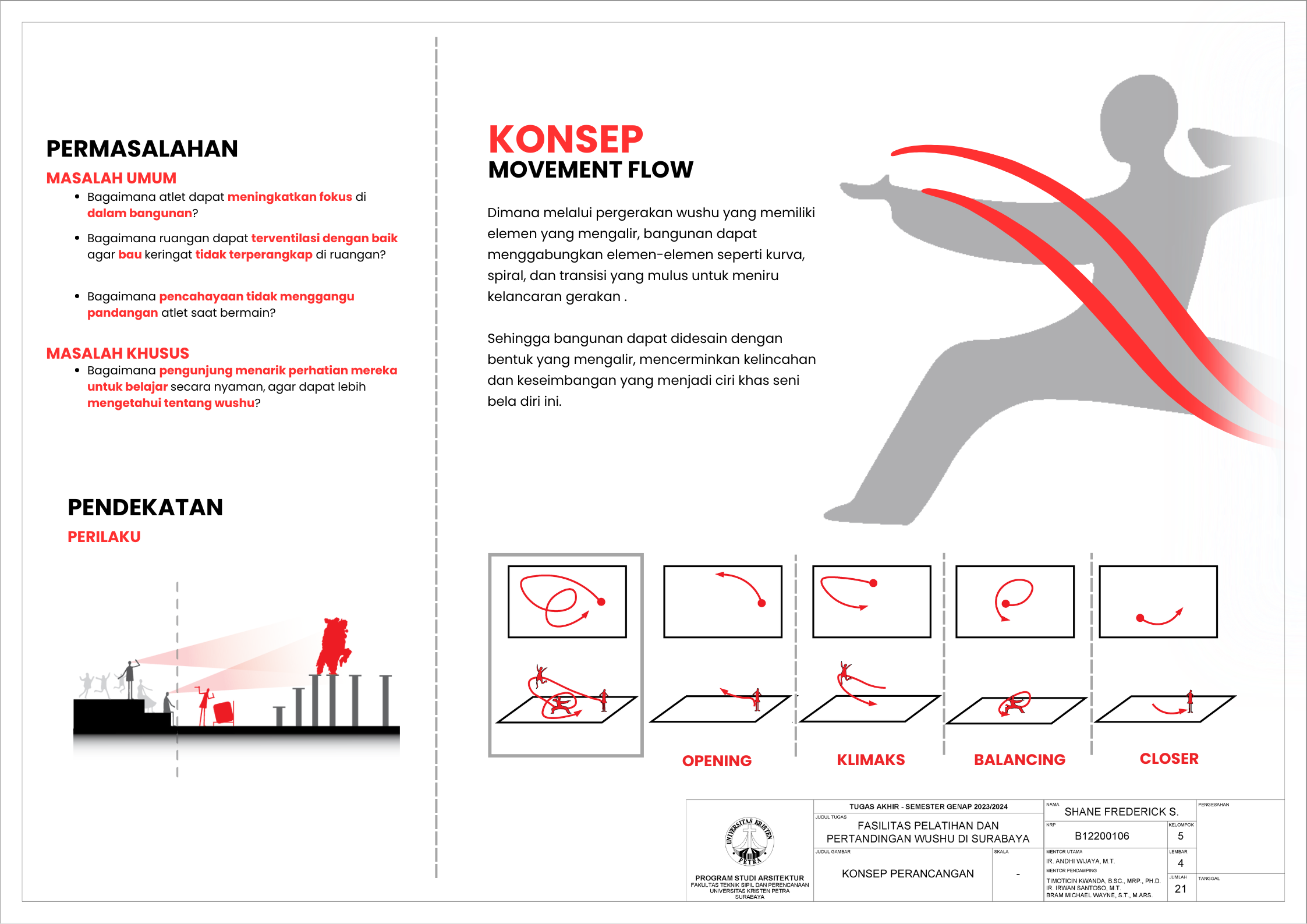 Wushu adalah sebuah seni bela diri berasal dari China, yang telah menjelma menjadi daya tarik khusus di Indonesia. Di kota Surabaya menjadi pusat utama minat wushu di Indonesia, terutama untuk kalangan generasi muda. Lebih dari sekadar bela diri atau pencapaian, wushu juga sebagai olahraga rekreasi dan kebugaran yang tak hanya meningkatkan kesehatan fisik tetapi juga membawa nilai-nilai disiplin, kontrol diri, dan pengembangan aspek mental. Meskipun popularitas wushu terus berkembang namun, masih terdapat sejumlah tantangan, seperti kurangnya infrastruktur pelatihan yang memadai, kesadaran masyarakat yang perlu ditingkatkan, kurangnya koordinasi, dan kurangnya perhatian terhadap keselamatan atlet. Perancangan fasilitas pelatihan dan pertandingan wushu bertujuan memenuhi kebutuhan atlet untuk dapat menunjang perfoma mereka menjadi lebih baik. Selain itu, fasilitas juga dirancang untuk memberikan pendidikan dan pengalaman pengunjung, terutama untuk menarik minat generasi muda. Pendekatan yang digunakan adalah pendekatan perilaku. Pendekatan tersebut diterapkan dengan memahami pola perilaku atlet saat berlatih, serta perilaku pengunjung pada saat ingin mengetahui tentang wushu. Dengan memahami pola perilaku atlet dan pengunjung, fasilitas bertujuan untuk menciptakan ruang yang memiliki alur yang nyaman dan baik untuk kedua pihak.