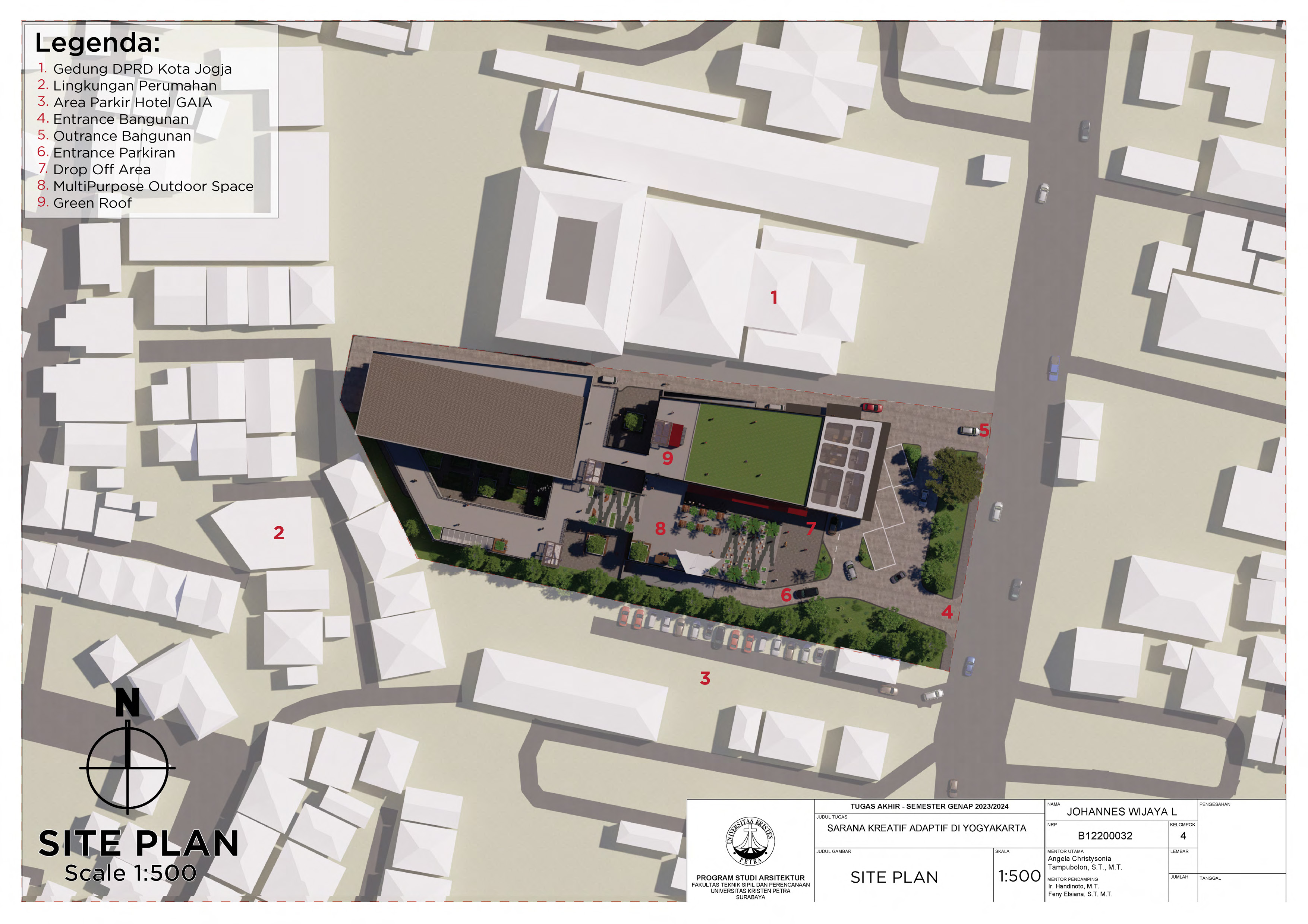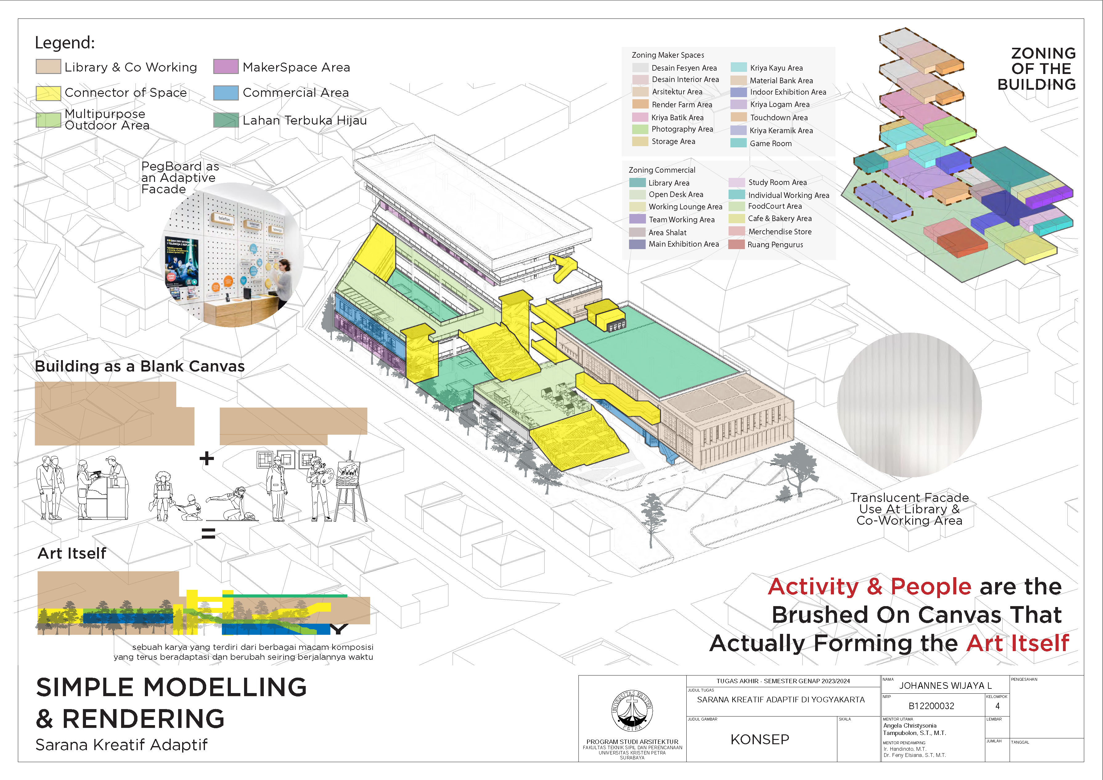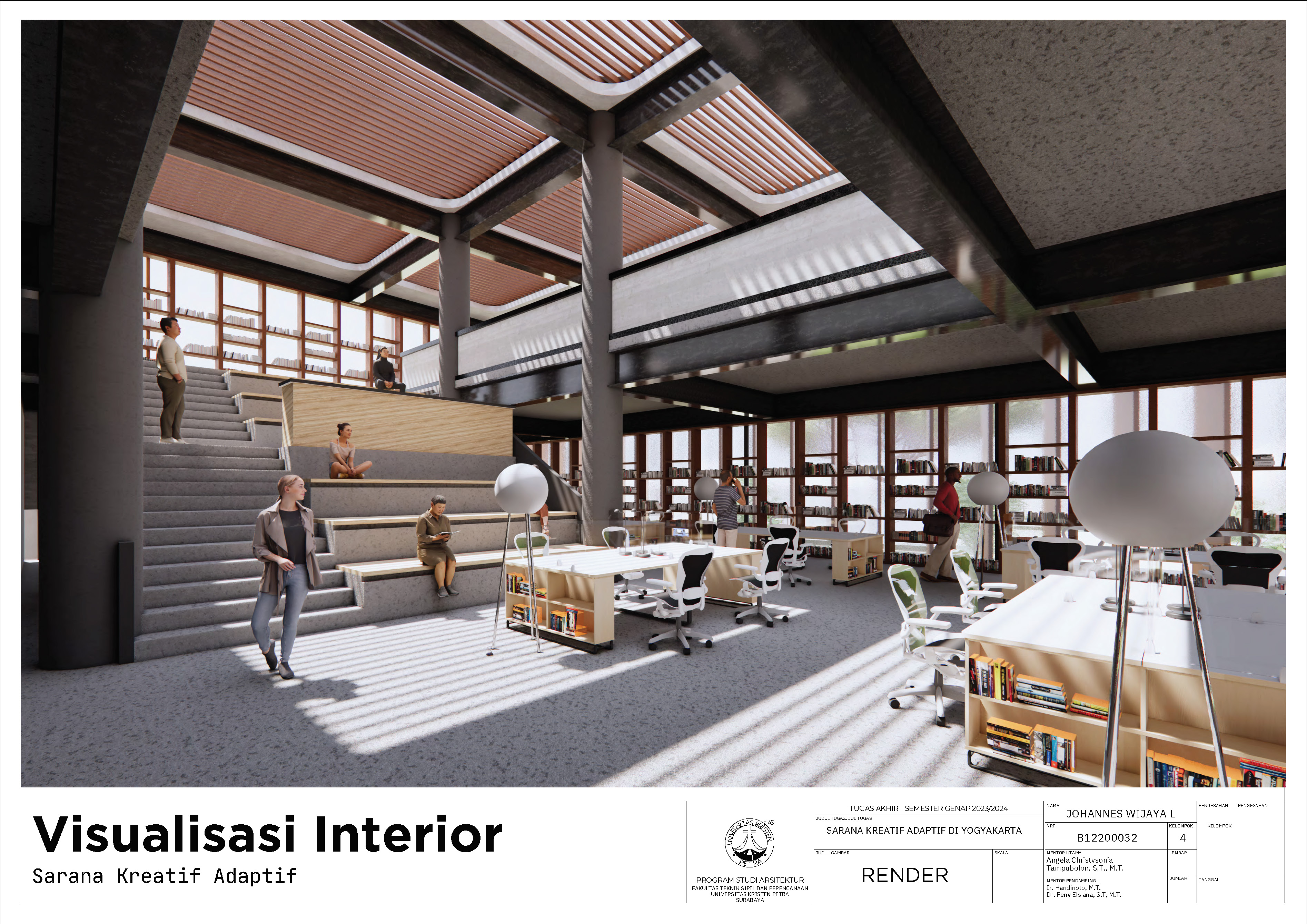 Sarana Kreatif Adaptif di Yogyakarta merupakan perancangan sebuah sarana kerja kreatif yang berfungsi bukan hanya sebagai tempat kerja, tetapi juga sebagai simpul kreatif yang diharapkan dapat menggairahkan kaum muda dan pekerja kreatif di Yogyakarta untuk berkarya, berdaya, dan saling berkolaborasi, terutama dalam mengandalkan daya cipta dan daya pikirannya sebagai Sumber Daya Manusia yang berkualitas. Desain ini memastikan bahwa bangunan tidak hanya menjadi tempat fungsional, tetapi juga pusat seni yang hidup dan terus beradaptasi seiring waktu, mencerminkan kehidupan dan kreativitas penggunanya. Yogyakarta berpotensi menjadi tempat sumber daya cipta dan kreativitas baik dari masyarakat hingga anak mudanya karena potensi tersebut terbentang mulai dari sumber daya manusia hingga kultur kreativitas yang melekat pada kota ini. Hal itu sejalan dengan bahasan ekonomi kreatif perlu mencakup pertimbangan terhadap seluruh ekosistemnya, di mana terdapat simpul kreatif sebagai salah satu elemennya. Metode pendekatan yang dipilih adalah pendekatan spasial, karena sarana kreatif yang dirancang untuk menyediakan fasilitas dan ruang yang lengkap dan fleksibel di mana ruang yang ada dapat beradaptasi sesuai dengan berbagai aktivitas, seperti bekerja, berpikir, berkolaborasi, dan memamerkan karya sesuai pada kebutuhan dari pekerjaan dari setiap subsektornya. Hasil perancangan merupakan suatu sarana kreatif dengan ruang dan zoning yang mengikuti proses berpikir kreatif serta fleksibel dan dapat beradaptasi dengan kebutuhan penggunanya, sarana ini dapat memperkenalkan setiap subsektor ekonomi kreatif yang ada di dalamnya tanpa mengganggu pekerja kreatif yang sedang bekerja.