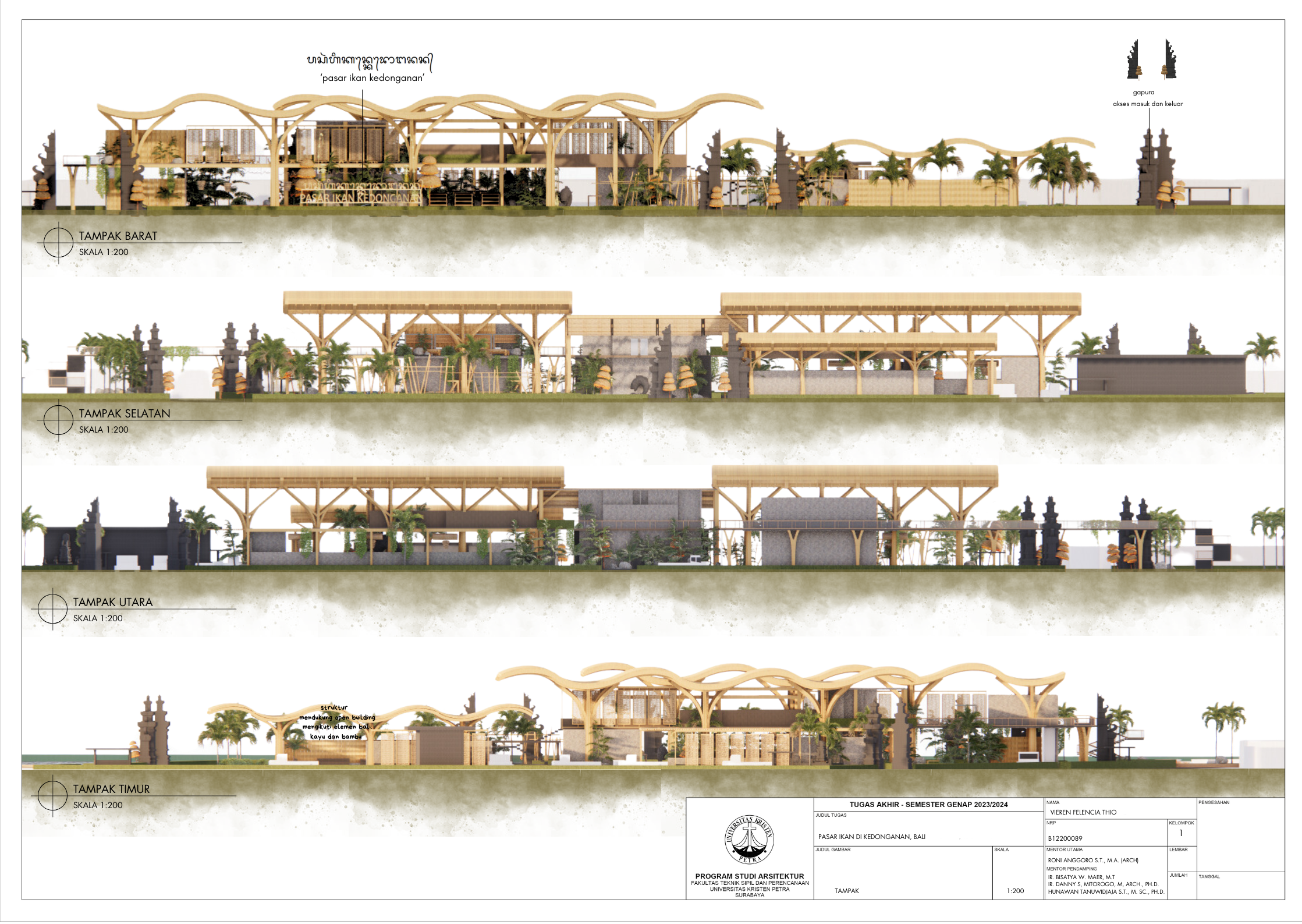 Pasar ikan Kedonganan merupakan salah satu pusat perolehan hasil panen laut oleh nelayan yang merupakan elemen penting bagi penyediaan pangan untuk masyarakat. Kedonganan terkenal dengan makanan lautnya dan merupakan salah satu pusat kuliner makanan laut terbesar di Bali. Kedonganan memegang peran penting bagi perekonomian pulau Bali. Banyak wisatawan lokal maupun asing mengunjungi pasar ikan di Kedonganan. Tetapi area tersebut merupakan pasar ikan yang tradisional dan tergolong kumuh, sehingga tempat tersebut kerap memiliki masalah dan tantangan terutama dalam segi fasilitasnya yang kurang memadai dan telah berusia lama terutama dari segi kenyamanan bangunan, pada sirkulasi, baik bangunan maupun penghawaannya. Mengingat fungsi utama adalah pasar, di mana akan terdapat pengunjung dalam jumlah banyak dalam suatu ruang. Masalah seperti aksesbilitas dan penataan massa yang buruk sangat memengaruhi kenyamanan. Karena itu, untuk mendukung dan mengembangkan area pasar ikan di Kedonganan, dilakukan perencanaan perancangan fasilitas pasar ikan yang lebih modern yang akan berdampak baik. Dengan perencanaan desain pendekatan sistem sirkulasi, fasilitas dirancang sesuai dengan kebutuhan berdasarkan analisa fungsi ruang, tapak, dan pengguna bangunan. Fasilitas akan mencakup pasar ikan itu sendiri, pasar pelelangan ikan, area sortir dan distribusi ikan, serta jasa memasak ikan dan restoran.