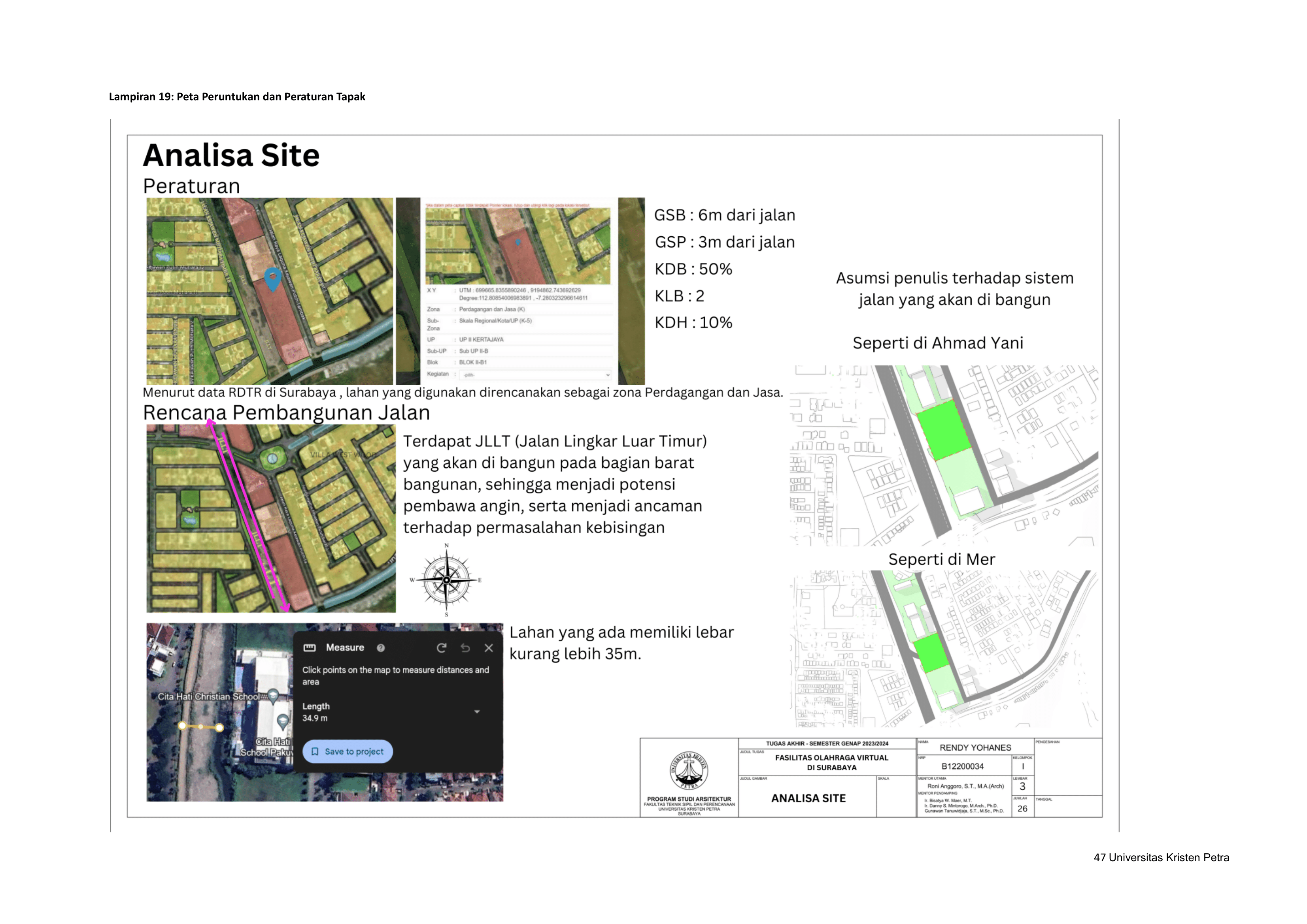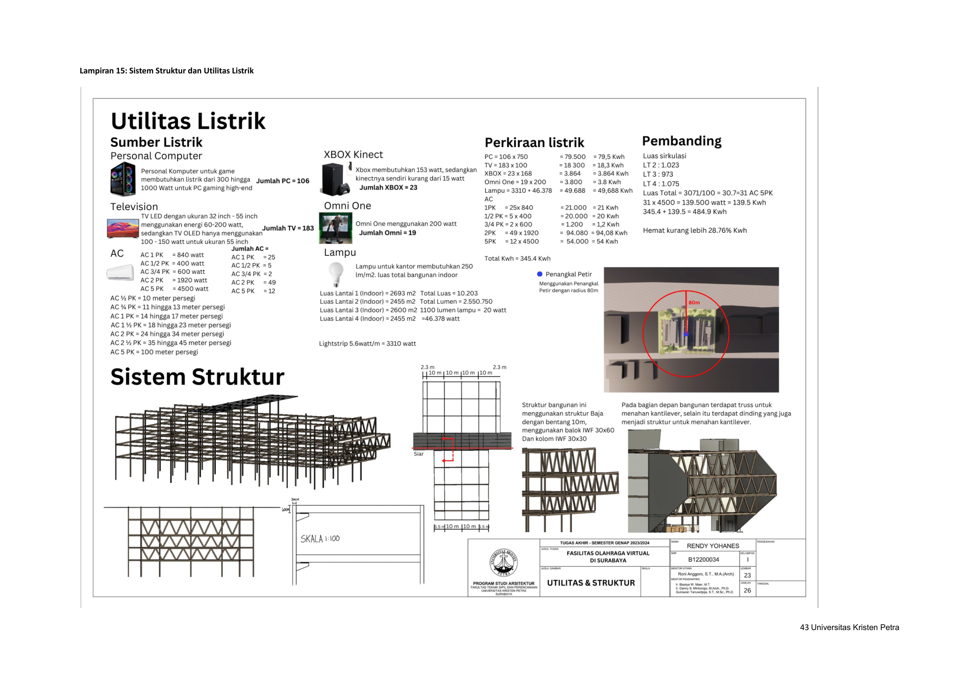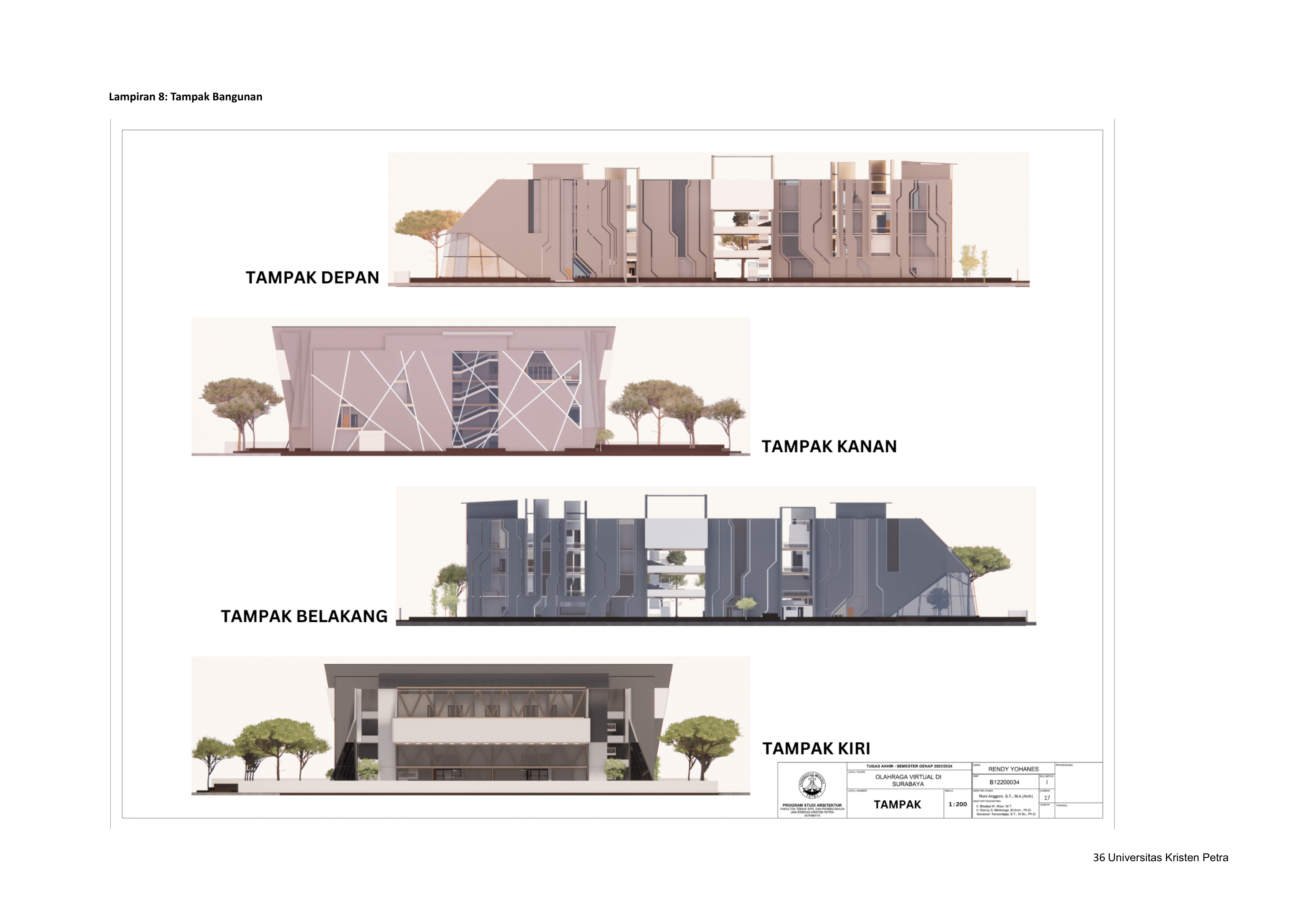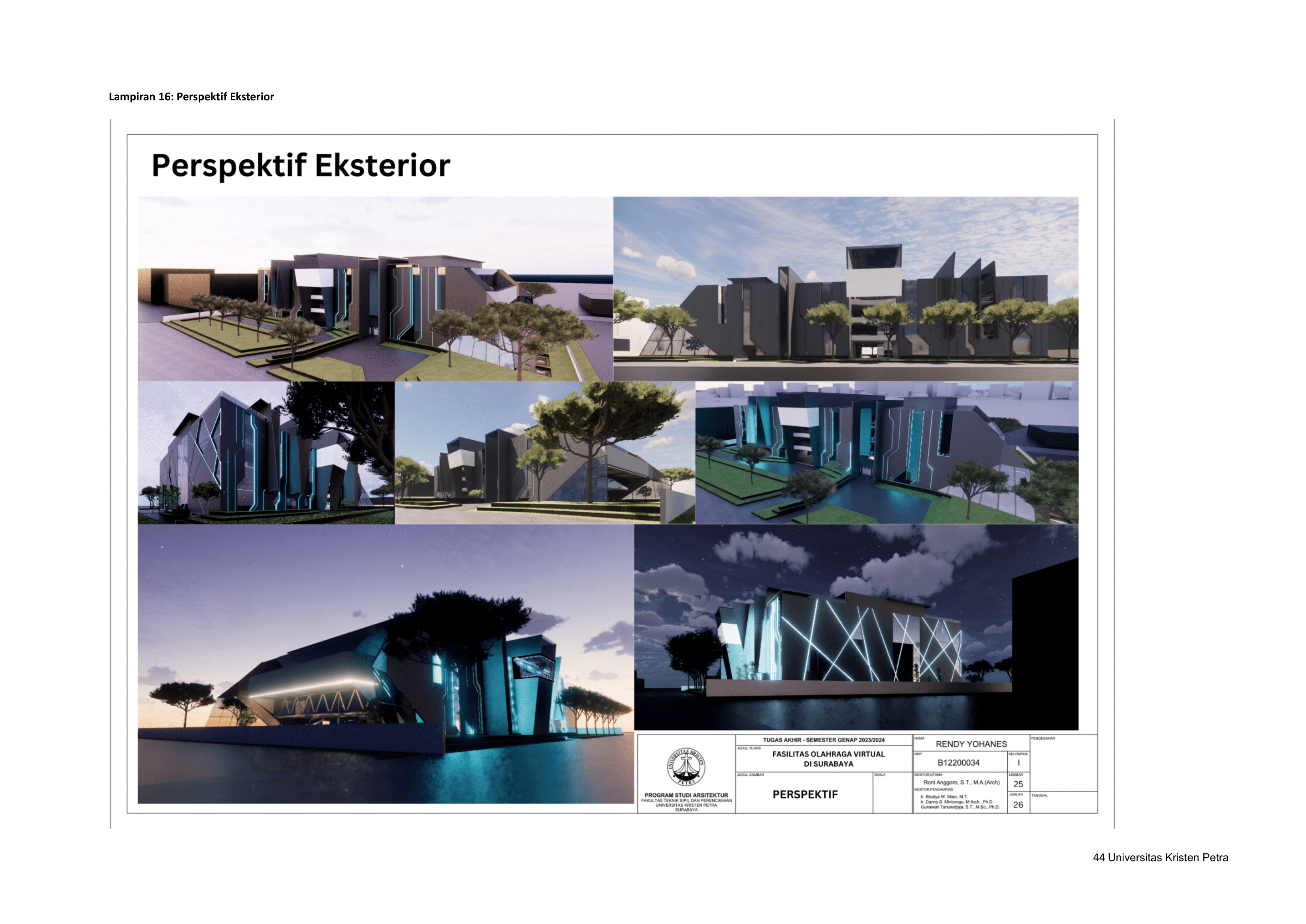 Perkembangan digital sekarang semakin berkembang, selain di bidang informasi, dunia digital juga semakin berkembang pada bidang permainan digital. Permainan digital seperti permainan komputer dan gadget sekarang sudah mulai menyentuh titik teratas dalam arti sudah susah untuk dikembangkan lagi dalam sisi cerita dan grafik dari permainan itu. Di sisi lain, digital pada bidang permainan sekarang sedang mengembangkan permainan dengan mendeteksi gerakan manusia yang akan terbaca oleh permainan tersebut, sehingga memungkinkan manusia untuk bermain sambil melakukan aktifitas fisik. Fasilitas Olahraga Virtual ini dibangun untuk meningkatkan aktivitas fisik masyarakat Surabaya, karena datanya sendiri menunjukkan bahwa orang di Indonesia memiliki standar aktivitas fisik yang rendah. Dengan adanya fasilitas ini, diharapkan tingkat aktivitas fisik masyarakat bisa meningkat dan menghasilkan pengalaman baru dalam bermain game yang sekarang bisa bersamaan dilakukan dengan berolahraga. Tentu dengan menggunakan teknologi yang cukup berkembang ini, fasilitas ini mendapatkan tantangan baru mengenai kebutuhan energi listrik yang cukup besar, sehingga fasilitas ini memiliki pendekatan menggunakan energi sesedikit mungkin, dan mengandalkan teknologi yang dapat menghasilkan energi khususnya listrik. Strategi yang digunakan kebanyakan pemanfaatan udara alami, dan pencahayaan alami dengan memanfaatkan kipas serta pembagian ruang yang menggunakan udara alami dan menggunakan udara buatan.