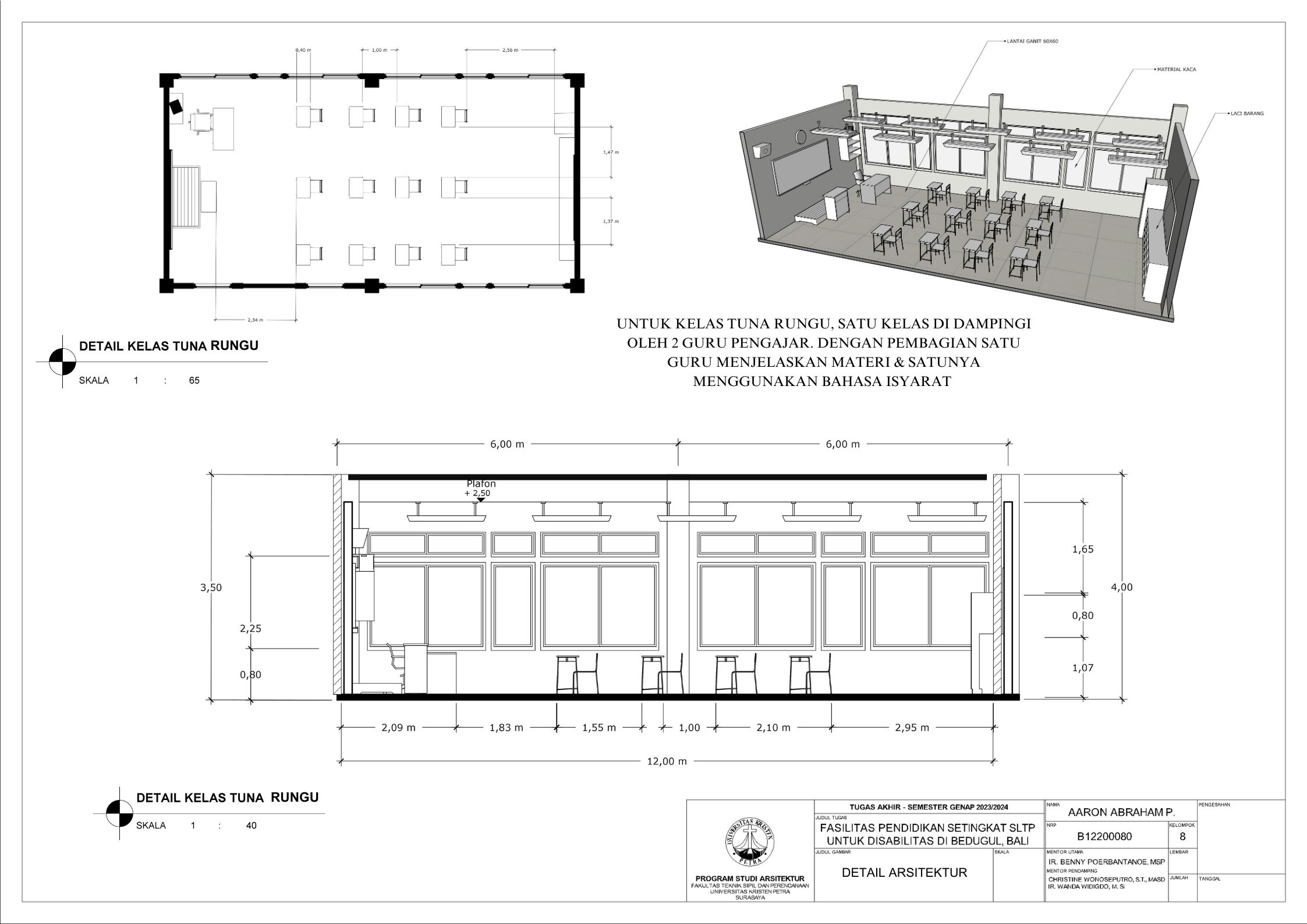 Sekolah disabilitas adalah sekolah yang menyediakan sarana pendidikan bagi penyandang disabilitas agar penyandang disabilitas memiliki kesempatan pendidikan yang sama dengan non-disabilitas. Sekolah disabilitas yang dirancang adalah sekolah tingkat SMP atau SLTP, yang memiliki 3 tingkat kelas, yaitu kelas 1, kelas 2, dan kelas 3. Setiap kelas terbagi menjadi 3 ketunaan yang didalami yaitu tuna daksa, tuna rungu, dan tuna netra, dengan kebutuhan yang berbeda. Tuna daksa yang memerlukan desain yang dapat diakses setiap ruangannya dengan desain khusus seperti ramp yang sesuai dengan standar, tuna netra dengan guide path yang memadai, dan tuna rungu dengan desain kelas yang kedap suara agar siswa dapat berkonsentrasi dengan maksimal. Dengan adanya kebutuhan khusus masing-masing ketunaan, maka harus memperdalami perilaku siswa. Maka dari itu pendekatan yang digunakan adalah metode pendekatan perilaku disabilitas agar dapat menciptakan sebuah sekolah yang dapat menyesuaikan perilaku dan sesuai dengan kebutuhan siswa disabilitas. Sekolah yang dirancang sesuai dengan perilaku siswa dapat melatih kemandirian, pemberdayaan, dan integrasi siswa dalam masyarakat.