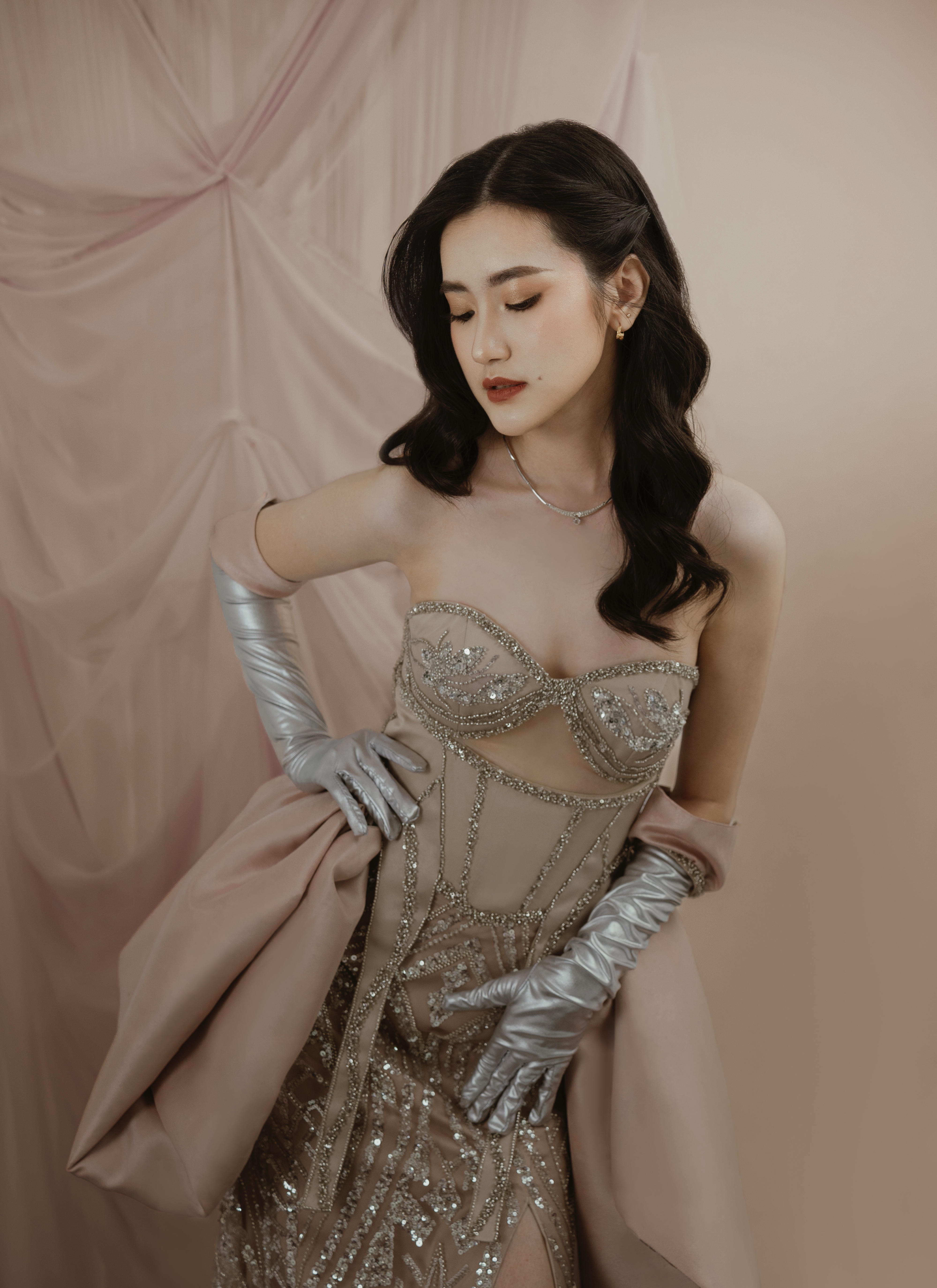 Industri hiburan yang semakin berkembang di Indonesia meningkatkan kebutuhan akan pakaian yang unik bagi publik figur. Pakaian menjadi elemen krusial dalam penampilan mereka, di mana semakin unik dan tidak biasa busana yang dipilih, semakin besar juga sorotan terhadap eksistensi mereka. Namun, dalam kenyataannya, didapati bahwa kurangnya pilihan busana existing yang sesuai dengan standar yang diinginkan untuk acara-acara industri hiburan, sehingga seringkali publik figur atau stylist yang bertanggung jawab harus melakukan custom busana khusus untuk setiap kesempatan. Dalam menanggapi kebutuhan ini, perancang melakukan inovasi dengan menciptakan gaun rekayasa yang unik dan elegan, yang dilengkapi dengan sarung tangan dengan desain yang dapat menampilkan dua tampilan pula. Metode perancangan yang diterapkan adalah metode design thinking dengan enam tahapan, mulai dari tahap understand hingga tahap test. Proses perancangan ini bertujuan untuk menciptakan gaun couture dengan konsep yang menggabungkan inovasi gaun rekayasa yang unik dan elegan, sesuai dengan permintaan pasar industri hiburan yang terus meningkat. Beberapa bagian dari gaun, seperti bagian pundak dan pinggang, dirancang agar dapat dilepas dan dipasang kembali untuk menghasilkan dua tampilan busana yang berbeda. Transformasi ini diperkuat dengan penggunaan kain tafeta polos untuk tampilan pertama dan kain jacquard bermotif untuk tampilan kedua, menunjukkan perubahan yang dramatis antara dua tampilan tersebut. Selain memberikan kesan unik, perancangan ini juga bertujuan untuk mengurangi masalah penyimpanan busana yang berlebihan. Fokus utama dari proyek perancangan ini adalah pada busana couture dengan menggunakan bahan berkualitas medium-to-high. Hasil akhir dari proyek ini adalah tiga koleksi gaun couture dengan desain gaun rekayasa yang unik dan elegan, yang dilengkapi dengan tiga sarung tangan berdesain ganda sesuai dengan busana utama. Pola visual berstruktur tiga dimensi yang diterapkan pada area tertentu seperti bahu dan pinggang dapat dengan mudah dilepas-pasang, menciptakan transformasi yang mencolok dan menarik perhatian publik. Berdasarkan hasil uji coba, ketiga busana ini telah terbukti sesuai untuk industri hiburan seperti acara red carpet, beauty pageant, dan sweet seventeen. Bahkan, responden menilai bahwa busana semacam ini sangat diminati dalam dunia industri hiburan saat ini.