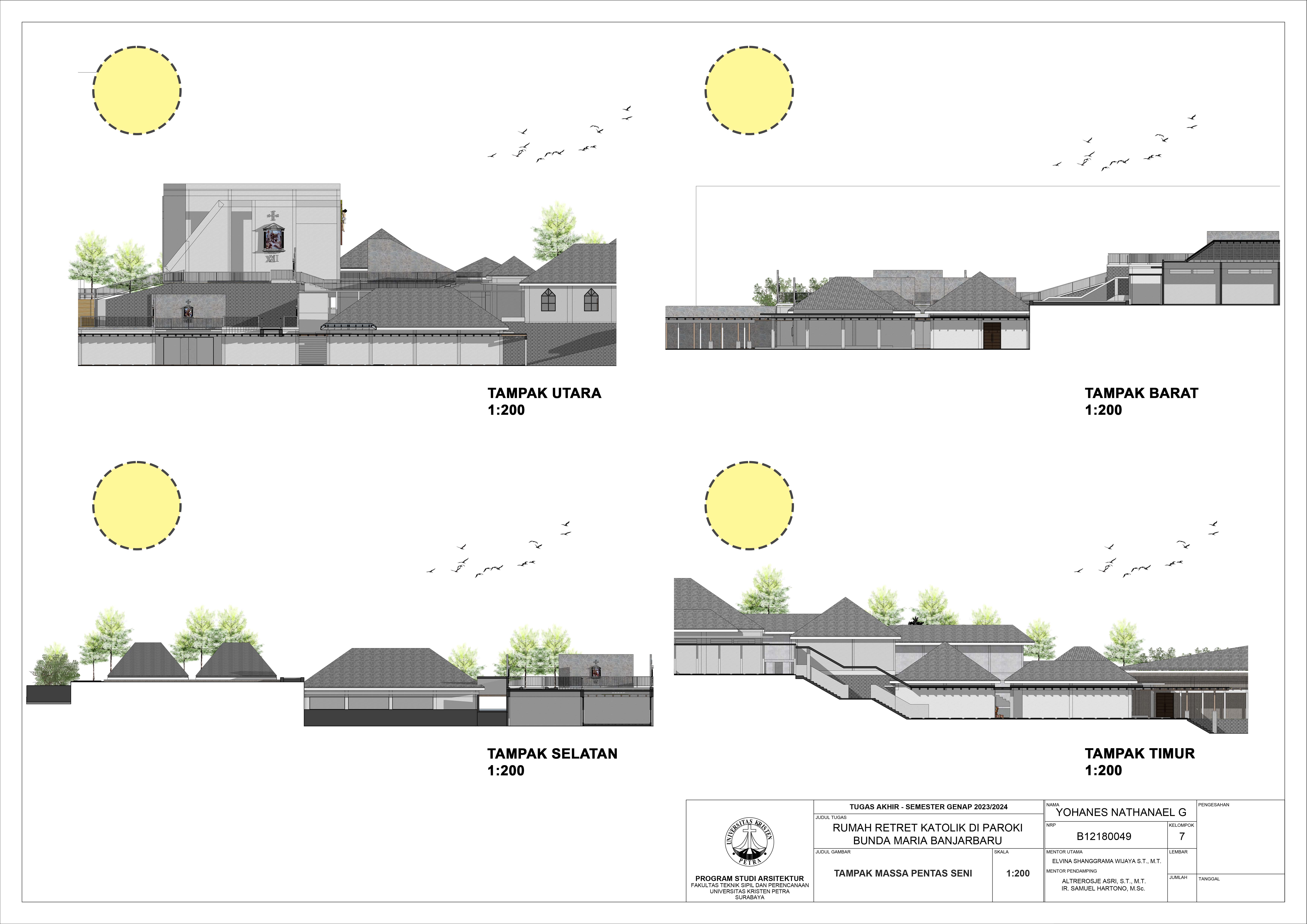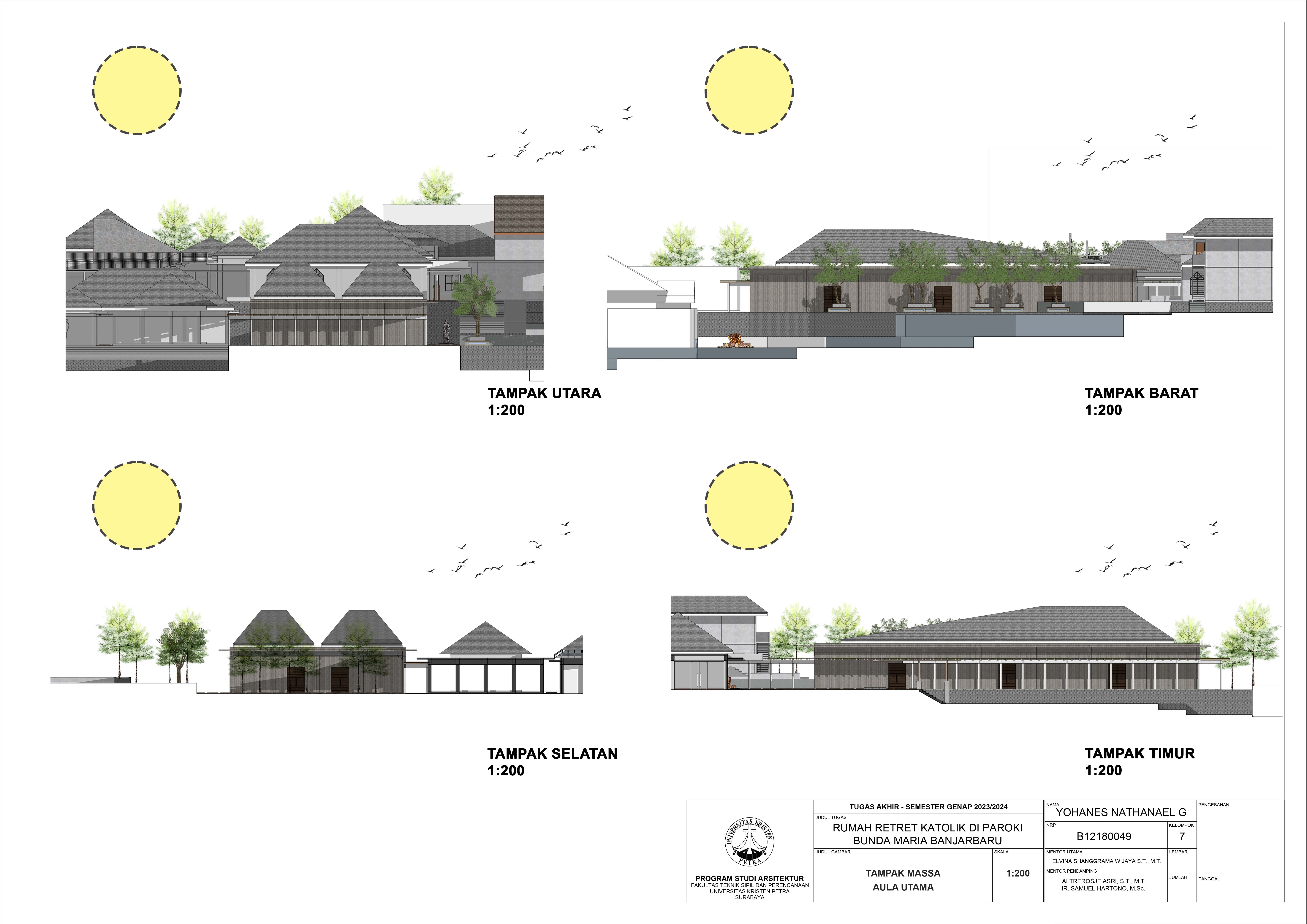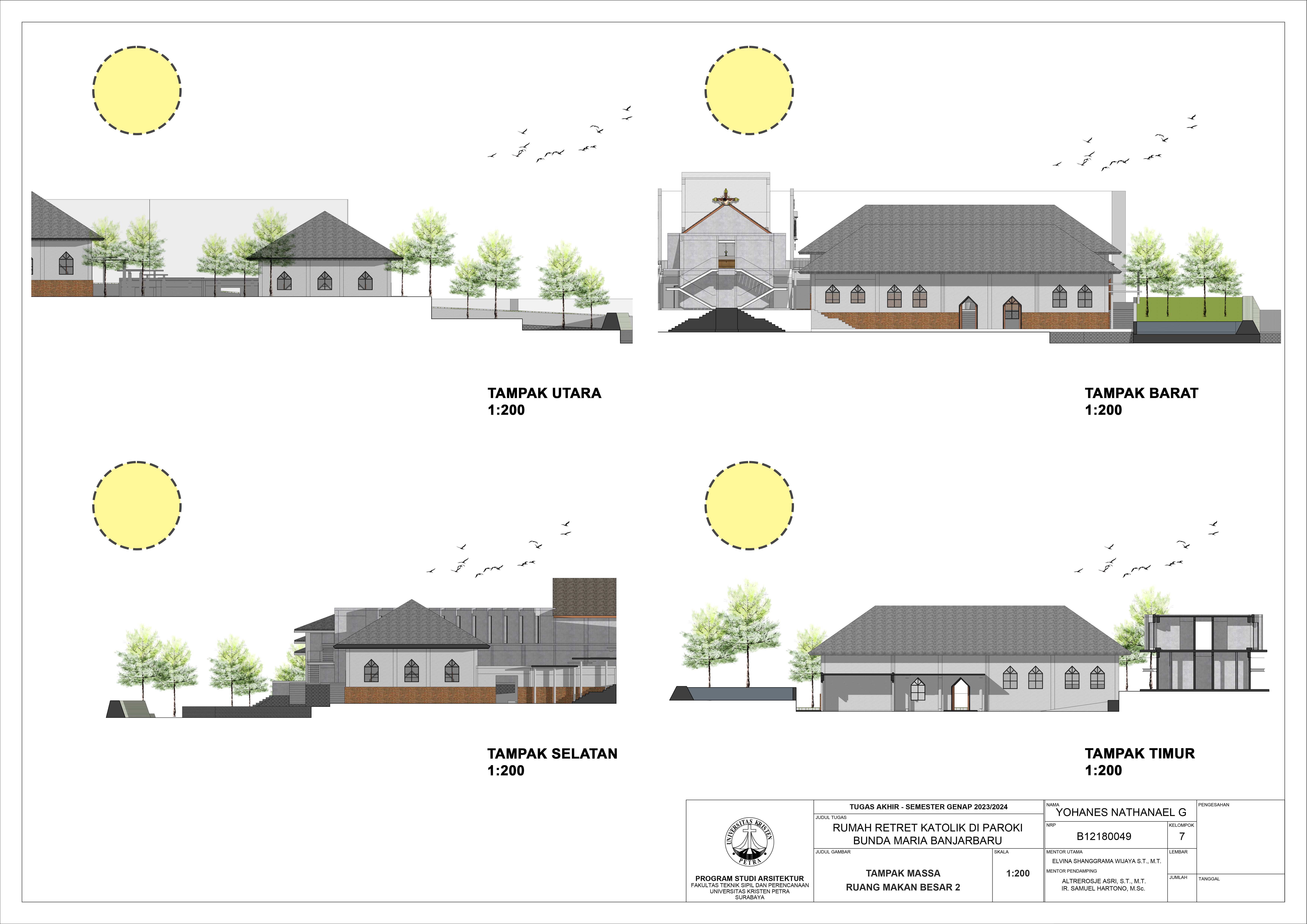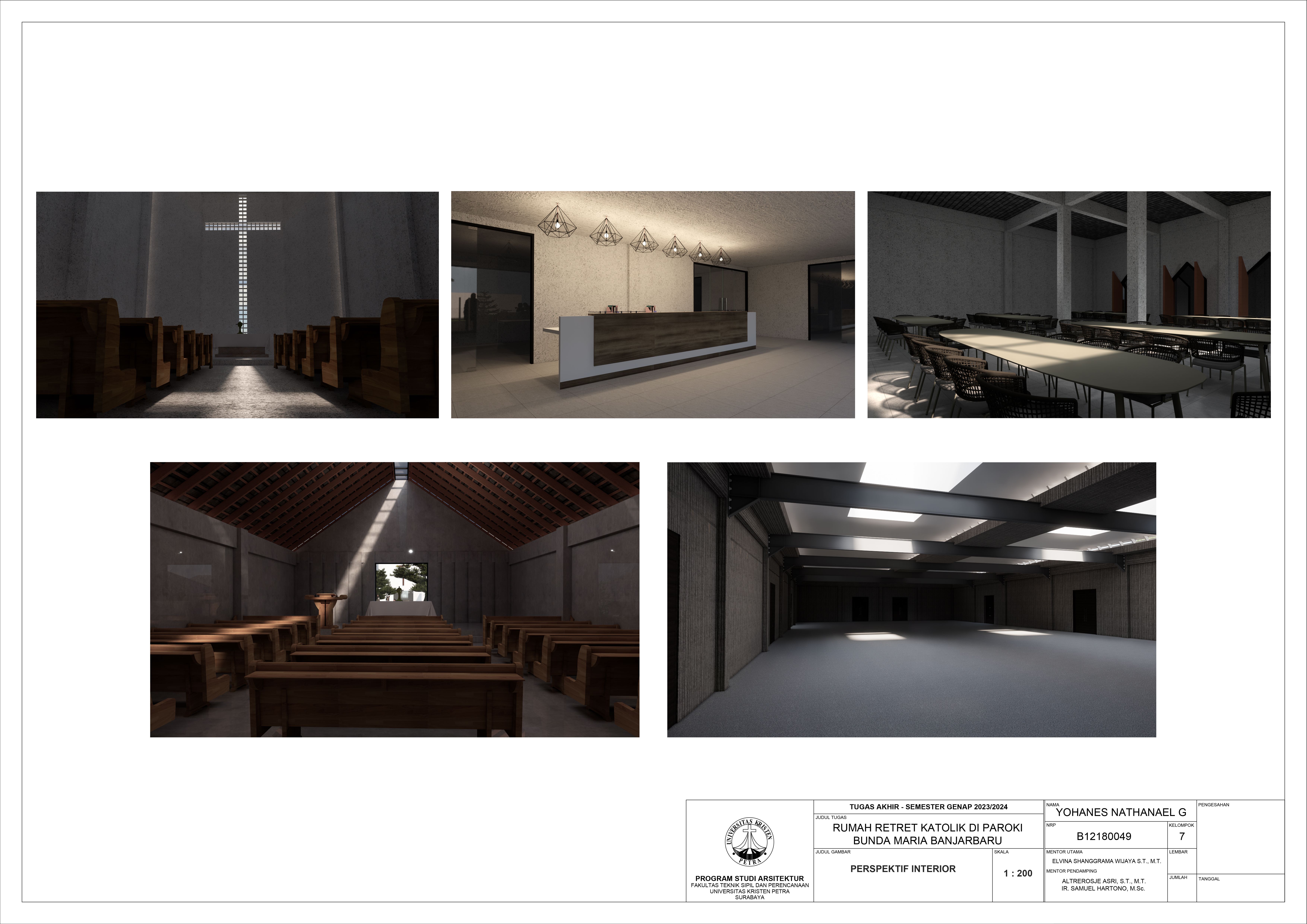 dan juga dihadapkan pada tantangan Ekonomi yang meningkat. Situasi ini menyoroti perlunya ruang-ruang suciuntuk memperdalam iman dan spiritualitas di tengah kesibukan dan tekanan kehidupan modern. Rumah RetretKatolik di Paroki Bunda Maria Banjarbaru adalah sebuah respons kebutuhan mendalam komunitas Katolik diKalimantan Selatan untuk memiliki tempat refleksi spiritual yang tenang dan mendalam. Perancangan RumahRetret ini menawarkan solusi dengan menyediakan fasilitas komprehensif termasuk kapel, ruang doa, aula, areahunian, ruang makan, serta fasilitas pendukung lainnya seperti toilet umum dan area parkir. Desainnyamengutamakan kesakralan dan kenyamanan personal dengan pendekatan holistik melalui penggunaan pencahayaan alami, lanskap yang terintegrasi, dan akustik yang mendukung. Penggunaan material yang dipilih dengan hati-hati dan penempatan strategis elemen religius juga memperkuat konsep desain yang mengutamakan kontemplasi dan interaksi spiritual. Inisiatif ini bertujuan untuk memperbarui dan memodernisasi fasilitas spiritual, yang ditunjukkan dengan transformasi dari Wisma Sikhar yang sudah tua menjadi Rumah Retret modern yang memenuhi kebutuhan spiritual saat ini sambil mempertahankan signifikansi historis dan spiritualnya.